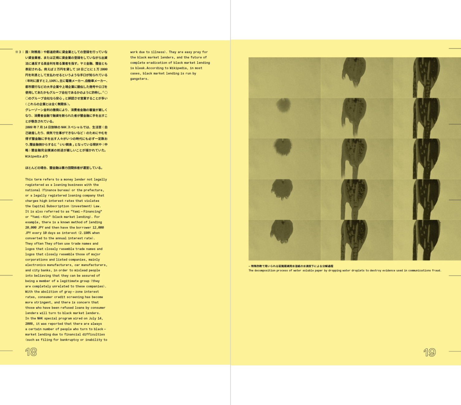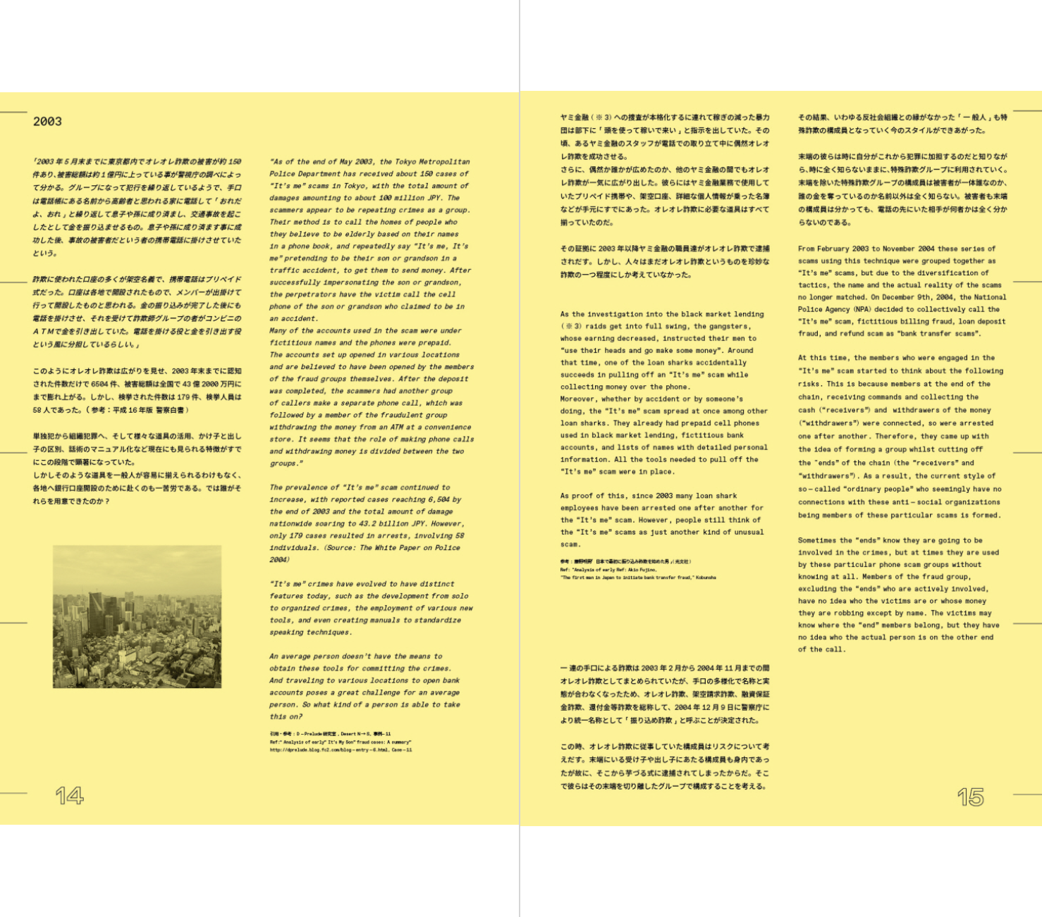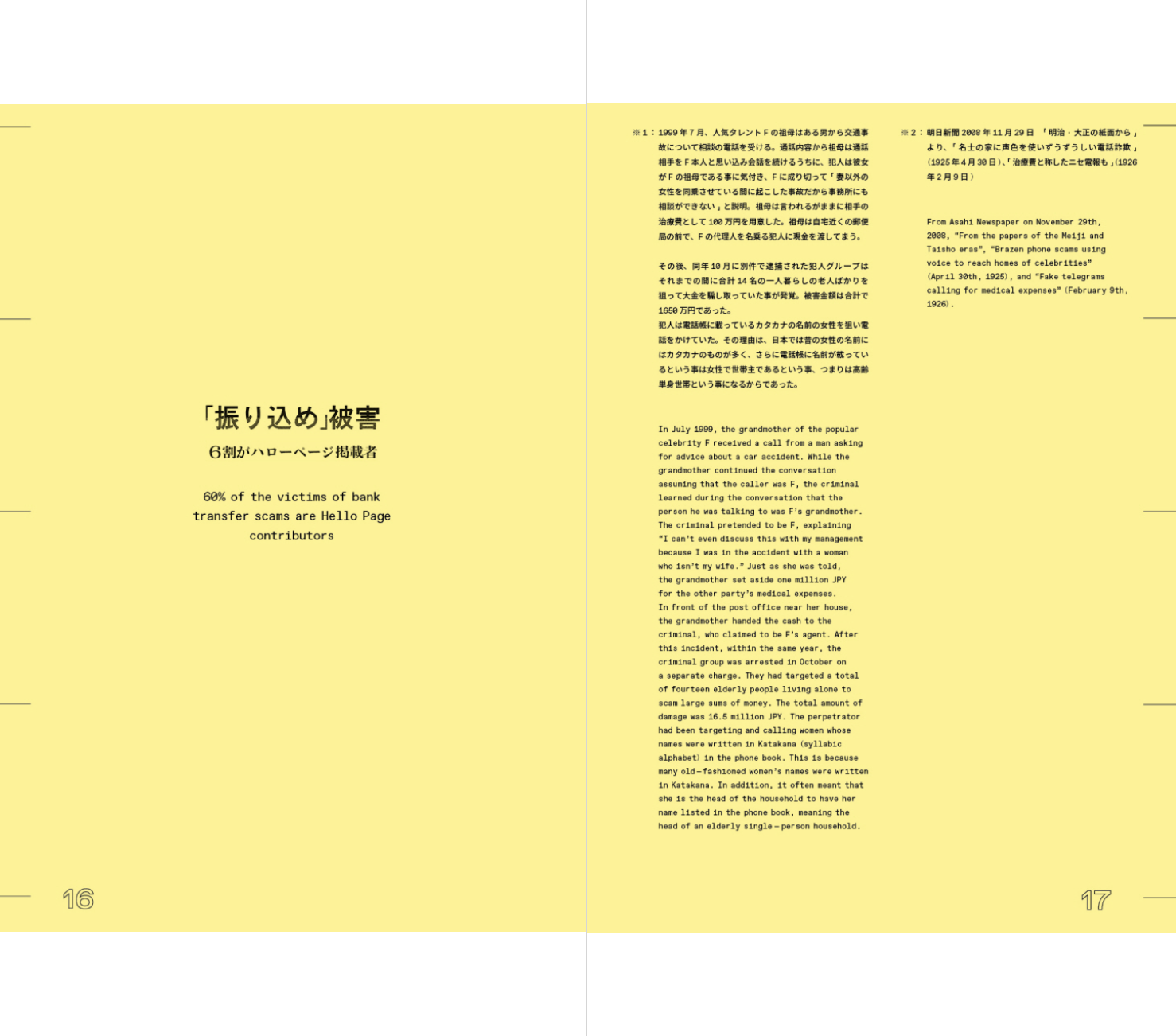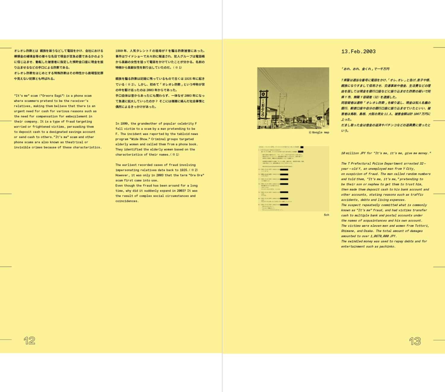 2003년 대중에게 처음 알려진 이 사기 행위는 현재까지도 연간 약 300억 엔에 달하는 피해가 계속 발생하고 있다. 치가 켄지는 어느 날 부모님과 이야기를 나누던 중, 어머니가 범죄의 대상이라는 것을 알게 된다. 이를 계기로 작가는 수많은 보고서와 인터뷰를 읽으며 가해자들의 상황과 심리극을 통해 특수 사기 집단에 대한 모순된 감정을 경험하게 된다. 마치 다큐메터리 촬영을 위해 그 일에 가담하듯, 작가는 은신처로 쓸 수 있는 임대 공간을 이용하고 사기 전화가 오는 곳을 어슬렁거리거나 사기에 필요한 도구를 구입하였다. 또한 어르신들을 만나고, 전화를 하고, ATM에 가서 돈을 인출하는 일련의 행동을 따라 한다. 그가 실제로 범죄를 저지른 것은 아니지만, 사기 집단의 다양한 역할을 직간접적으로 경험하며 자신의 얼굴을 바탕으로 90명의 가상 인물 사진을 만들어냈으며, 결과적으로 이 책에 등장하는 맥락과 사진의 관계는 독자를 거짓말의 공조자로 만들어버린다.
