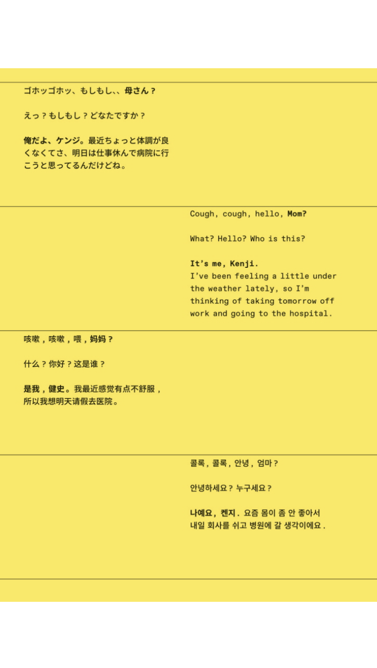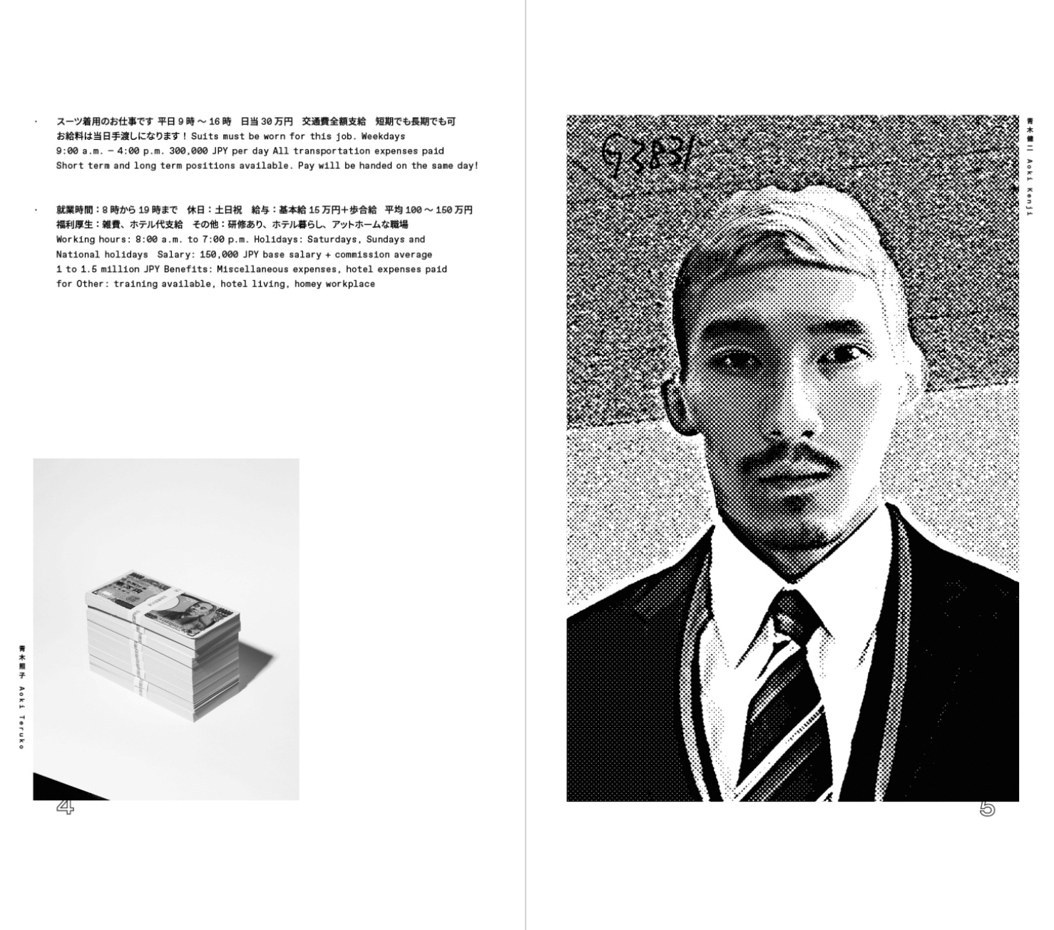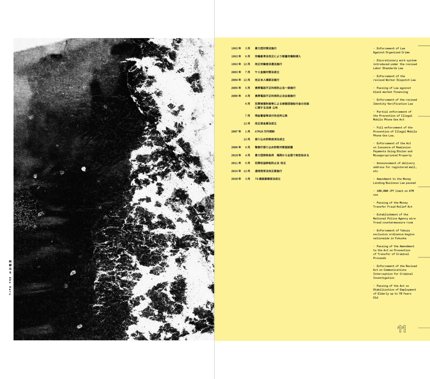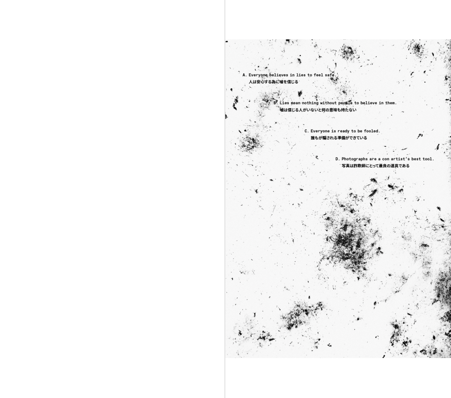 2003년 대중에게 처음 알려진 이 사기 행위는 현재까지도 연간 약 300억 엔에 달하는 피해가 계속 발생하고 있다. 치가 켄지는 어느 날 부모님과 이야기를 나누던 중, 어머니가 범죄의 대상이라는 것을 알게 된다. 이를 계기로 작가는 수많은 보고서와 인터뷰를 읽으며 가해자들의 상황과 심리극을 통해 특수 사기 집단에 대한 모순된 감정을 경험하게 된다. 마치 다큐메터리 촬영을 위해 그 일에 가담하듯, 작가는 은신처로 쓸 수 있는 임대 공간을 이용하고 사기 전화가 오는 곳을 어슬렁거리거나 사기에 필요한 도구를 구입하였다. 또한 어르신들을 만나고, 전화를 하고, ATM에 가서 돈을 인출하는 일련의 행동을 따라 한다. 그가 실제로 범죄를 저지른 것은 아니지만, 사기 집단의 다양한 역할을 직간접적으로 경험하며 자신의 얼굴을 바탕으로 90명의 가상 인물 사진을 만들어냈으며, 결과적으로 이 책에 등장하는 맥락과 사진의 관계는 독자를 거짓말의 공조자로 만들어버린다.