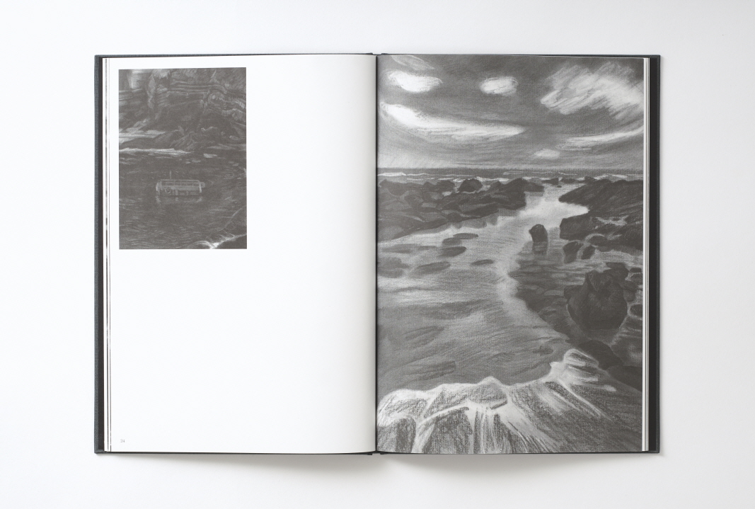 여행날짜에 따른 구분을 위한 4장의 챕터, 23점의 드로잉, 텍스트 1장, 각 드로잉 작품의 캡션을 한 곳으로 모아놓은 1장, 마지막으로 드로잉 속 풍경의 위치를 점으로 하나하나 찍은 위성 지도사진 1장을 모아 책 한권으로 구성했습니다.