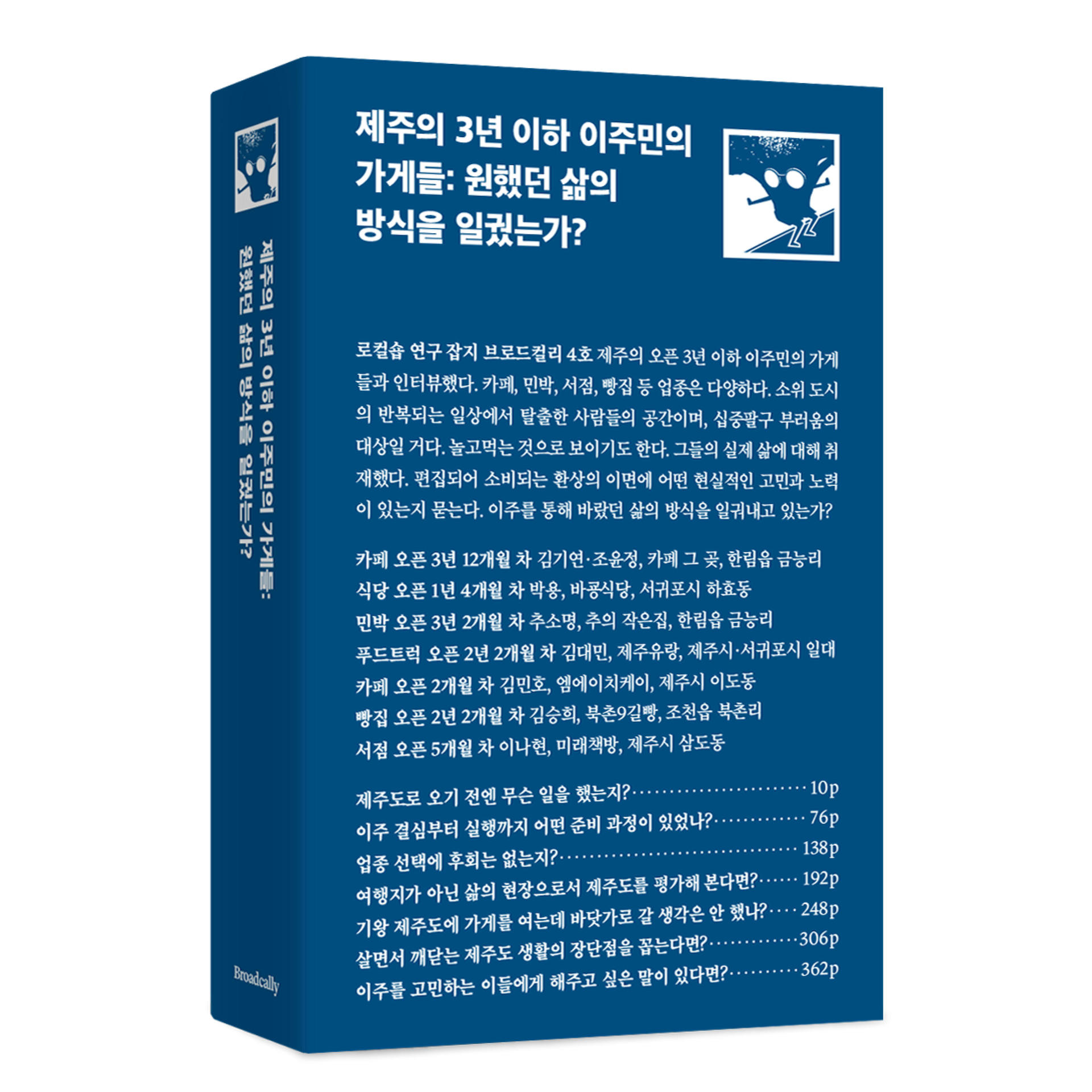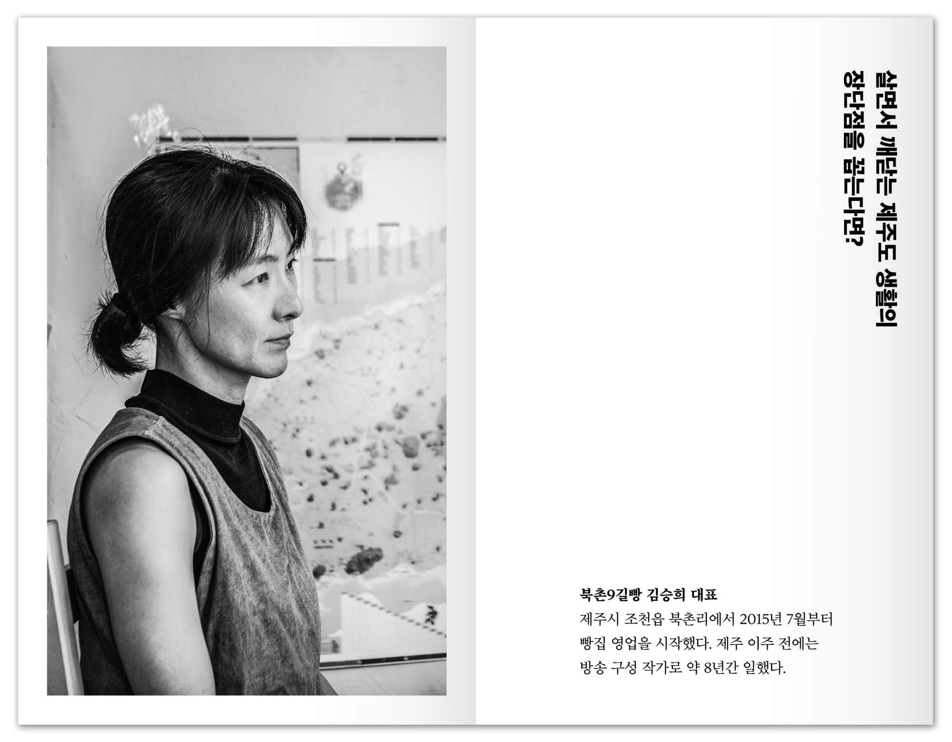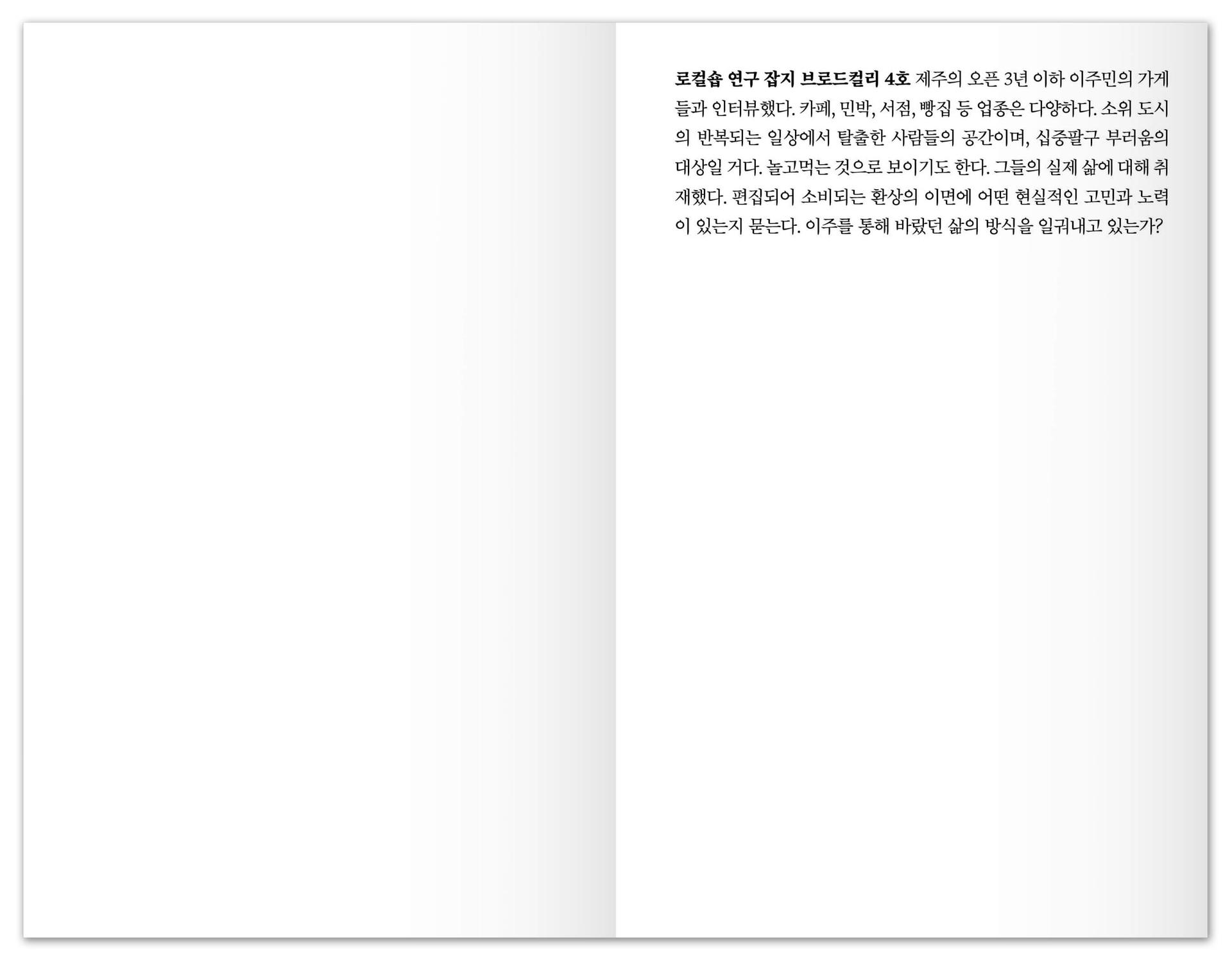 제주의 오픈 3년 이하 이주민의 가게들과 인터뷰했다. 카페, 민박, 서점, 빵집 등 업종은 다양하다. 소위 도시의 반복되는 일상에서 탈출한 사람들의 공간이며, 십중팔구 부러움의 대상일 거다. 놀고먹는 것으로 보이기도 한다. 그들의 실제 삶에 대해 취재했다. 편집되어 소비되는 환상의 이면에 어떤 현실적인 고민과 노력이 있는지 묻는다. 이주를 통해 바랐던 삶의 방식을 일궈내고 있는가?
