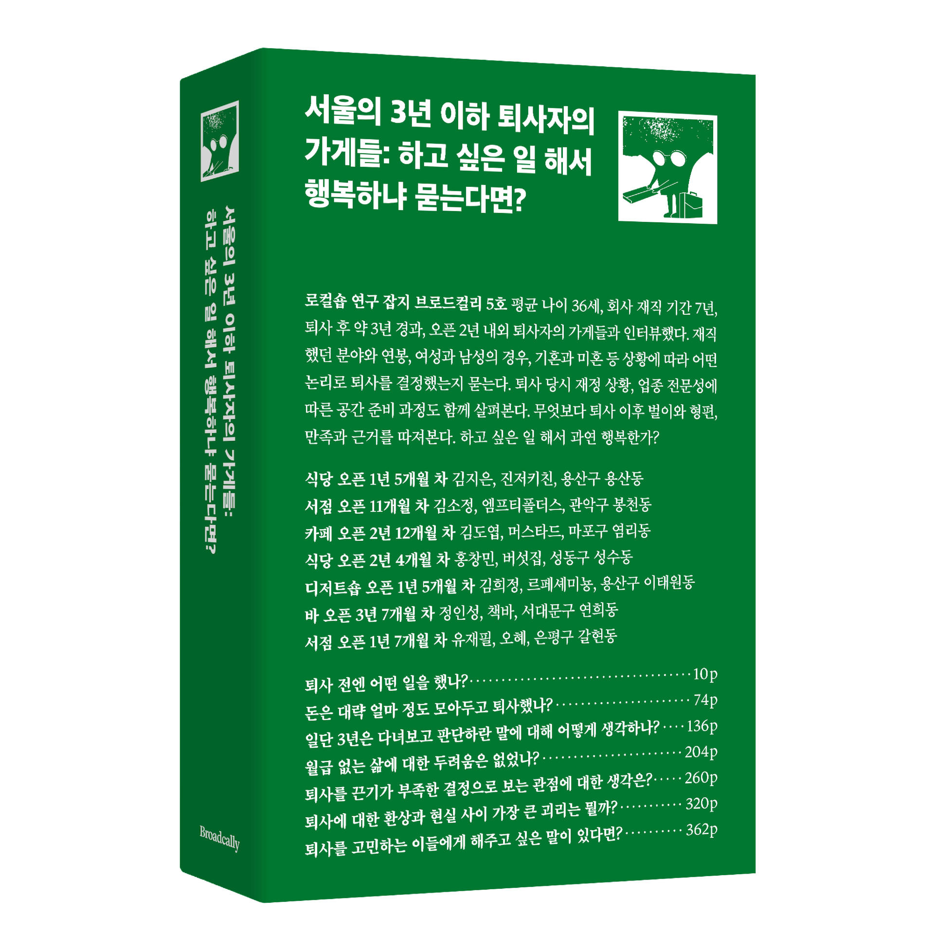 평균 나이 36세, 회사 재직 기간 7년, 퇴사 후 약 3년 경과, 오픈 2년 내외 퇴사자의 가게들과 인터뷰했다. 재직했던 분야와 연봉, 여성과 남성의 경우, 기혼과 미혼 등 상황에 따라 어떤 논리로 퇴사를 결정했는지 묻는다. 퇴사 당시 재정 상황, 업종 전문성에 따른 공간 준비 과정도 함께 살펴본다. 무엇보다 퇴사 이후 벌이와 형편, 만족과 근거를 따져본다. 하고 싶은 일 해서 과연 행복한가?