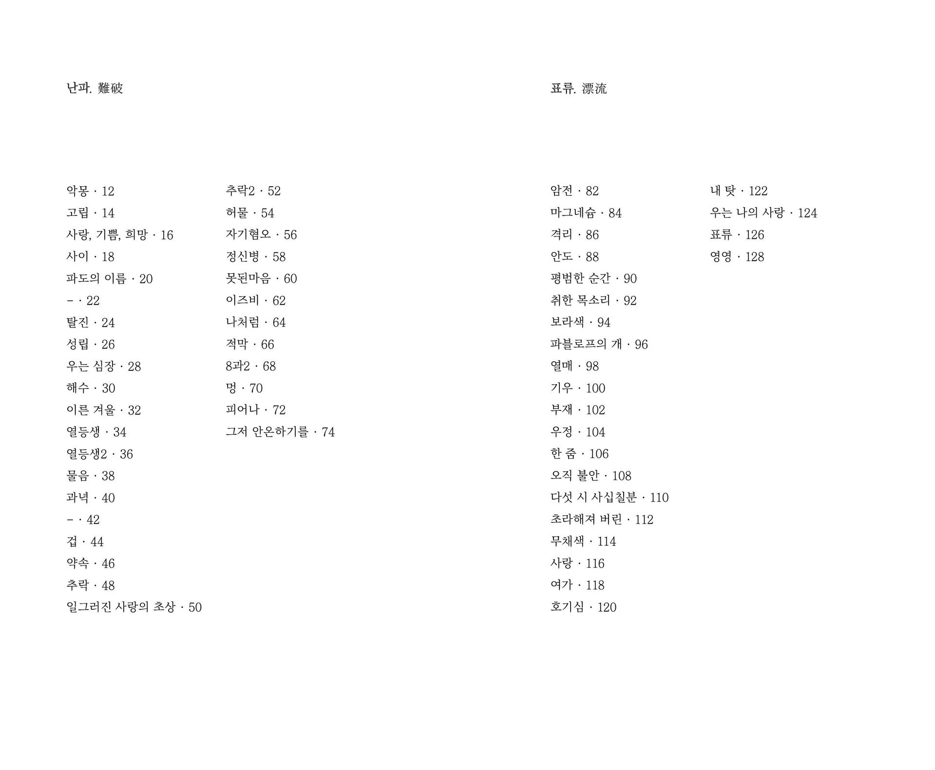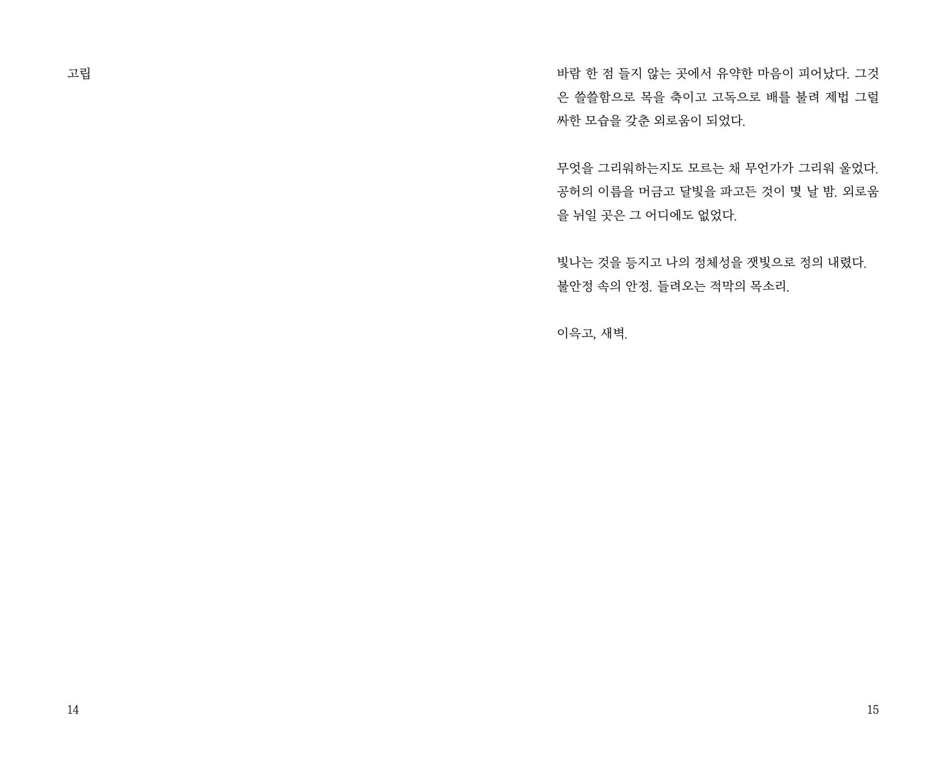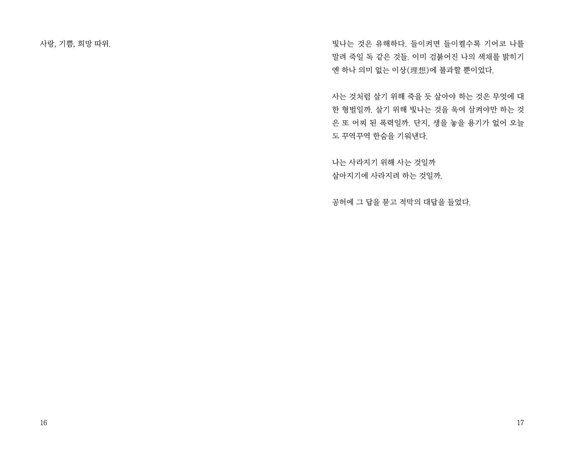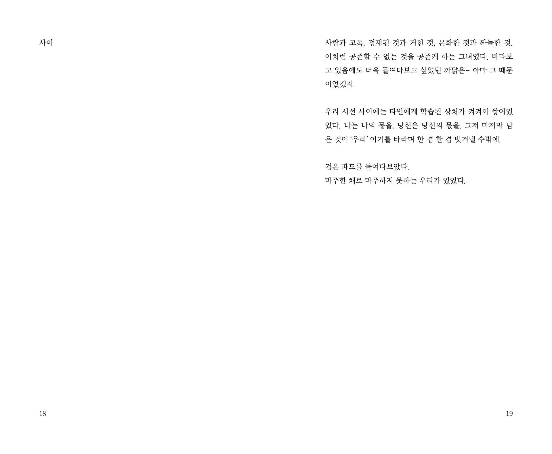 좋아하는 후회로부터 시작된 ‘이렇게 새벽을 표류하다 아침을 맞이하겠지’에는 사랑하고 이별하며 영겁의 불안을 표류하였던 기억의 부산물들이 담겨있습니다.