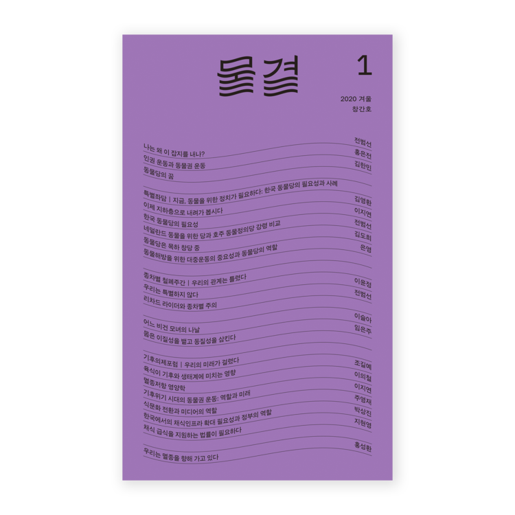 <물결> 창간호는 ‘지금, 동물을 위한 정치가 필요하다’를 주제로 동물당 창당 세미나, 동물권단체 동물해방물결에서 진행된 온라인 동물권 행진, 기후위기비상행동에서 개최한 기후의제포럼을 다뤘다. 이 세가지 운동은 각각 다르지만 주제로 수렴된다. 동물당 창당 세미나와 가장 관련있는 주제지만, ‘인간 동물과 비인간 동물을 차별하는’ 종차별을 끝내기 위해선 동물을 위한 정치가 실현되어야 하고, 기후위기를 해결하기 위해서도 동물을 착취하는 축산업은 철폐되어야 하기 때문이다.