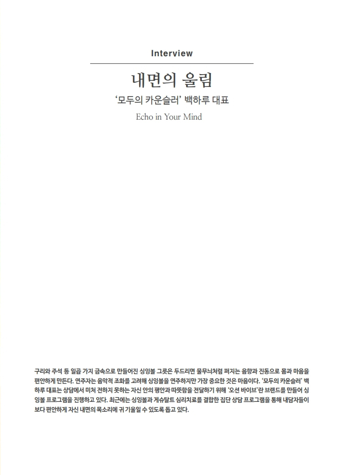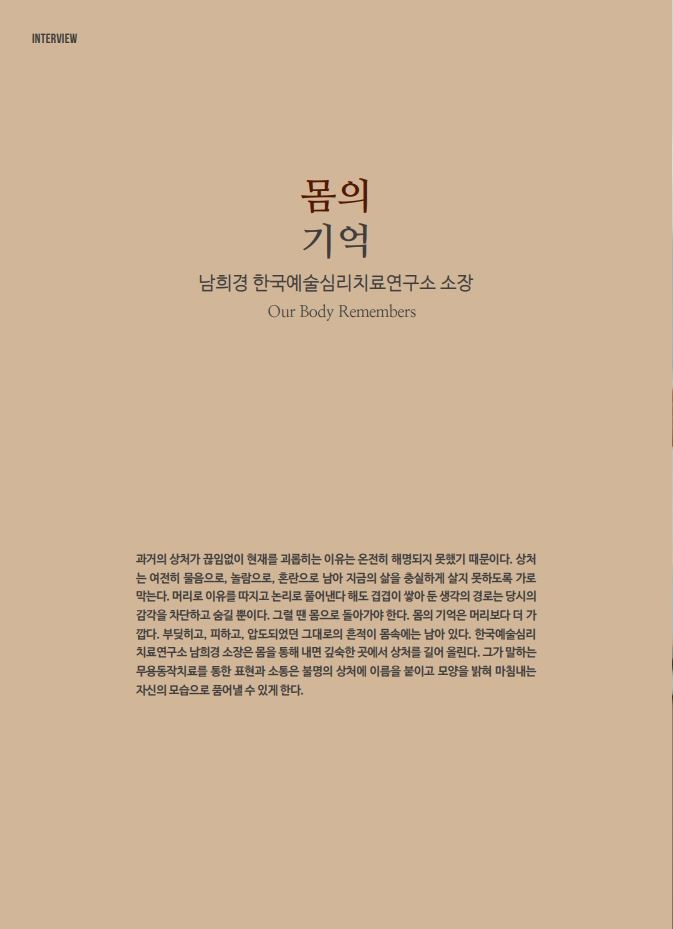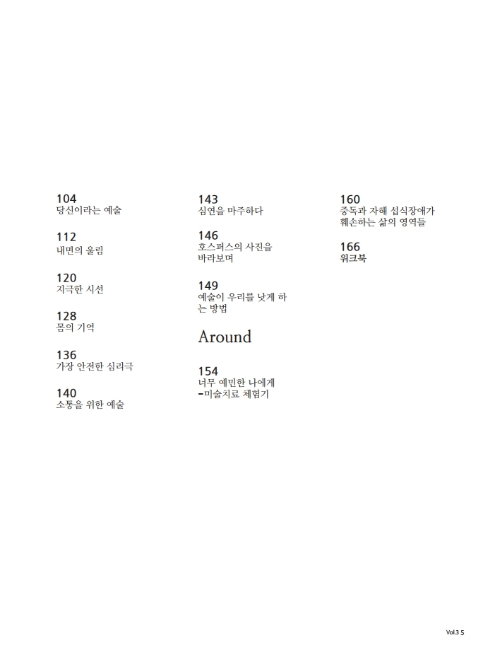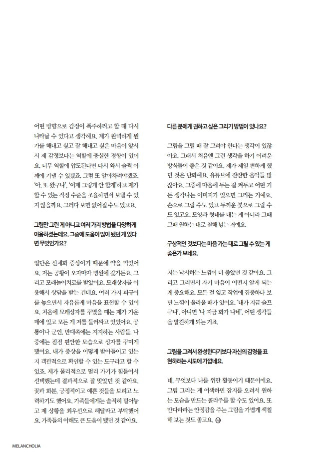 멜랑콜리아 3호 ‘치유하는 예술’에서는 치유하는 도구로서의 예술을 다룹니다. 일기, 시, 에세이, 미술, 영상 등을 통해 스스로의 감정과 마음을 확인하고 치유에 이용하고 있는 사람들을 만났습니다. 또한 문학, 미술, 음악, 무용, 사진, 연극을 통해 치료활동을 하고 있는 여섯 명의 예술치료사와의 인터뷰를 통해 전문 영역으로서의 예술치료에 대한 이야기를 들었습니다. 그 외에 282북스 강미선 대표, 99아트컴퍼니 장혜림 예술감독, 보스토크 박지수 편집장이 ‘치유하는 예술’에 대한 경험과 단상을 나눴습니다.