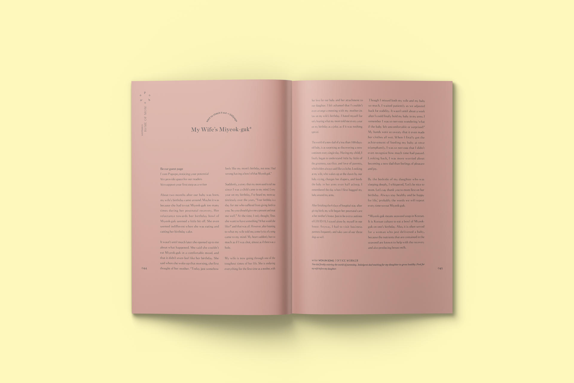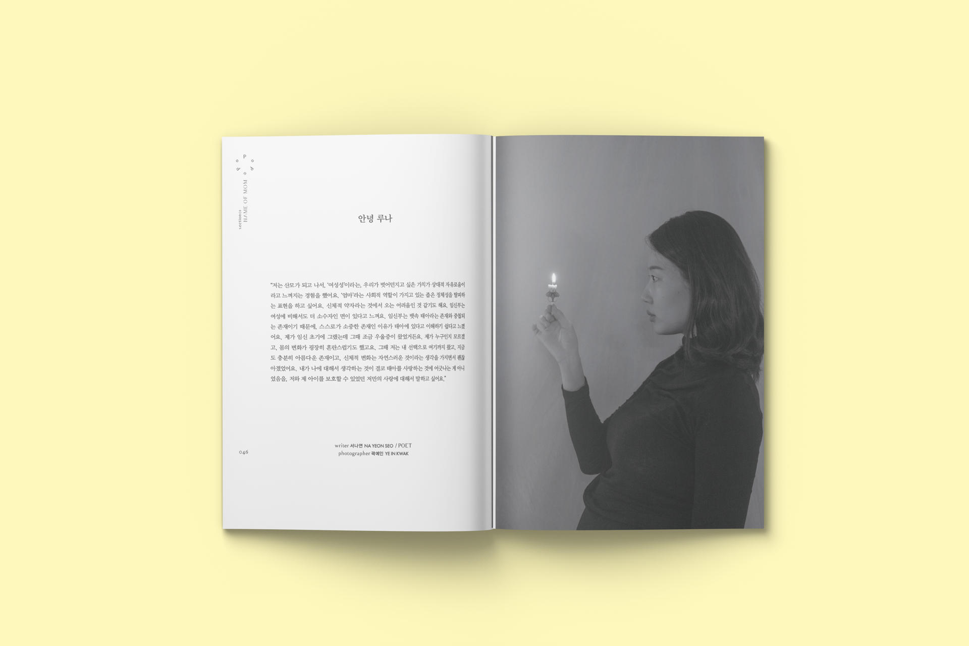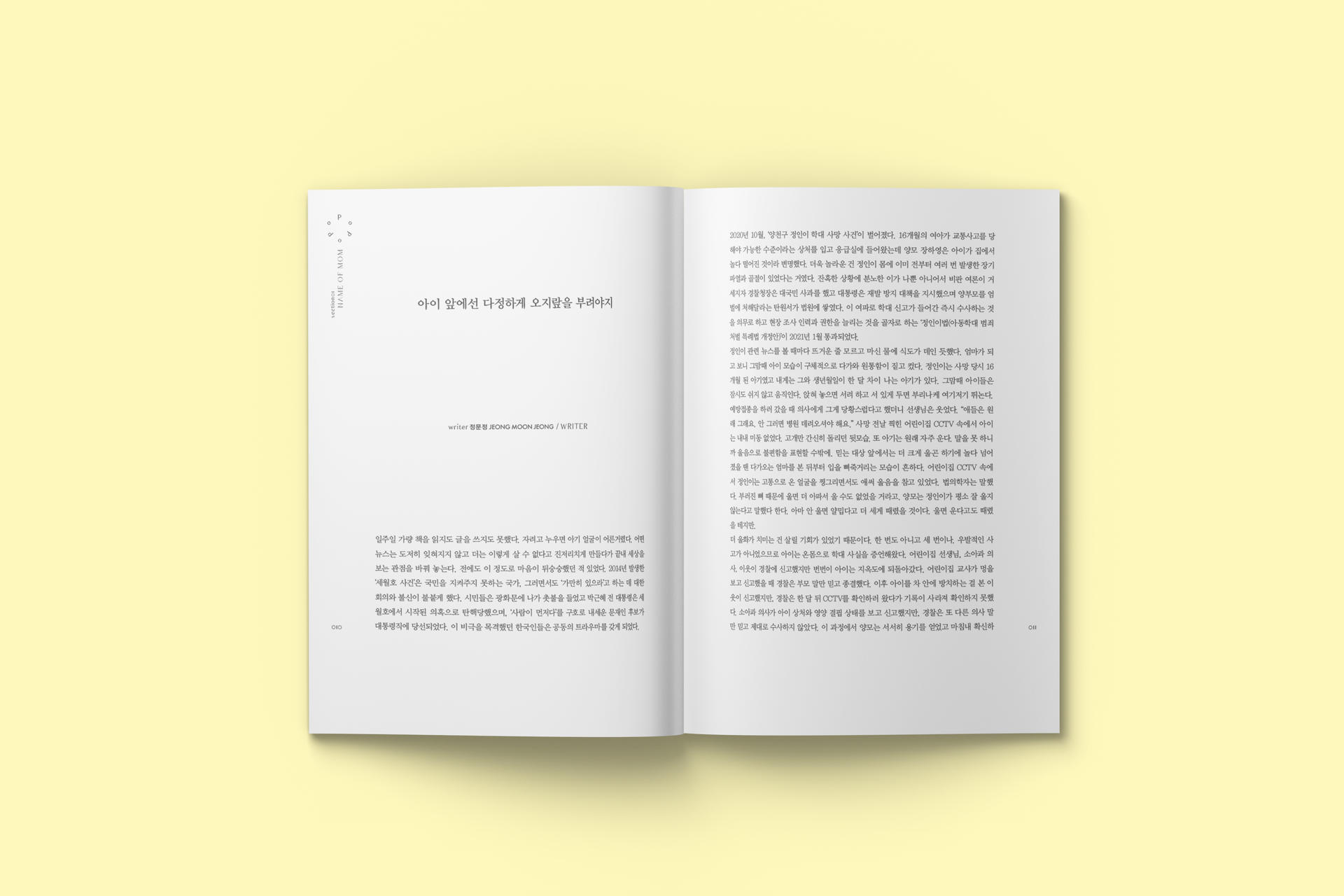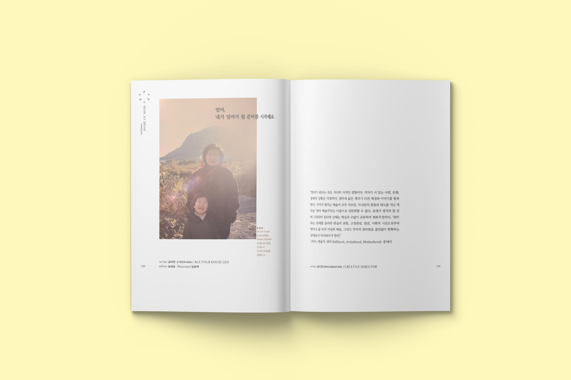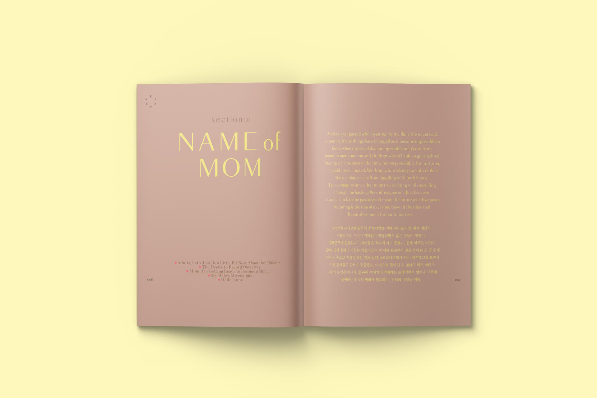 첫 번째 섹션 “NAME OF MOM” 에서는 엄마라는 역할이 하나 추가되었을 뿐인데, 세상이 그들을 대하는, 또 그들이 세상을 바라보는 태도와 관점의 변화를 전지적 관찰자 시점으로 소개 한다. 아동학대에 대해 관습처럼 쌓여 온 무관심을 환기하는 정문정 작가의 ‘아이 앞에선 다정하게 오지랖을 부려야지’로 이번호는 시작한다. 정인이 사건을 돌아보며 무심하게 놓쳐 온 아이들을 향한 관심, 아동학대에 대한 잘못된 편견에 경종을 울리는 메시지를 담았다. ‘우리를 기록하고 싶은 마음’에서는 김다은 작가의 저서 <자아, 예술가, 엄마>에서 <서울의 엄마들>로 이어지는 여정을 통해 예술가-엄마, 엄마됨의 상태와 정체성에 대한 기록을 실었다. 독자에게 기고할 수 있는 지면을 선사하는 ‘Be our guest’ 코너에서는 엄마가 될 준비를 시작하는 어느 딸의 고백과 갓 태어난 딸아이와 아내에게 건네는 남편의 언어를 담았다. 김나연 시인은 ‘안녕 루나’를 통해 산모가 되고 나서 ‘여성성’과 ‘엄마’라는 사회적 역할이 가지고 있는 좁은 정체성을 탈피하는 경험을 사진과 글로 풀어냈다.