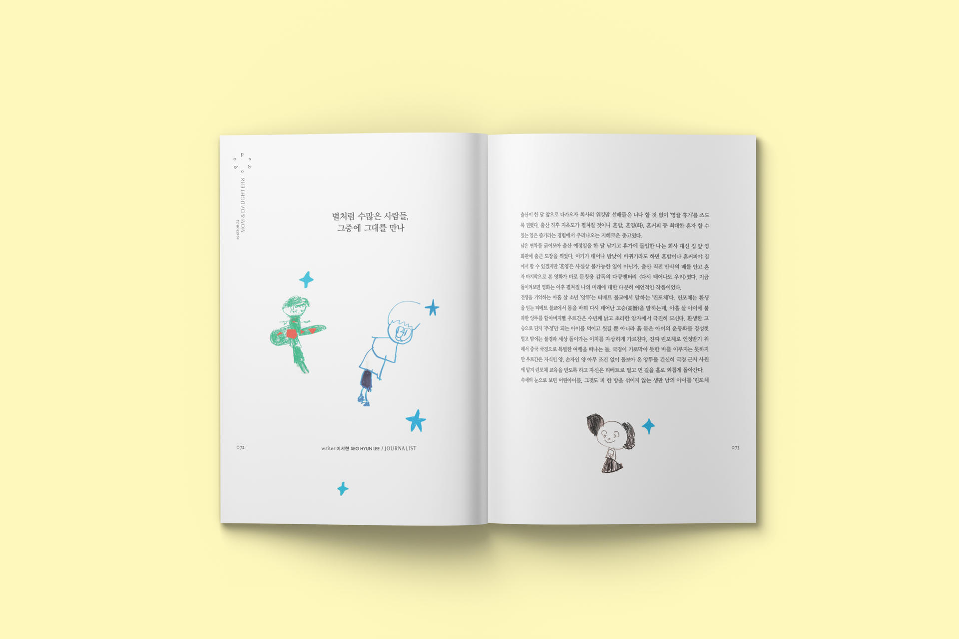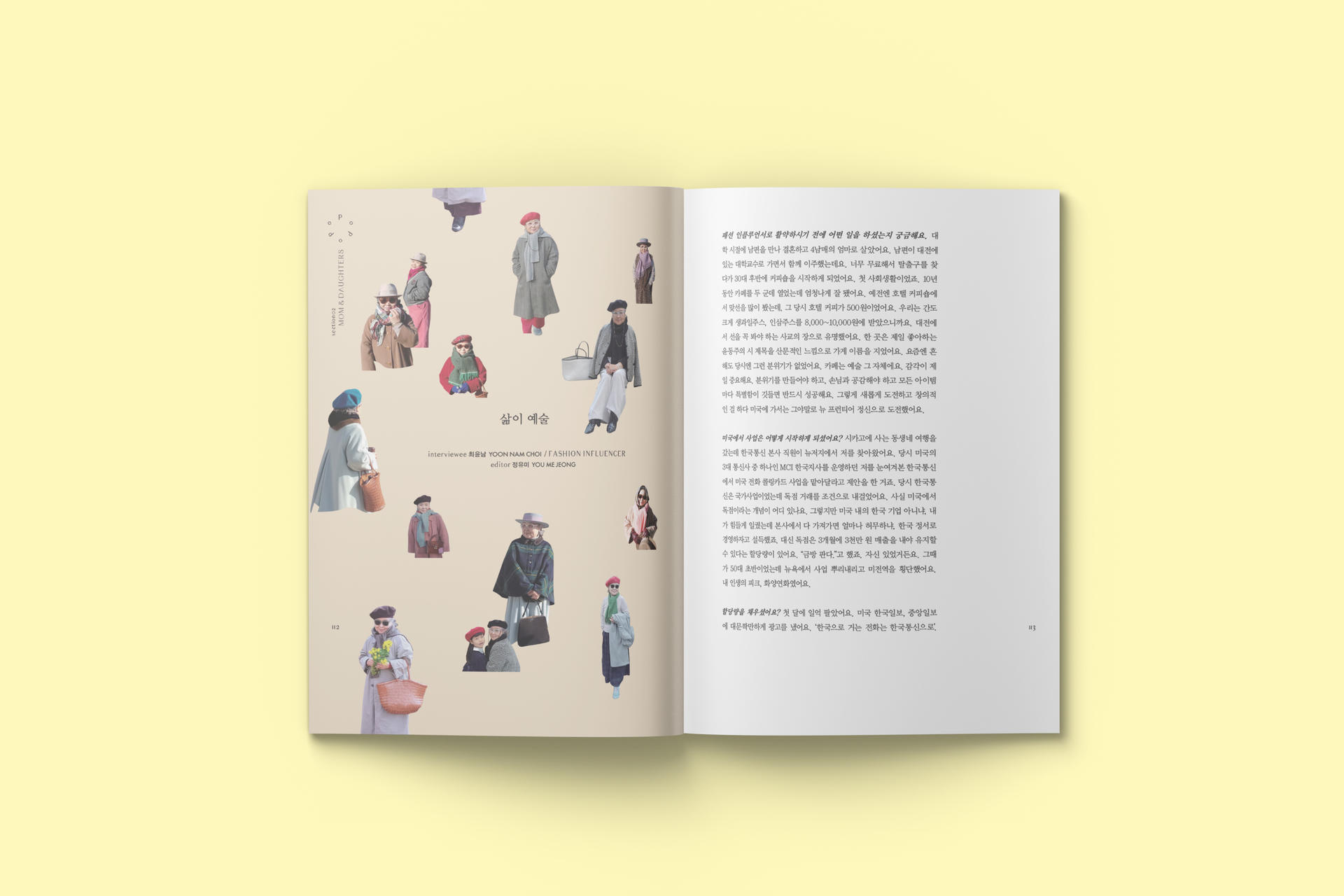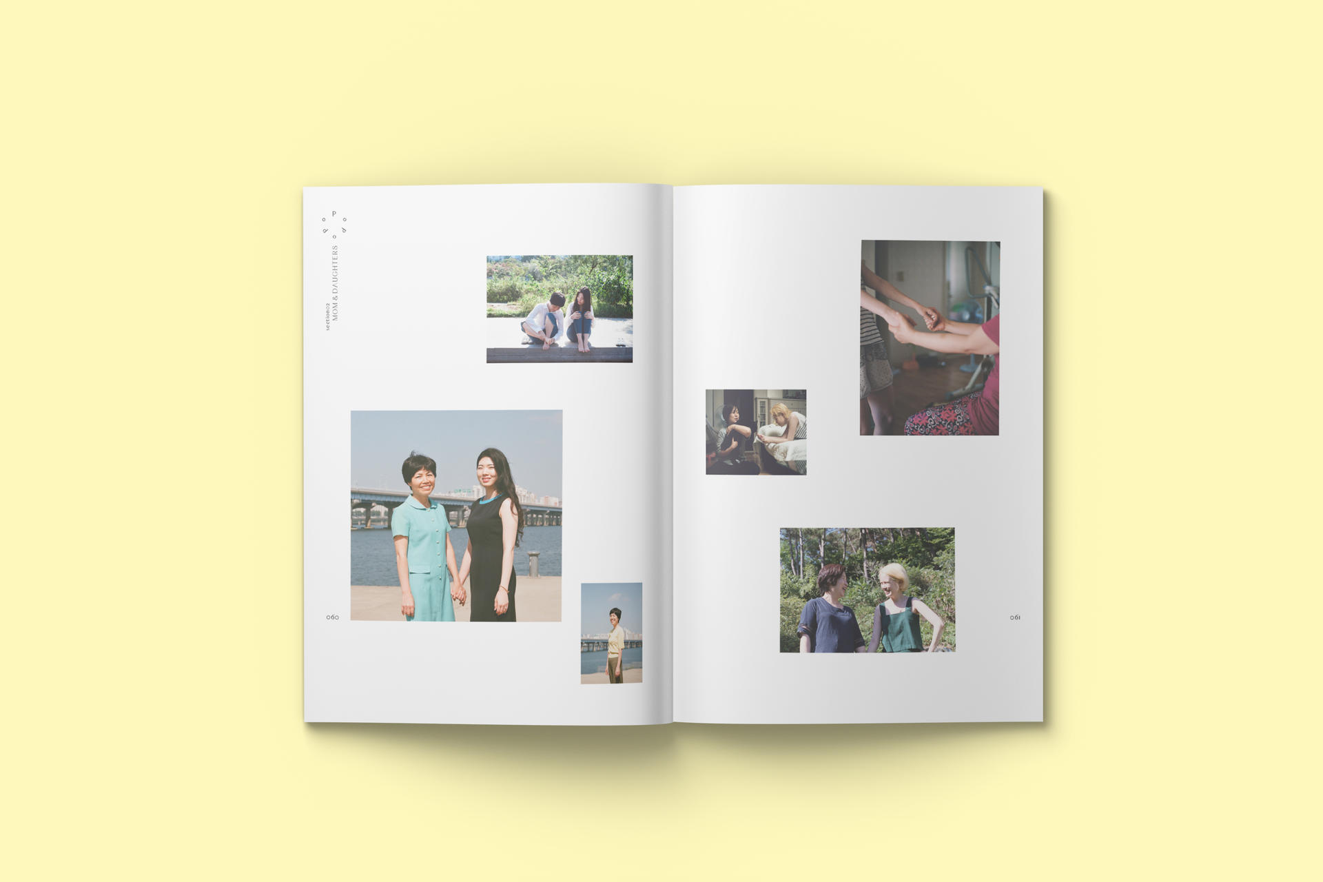 두 번째 섹션 “MOTHER & DAUGHTER” 에서는 엄마와 딸이라는 지독하게 사랑하면서도 미워하는 특별한 관계를 조명했다. 강희주 작가는 ‘엄마와 딸, 우리의 초상’에서 <가끔, 가족>을 시작으로 <MOTHER & DAUGHTER>로 연결되는 사진 작업을 통해 서로 다른 감정과 기억들이 그사이에 어떻게 자리 하고 있는지 조명했다. 암 투병에 관한 자전적 에세이 <거북이 수영 클럽>의 저자인 이서현 작가는 ‘별처럼 수많은 사람들, 그중에 그대를 만나’를 통해 평범 한 이들의 눈에 보이지 않는 어떤 특별한 실로 오래전부터 연결돼 있을지도 모를 엄마와 딸이 라는 특별한 인연을 지면에 담았다. ‘엄마는 지금도 자란다’ 에서는 커리어와 육아의 시간을 지 나며 돌아보게 된 엄마라는 인생의 좌표를 써 내려갔다. 3대에 걸쳐 엄마와 딸의 시선이 변주 하며 다양한 서사가 쌓였다. ‘My New Identity’ 에서는 네덜란드에 정착 후 엄마가 되어 예술가로의 전환점을 맞이한 정민지 작가가 애플맘이라는 이름으로 선보이는 인스타툰을 선보인다. 권성은 에디터의 ‘From Sydney to Shanghai’ 에서는 여행지에서의 진심 어린 고백이 펼쳐진다. 대학생 끝자락에서 엄마의 삶을 시작한 자신의 엄마를 인터뷰했다. 패션 인플루언서로 많은 이들에게 영감을 주는 그랜맘 최윤남님의 인터뷰 ‘삶이 예술’에서는 여자로 엄마로 사업가로 살아가며, 어떤 고난과 역경 속에서도 흔들리지 않고 새로운 꽃을 피워낸 인생의 혜안이 고스란히 녹아있다.