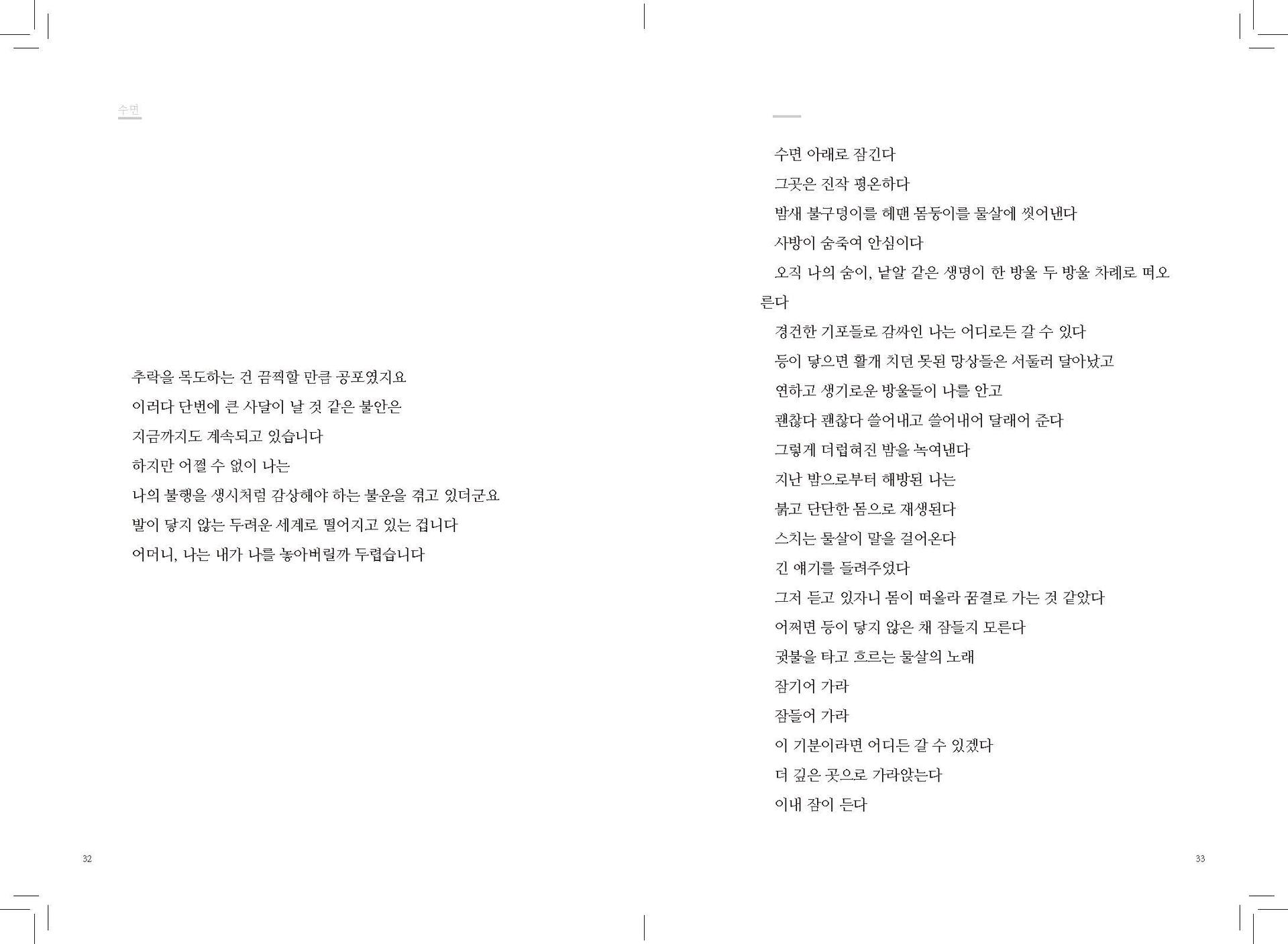 이것은 깊이 숨을 고르고 숨을 죽여 가장 깊은 곳으로 빠져드는 수면의 통로와 닮았다 (39p)“잠자리에 들어 눈을 감고 푸르고 푸른 물 위를 쉼 없이 저어 나가는 상상을 하곤 했지요