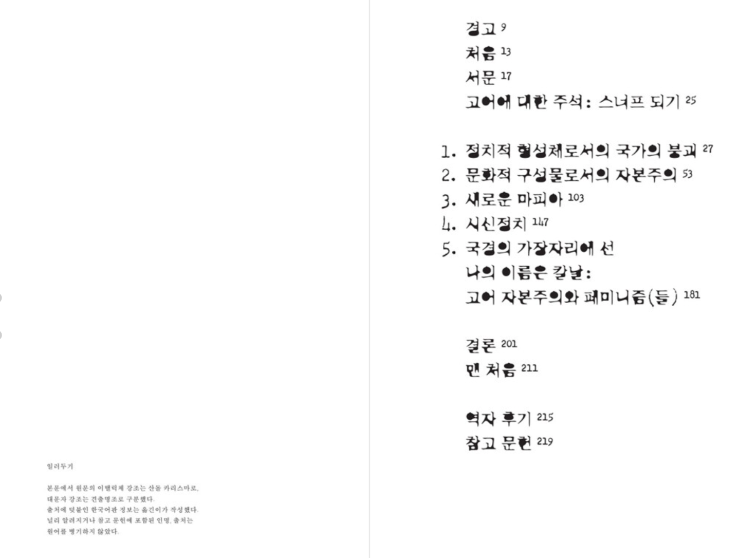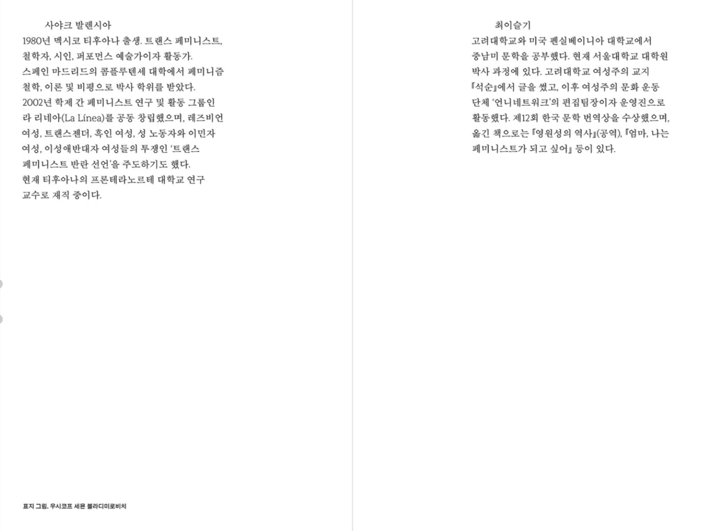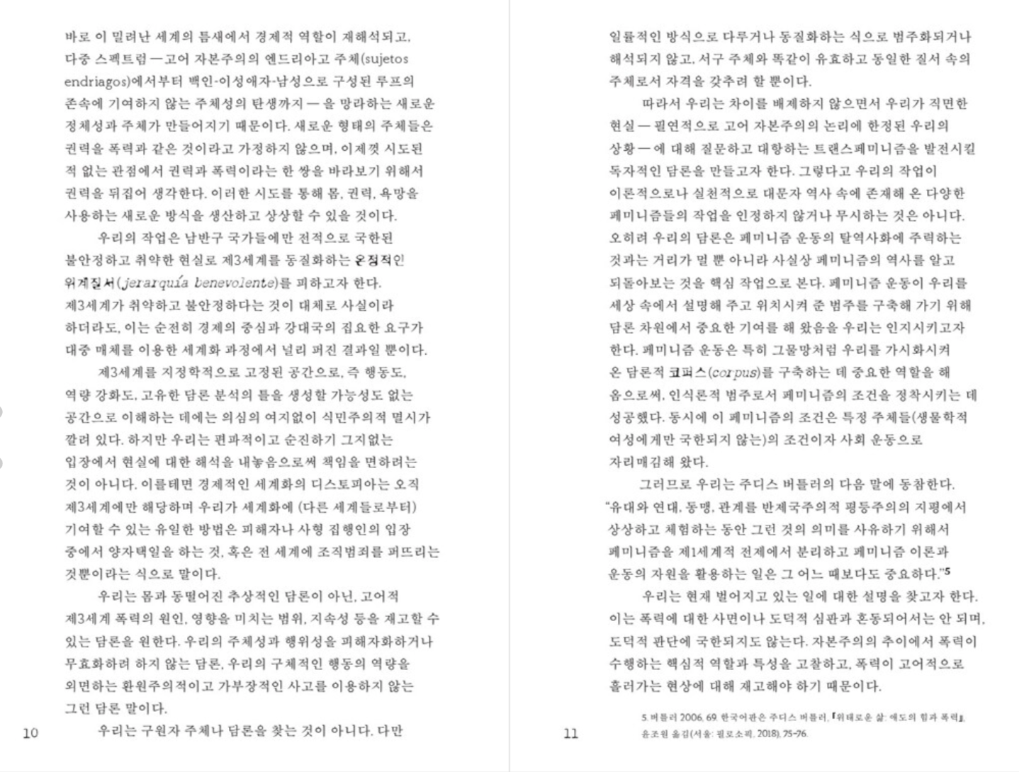 여성들, 그리고 이성애 가부장제 범주에 반하거나 하위 주체로 이해되는 모든 주체들은 역사를 통틀어 고어 안에서 살아왔다. 물리적이고 심리적인 극단적 폭력, 그리고 근래 미디어를 통한 매개적 폭력은 우리 일상, 우리 교육의 일부였다. 마치 “악질적이고 야만적인 러시안 룰렛에 우리를 끼워 넣는 낙인”과 같은 역특권처럼, 취약성과 폭력으로 점철된 조건이야말로 여성의 명백한 운명(destino manifiesto)에 내재된 것이라고 전제하는 담론이 구축될 때, 폭력이 중추적인 역할을 담당하는 것이다. 고어 자본주의가 행사하는 잔혹한 폭력에 대한 응답을 만들어 가야 하는 것은 바로 우리들이다.(183쪽)