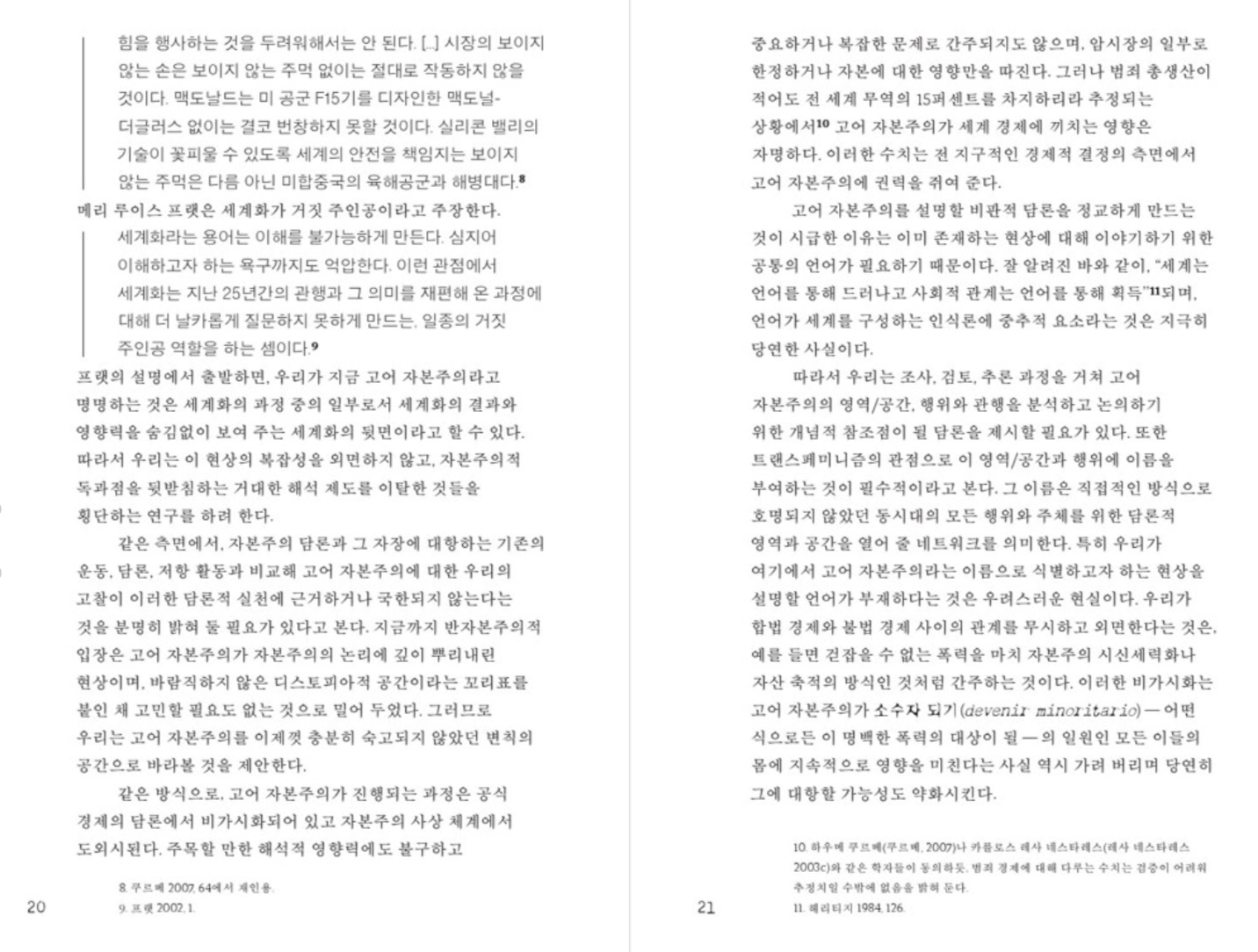 고어 자본주의가 진행되는 과정은 공식 경제의 담론에서 비가시화되어 있고 자본주의 사상 체계에서 도외시된다. 주목할 만한 해석적 영향력에도 불구하고 중요하거나 복잡한 문제로 간주되지도 않으며, 암시장의 일부로 한정하거나 자본에 대한 영향만을 따진다. 그러나 범죄 총생산이 적어도 전 세계 무역의 15퍼센트를 차지하리라 추정되는 상황에서 고어 자본주의가 세계 경제에 끼치는 영향은 자명하다.(20~21쪽)
