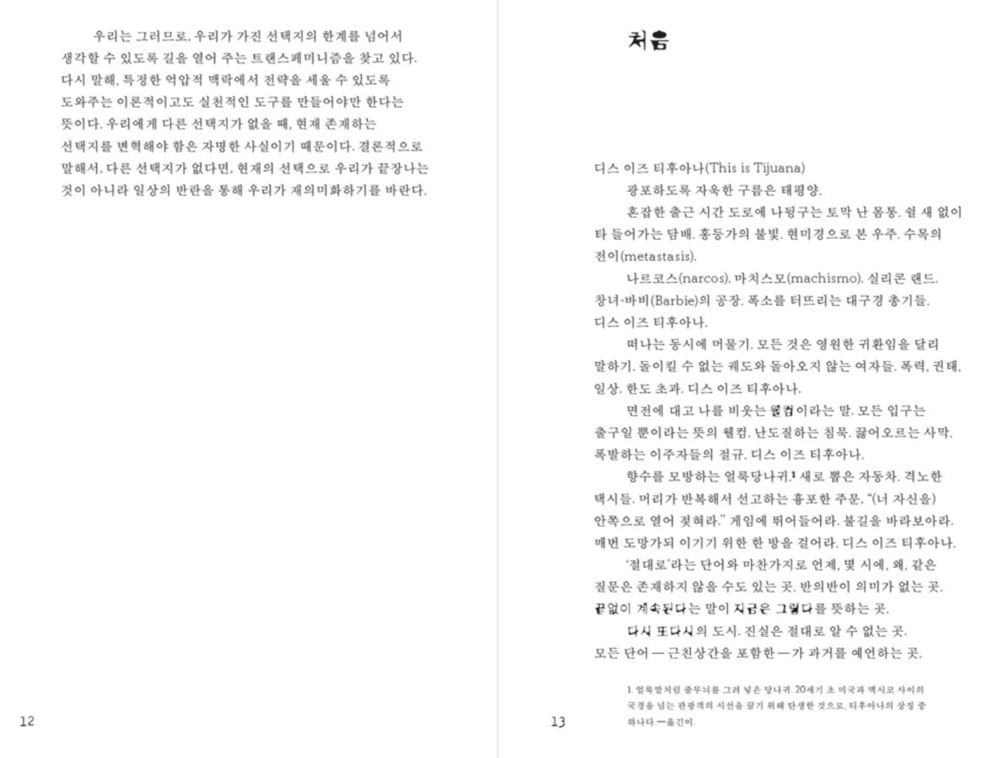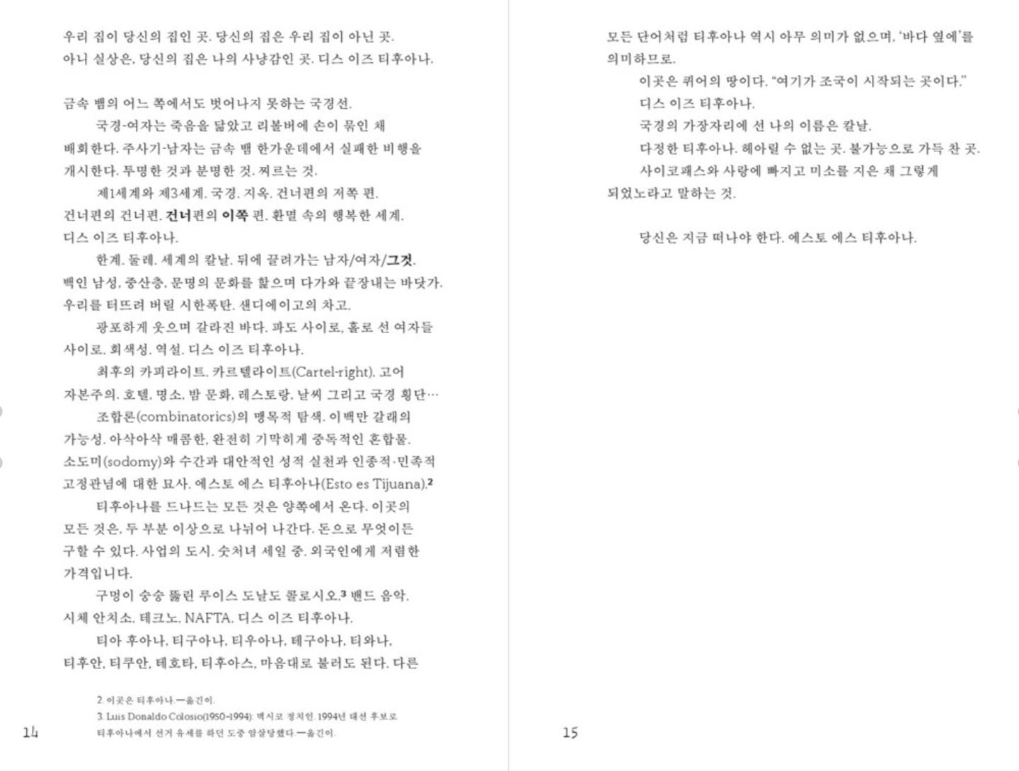 우리는 티후아나에 대한 접근하려면 이 도시에 대한 세 가지 가장 흔한 클리셰와 대화하는 동시에 거기에 도전해야 한다고 단언한다. 포스트모더니티의 실험실, 티후아나. 지나가는 도시, 티후아나. 악덕 도시, 티후아나. 물론 이러한 특징이 티후아나의 꽤 중요한 부분을 구성하며 존속한다는 사실은 인식해야 하기 때문에, 이를 회피해 버려서는 안 된다. 하지만 이 클리셰만으로는 이토록 모순적인 국경을 형성하고 있는 현실을 설명할 수 없다. 티후아나의 중심핵인 폭력의 경제를 고려하고 있지 않기 때문이다.(135쪽)