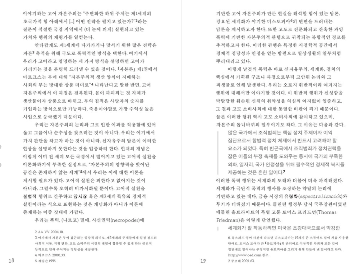 엔드리아고 주체는 새로운 자본주의의 행위 축으로서, 견고한 모든 것은 대기 속으로 녹아 사라진다는 근대성에 대한 마르크스주의의 슬로건을 박살낸다. 이제 견고하고 소비할 수 있는 모든 것은 피 위에 세워진다.(95쪽)