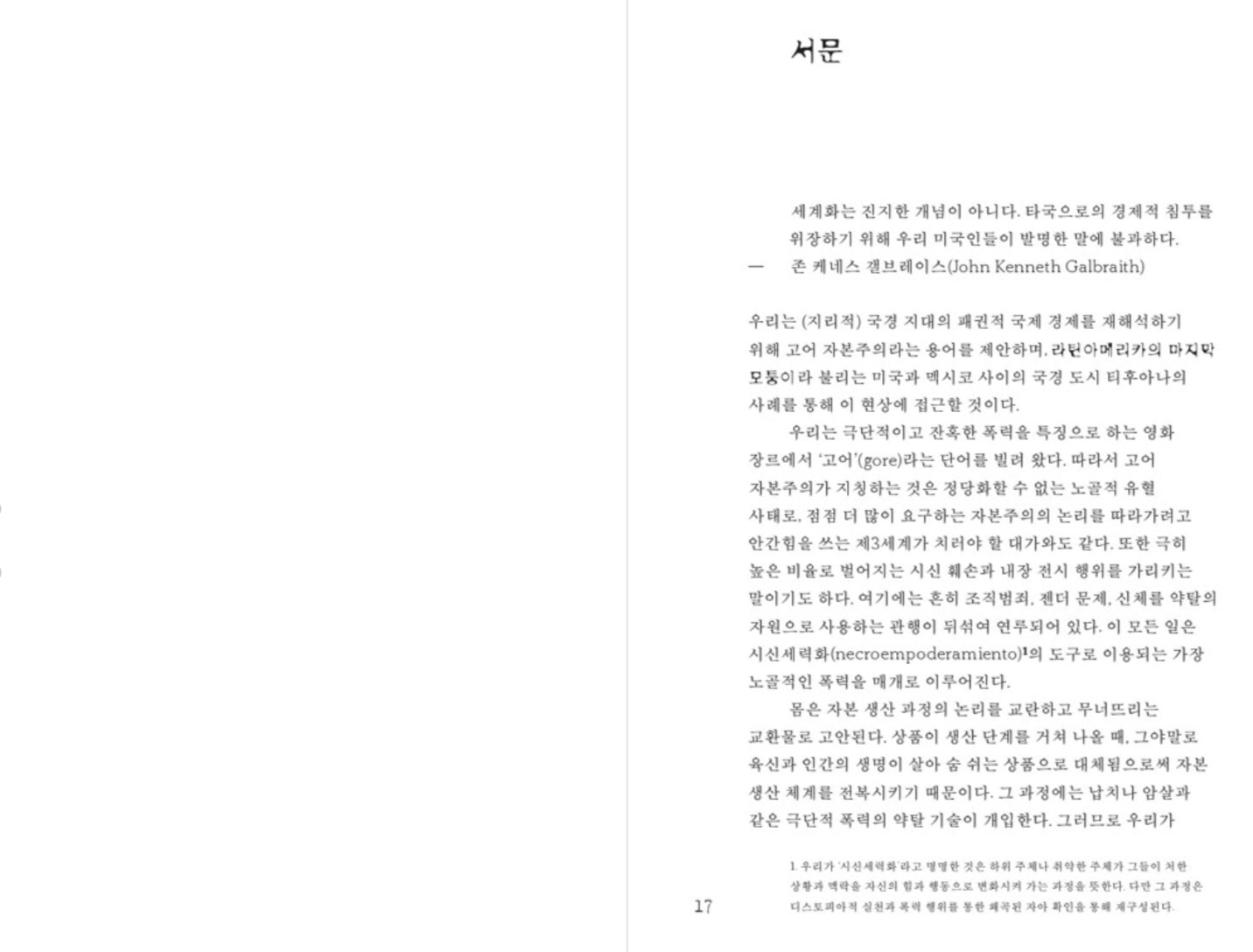 고어 자본주의가 출현하고 수용되고 정상화된 이후로, 폭력 행위를 설명하는 데 있어 합법성과 불법성의 범주가 여전히 유효할 수 있을까? 무엇이 폭력을 합법적인 것으로 바꾸는가? 폭력을 행사하는 우리에게 청구될 금액은? 폭력의 독점권은 더 이상 국민 국가의 배타적 소유물이 아니다. 폭력의 독점권은 경매에 붙여졌고 가장 높은 입찰가는 조직범죄가 부르고 있다.(48쪽)