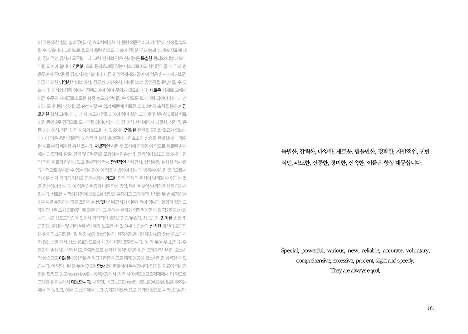 특별한, 강력한, 다양한, 새로운, 믿을만한, 정확한, 자발적인, 전반적인, 과도한, 신중한, 경미한, 신속한. 이들은 항상 대등합니다.