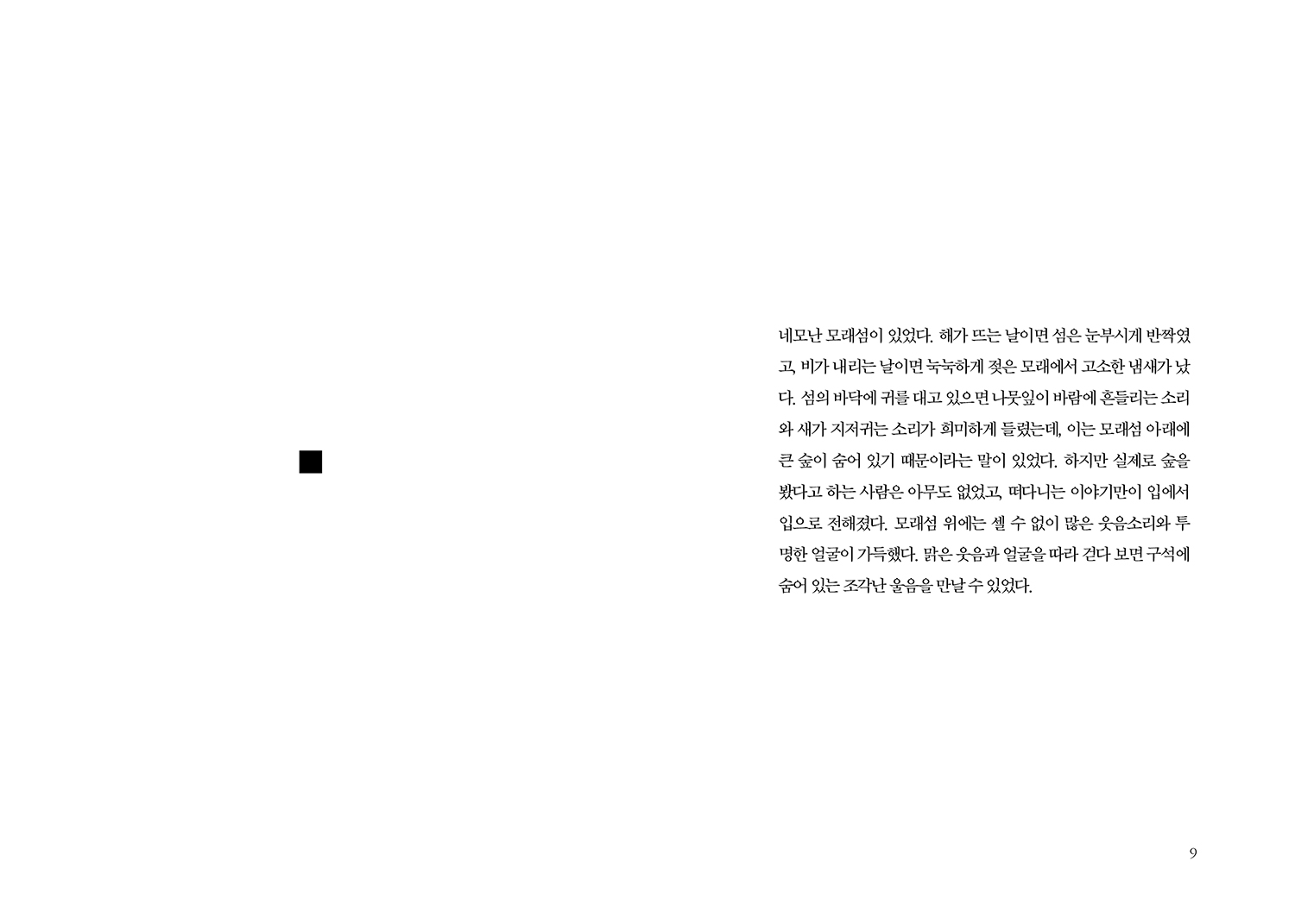 네모난 모래섬이 있었다. 해가 뜨는 날이면 섬은 눈부시게 반짝였고, 비가 내리는 날이면 눅눅하게 젖은 모래에서 고소한 냄새가 났다. 섬의 바닥에 귀를 대고 있으면 나뭇잎이 바람에 흔들리는 소리와 새가 지저귀는 소리가 희미하게 들렸는데, 이는 모래섬 아래에 큰 숲이 숨어 있기 때문이라는 말이 있었다.
