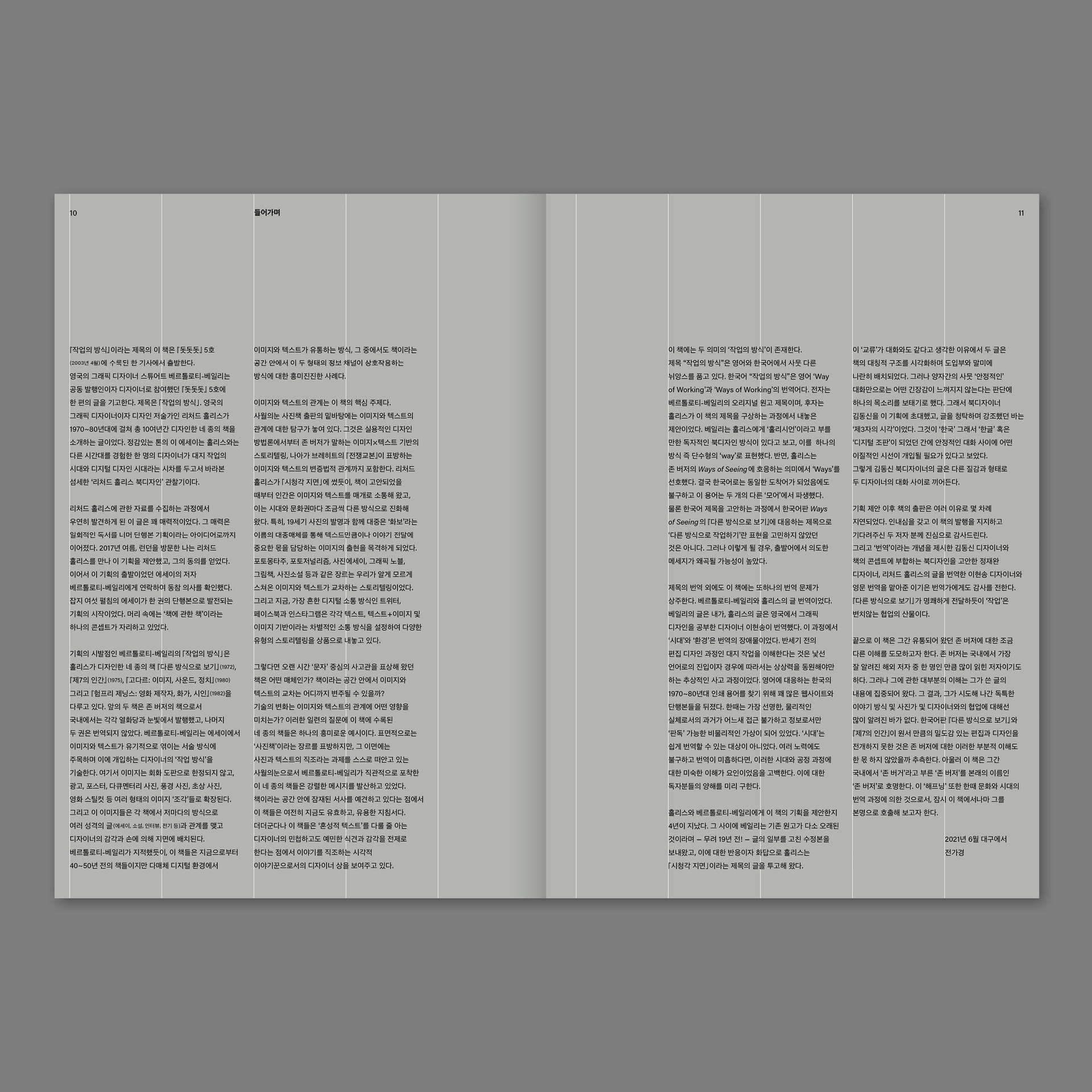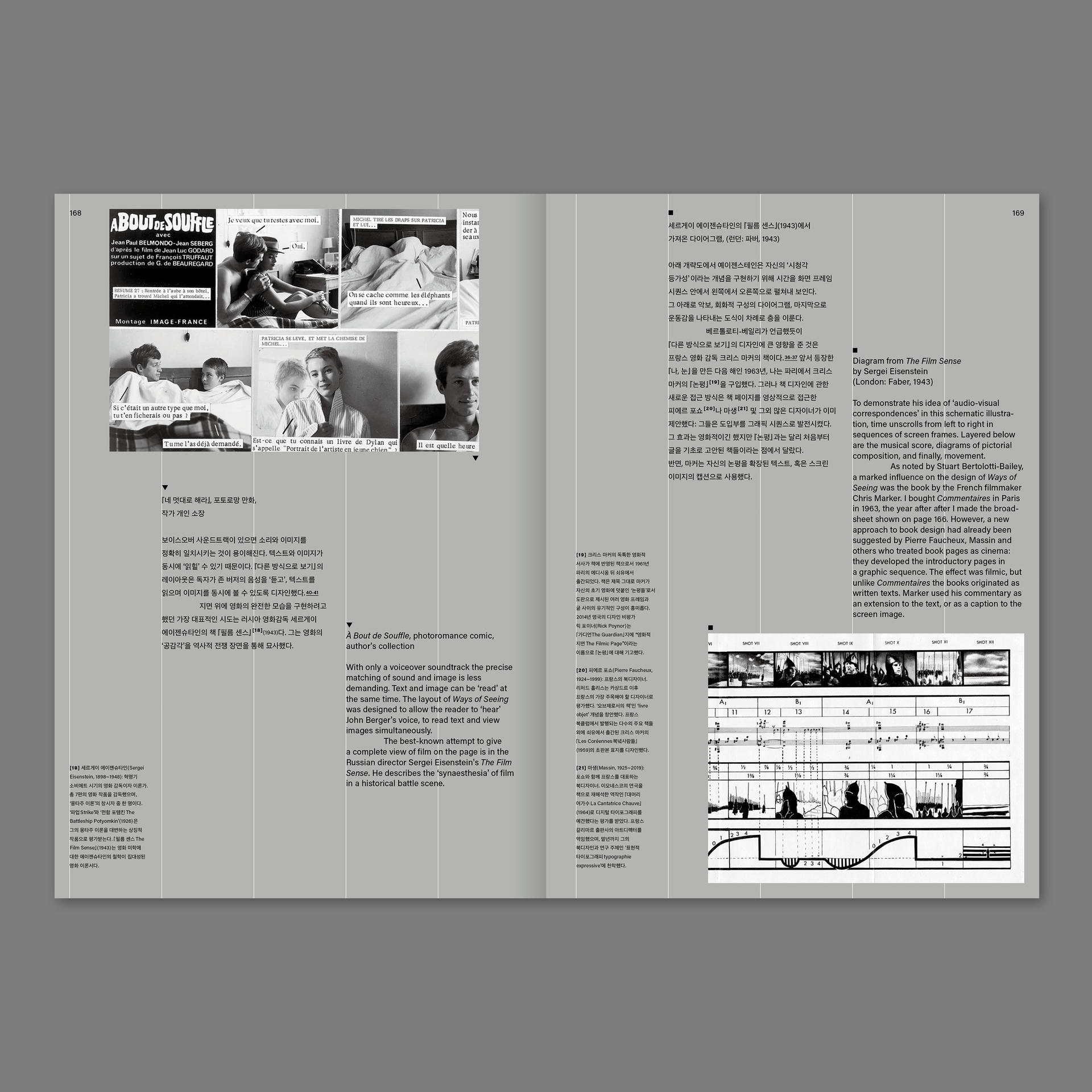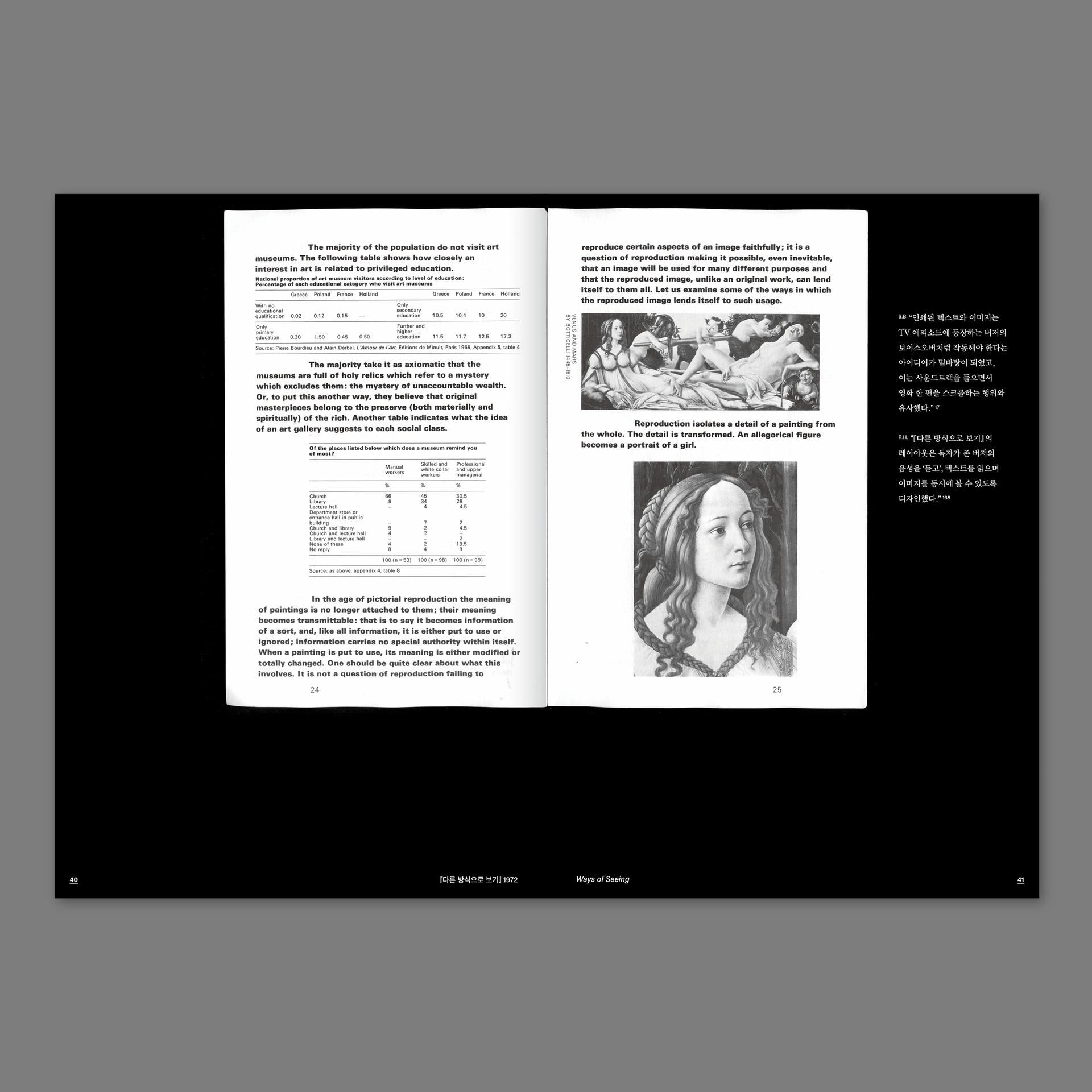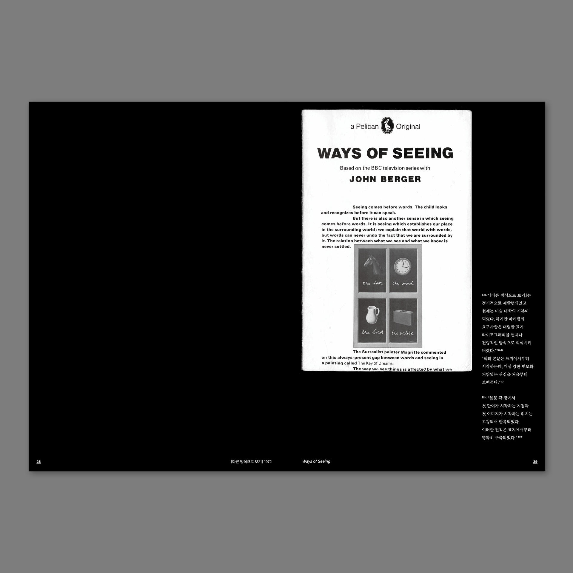 “이상의 내용은 라틴 알파벳이 우월하다는 근거도 한글이 타이포그래피적으로 불리하다는 증거도 아니다. 중요한 것은 직역의 불가능성이 선명하게 노출되는 지점이야말로 보다 비관습적인 디자인, 진정한 의미에서의 역동적 등가로 나아가는 출발점이 될 수 있다는 점이다. 『다른 방식으로 보기』는 원서의 시퀀스를 성실하게 재현함으로써 텍스트 내용에 있어서의 동일성은 확보했으나 그 외의 형식적 특성들은 번역의 대상에서 탈락시킴으로써 미완의 성공을 거뒀다. 그렇다면 이처럼 디자인의 번역이 필요한 텍스트가 과제로 주어졌을 때 우리는 그들을 어떻게 대해야 할까. 어떻게 하면 관습의 골짜기로 빠지지 않으면서 가독성을 확보하고, 원서가 지녔던 것만큼의 미적인 즐거움을 생산할 수 있을 것인가.”