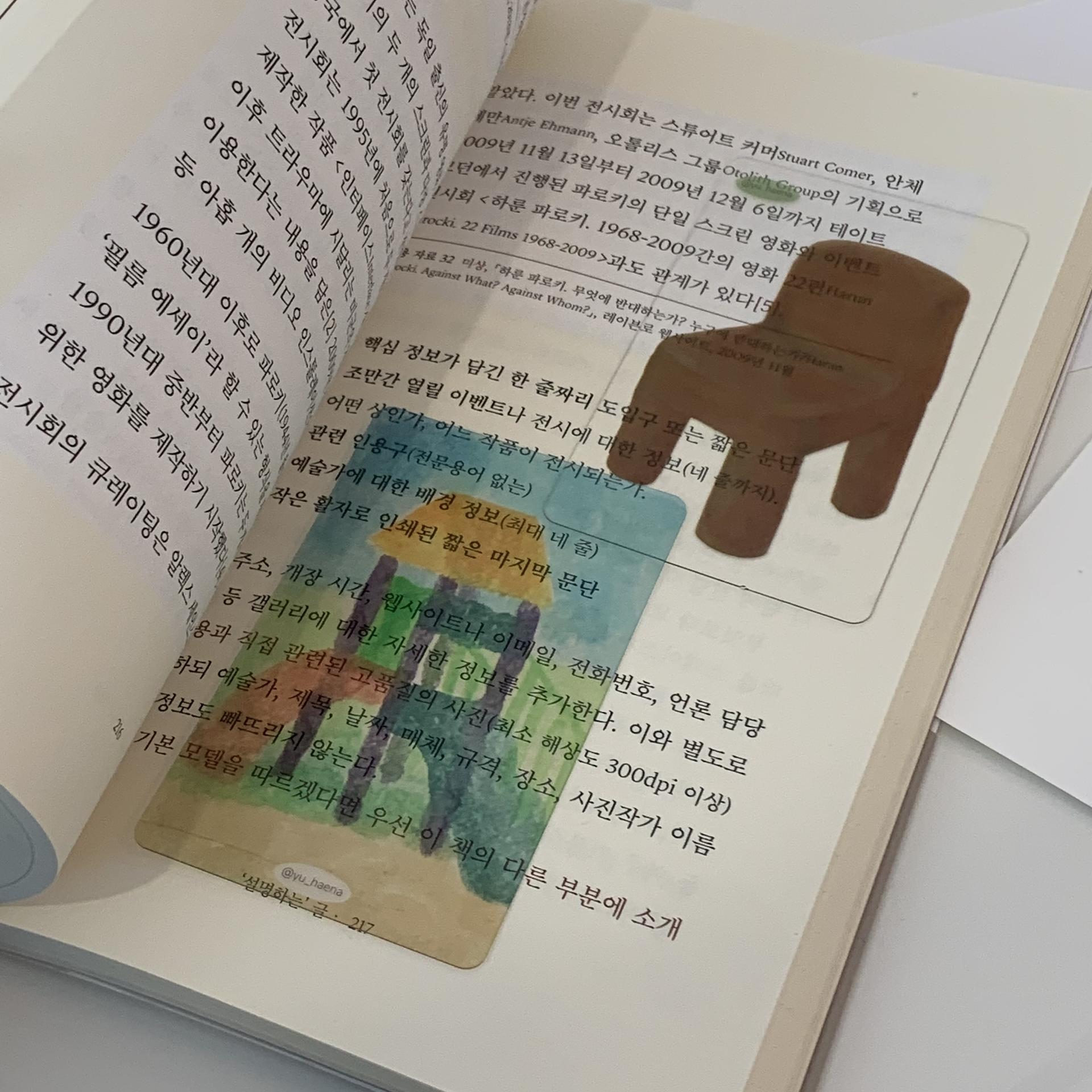 책을 읽다가 잠시 쉬어가기 좋을 그림 책갈피 입니다. 읽기 힘든 책 사이에도 끼워두고 발견하면 기분 좋을 책갈피 입니다. 제가 그린 그림을 크기에 맞게 담았습니다. 소중한 일상의 한 조각으로 스며 들었으면 해서 투명한 재질로 제작했습니다. .