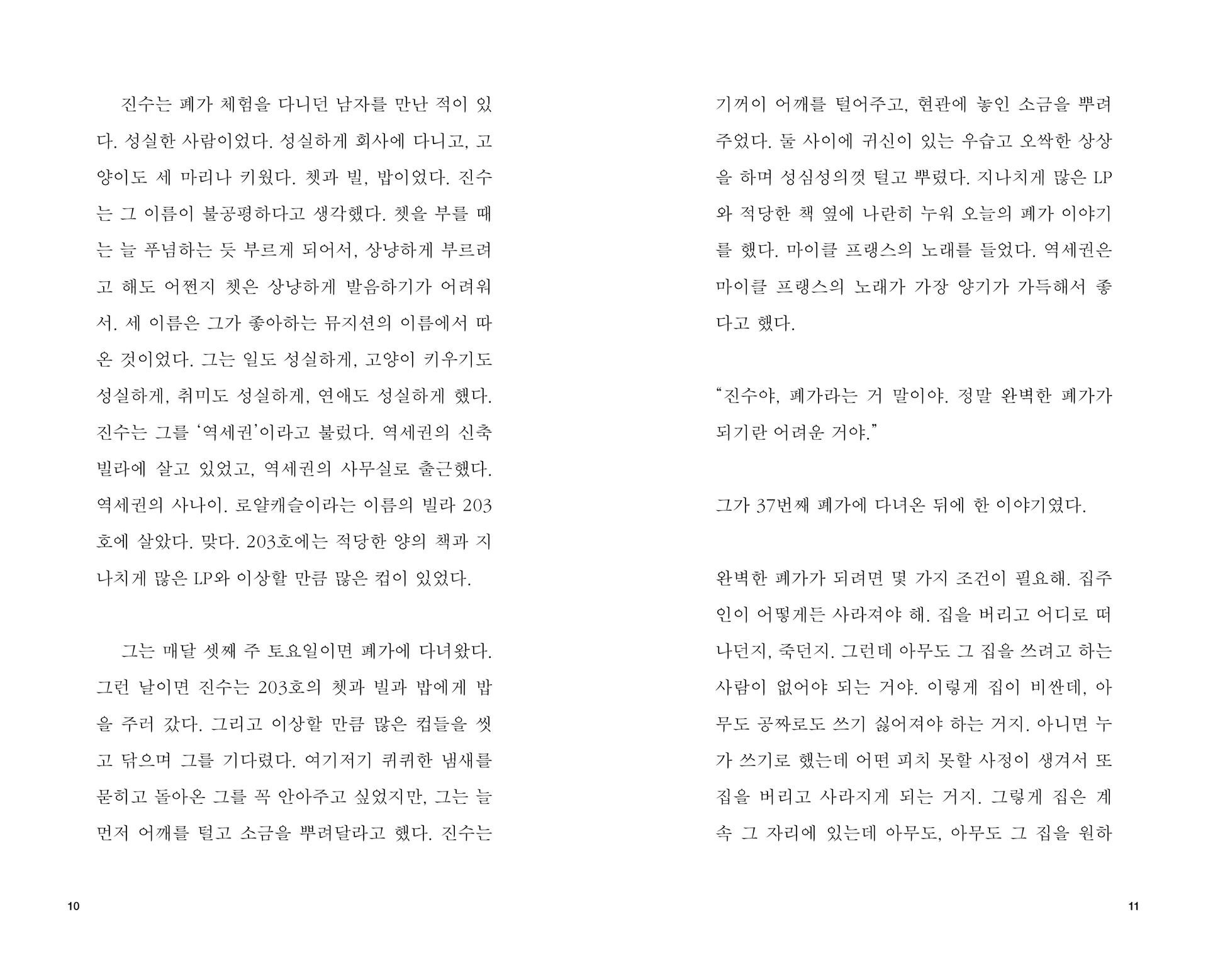 완벽한 폐가가 되려면 몇 가지 조건이 필요해. 집주인이 어떻게든 사라져야 해. 집을 버리고 어디로 떠나던지, 죽던지. 그런데 아무도 그 집을 쓰려고 하는 사람이 없어야 되는 거야. (p.11)