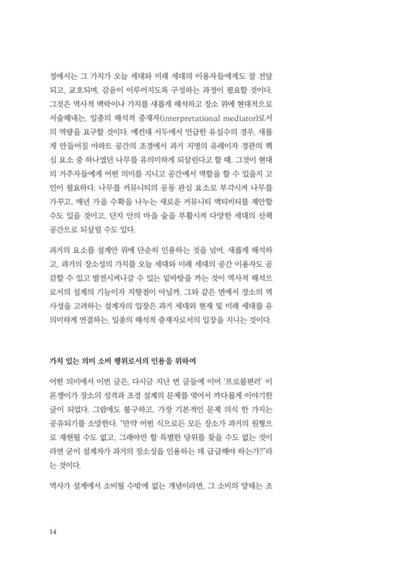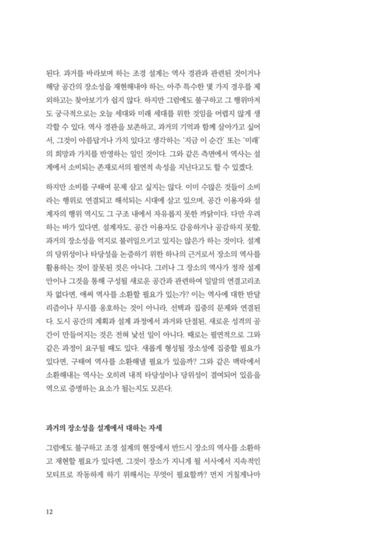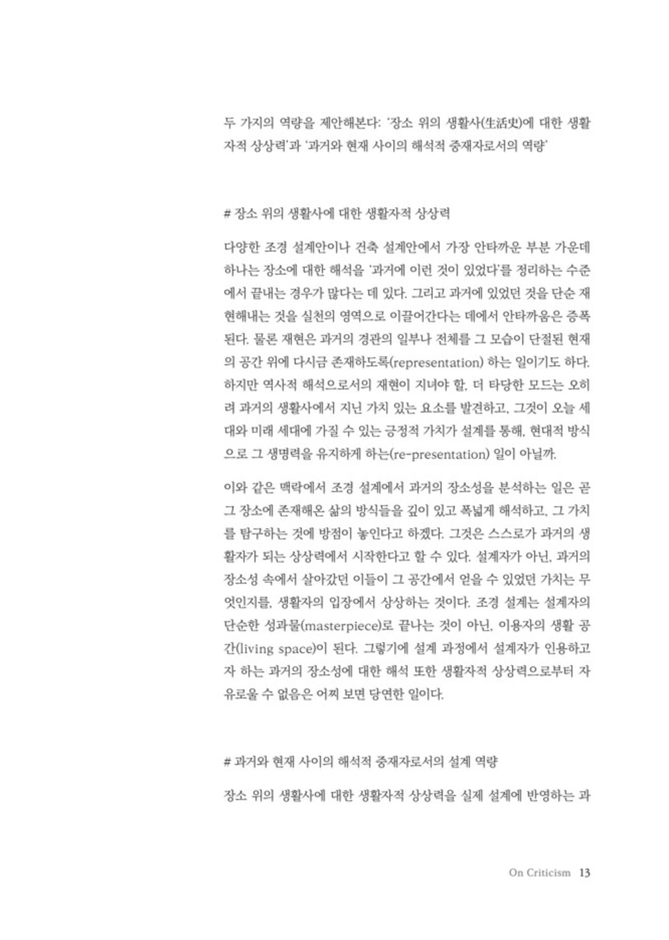 “그럼에도 불구하고 조경 설계의 현장에서 반드시 장소의 역사를 소환하고 재현할 필요가 있다면, 그것이 장소가 지니게 될 서사에서 지속적인 모티프로 작동하게 하기 위해서는 무엇이 필요할까? 먼저 거칠게나마 두 가지의 역량을 제안해본다: ‘장소 위의 생활사(生活史)에 대한 생활자적 상상력’과 ‘과거와 현재 사이의 해석적 중재자로서의 역량’.” pp.12-13