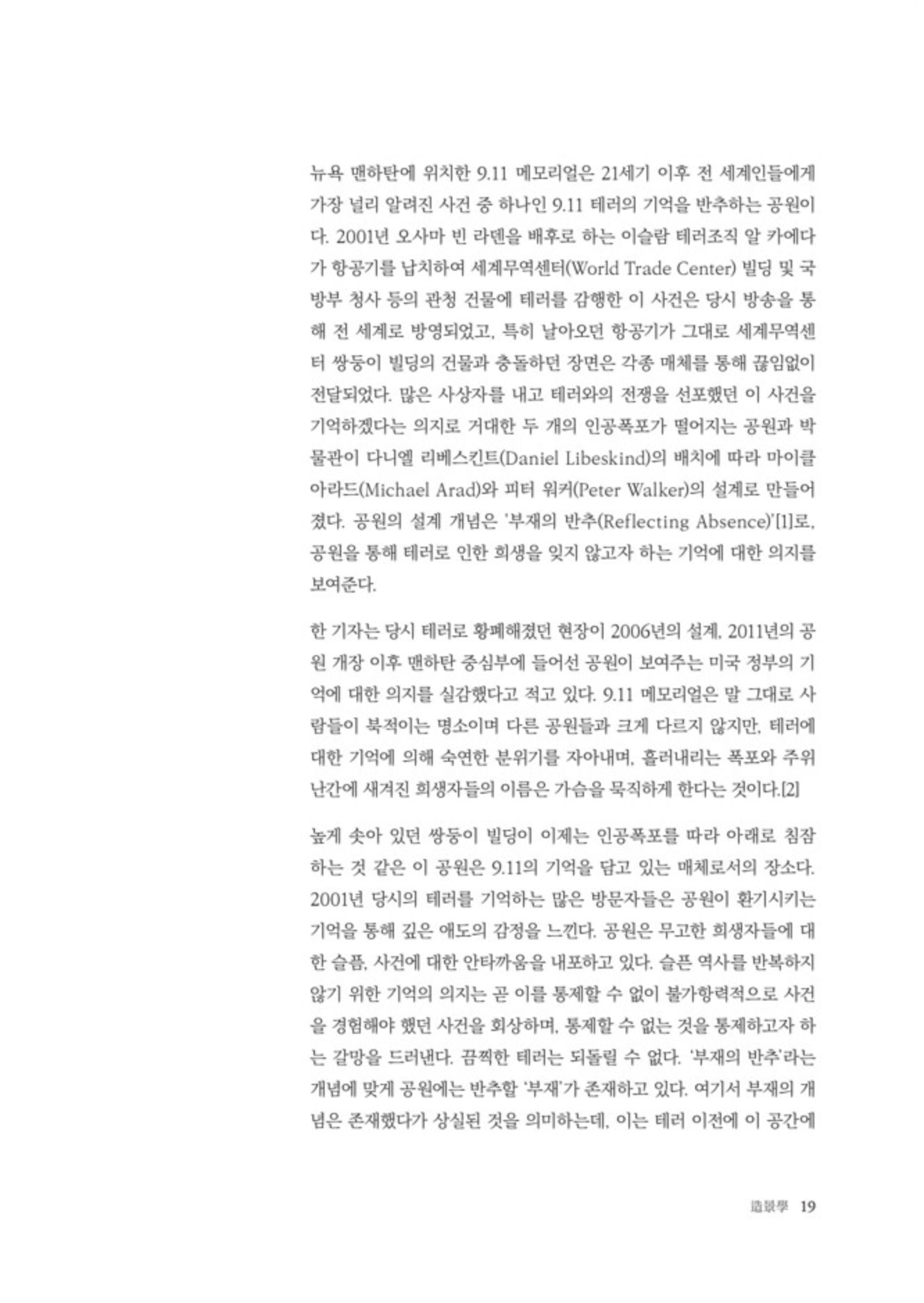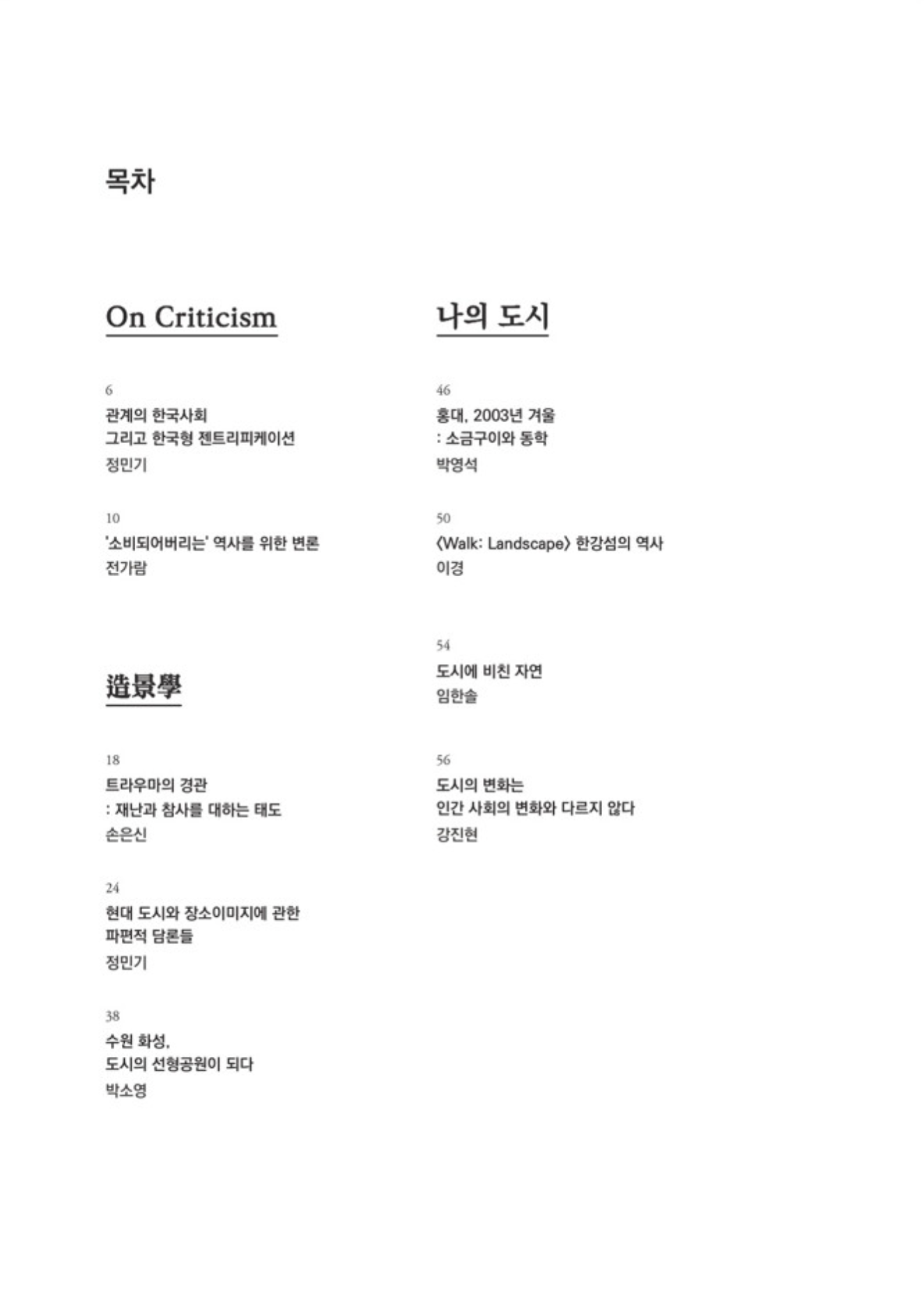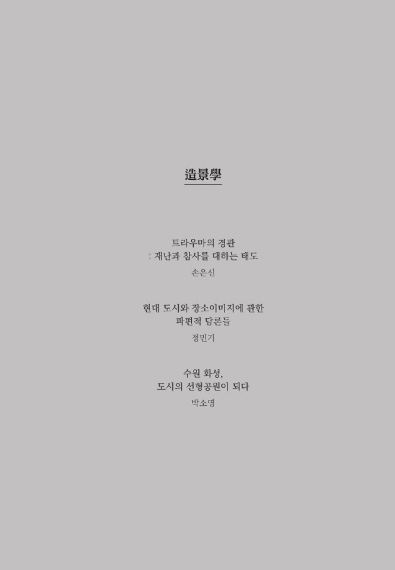 “그럼에도 불구하고 조경 설계의 현장에서 반드시 장소의 역사를 소환하고 재현할 필요가 있다면, 그것이 장소가 지니게 될 서사에서 지속적인 모티프로 작동하게 하기 위해서는 무엇이 필요할까? 먼저 거칠게나마 두 가지의 역량을 제안해본다: ‘장소 위의 생활사(生活史)에 대한 생활자적 상상력’과 ‘과거와 현재 사이의 해석적 중재자로서의 역량’.” pp.12-13