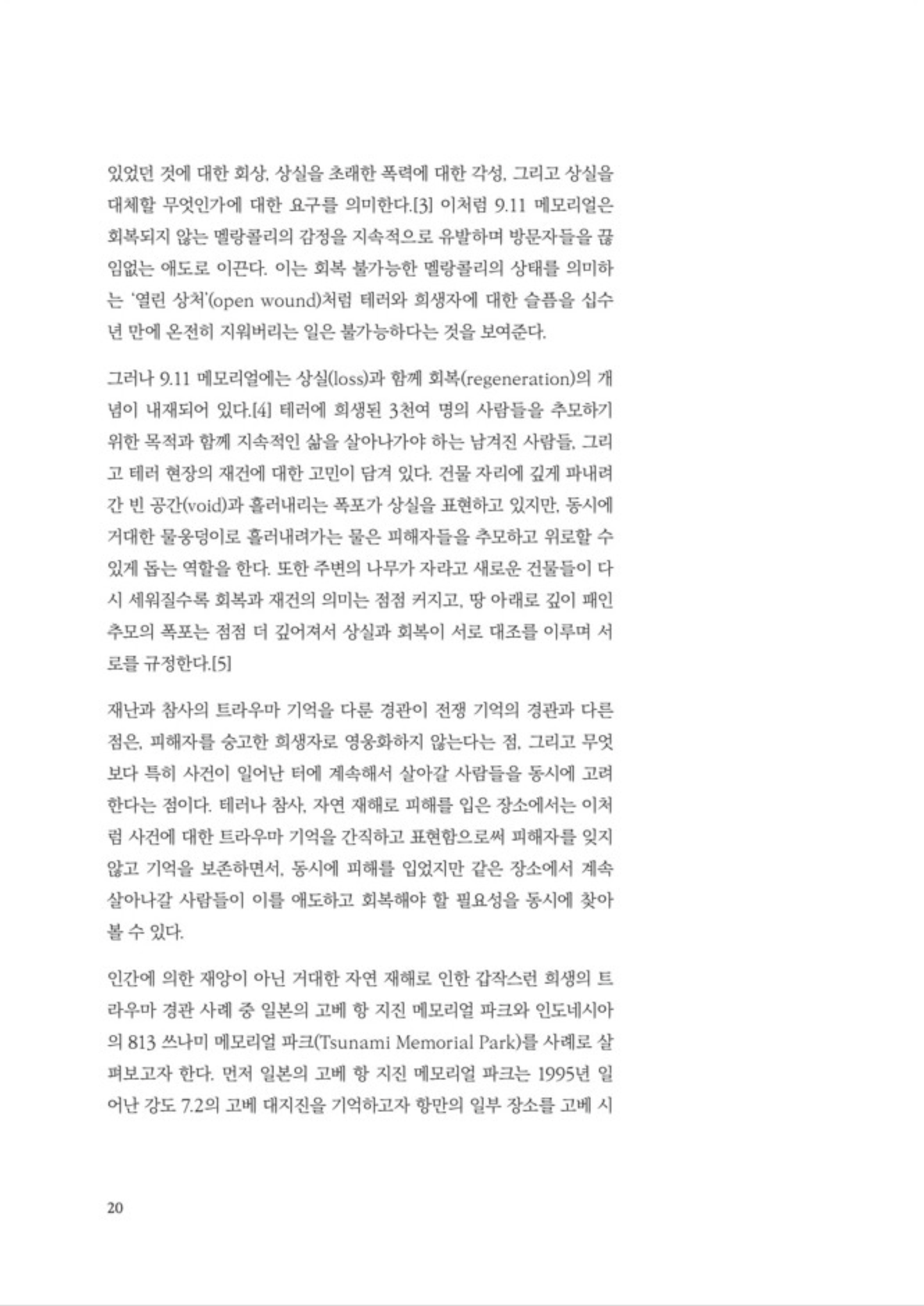 “세월호 추모 공간을 건립하는 과정에서 우리는 재난과 참사를 기억하고 추모하기 위한 트라우마 경관은 어떠해야 하는가에 대해 고민할 필요가 있다. 재난과 참사의 기억을 보여주는 트라우마 경관의 선례와 논의들을 되짚어볼 때, 파괴된 장소와 피해자에 대한 과거의 상실(loss)을 기억하는 동시에, 같은 터에서 계속 살아갈 사람들과 남겨진 이들의 회복(regeneration)이 함께 필요하다는 점은 분명하다.” pp.22-23