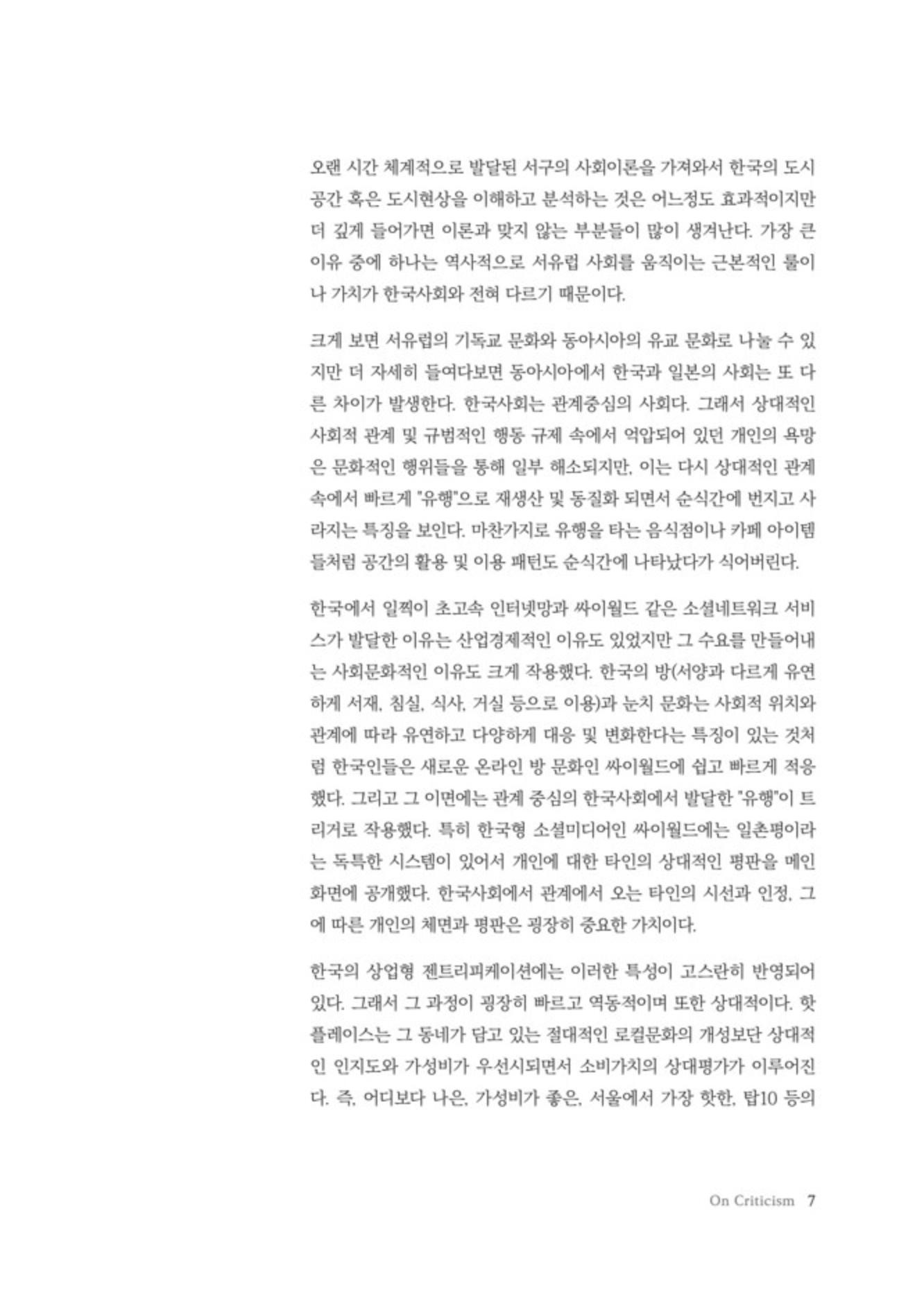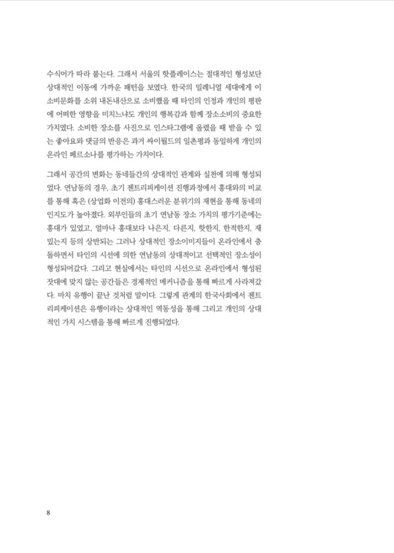 “외부인들의 초기 연남동 장소 가치의 평가기준에는 홍대가 있었고, 얼마나 홍대보다 나은지, 다른지, 핫한지, 한적한지, 재밌는지 등의 상반되는 그러나 상대적인 장소이미지들이 온라인에서 충돌하면서 타인의 시선에 의한 연남동의 상대적이고 선택적인 장소성이 형성되어갔다. 그리고 현실에서는 타인의 시선으로 온라인에서 형성된 잣대에 맞지 않는 공간들은 경제적인 메커니즘을 통해 빠르게 사라져갔다. 마치 유행이 끝난 것처럼 말이다. 그렇게 관계의 한국사회에서 젠트리피케이션은 유행이라는 상대적인 역동성을 통해 그리고 개인의 상대적인 가치 시스템을 통해 빠르게 진행되었다.” p.8
