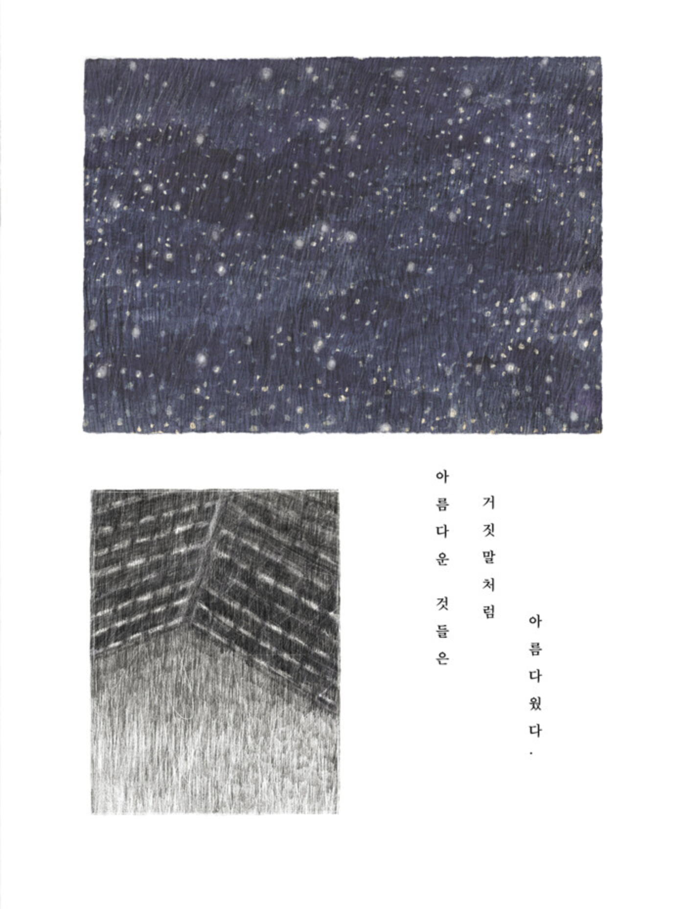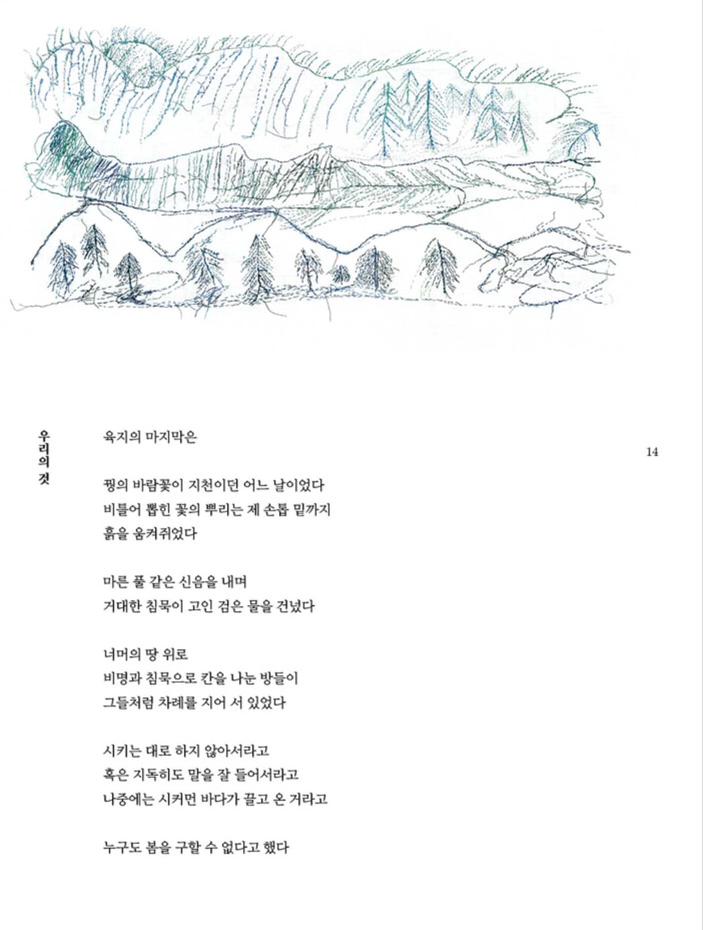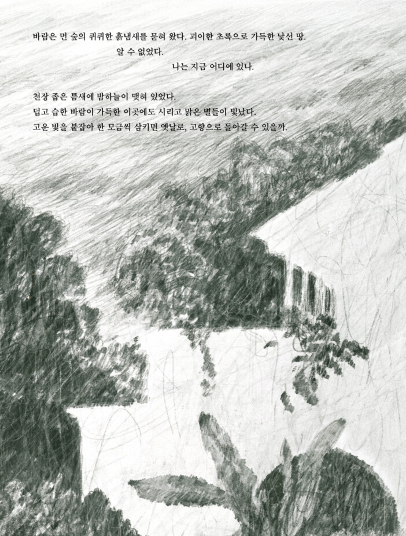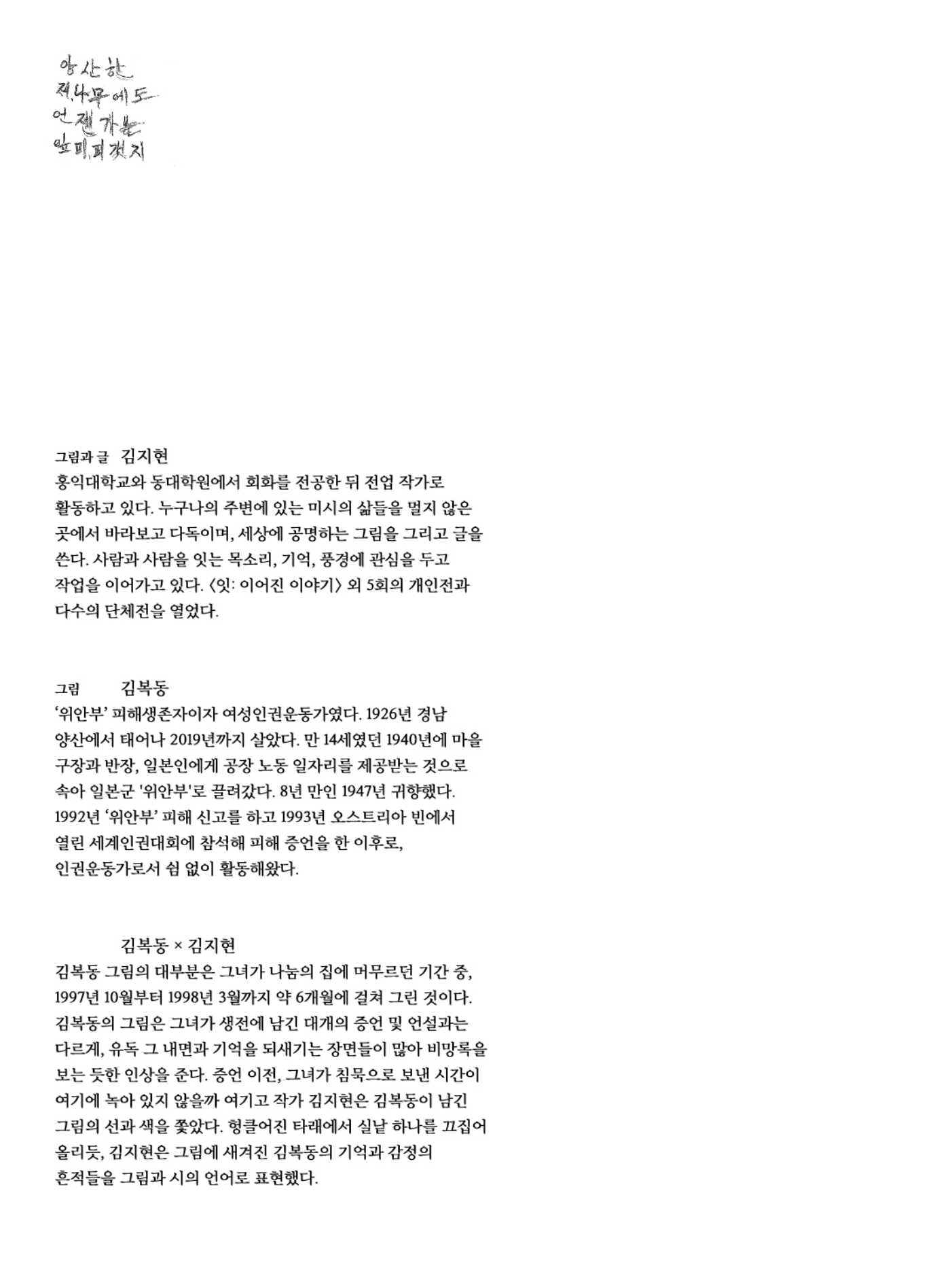 마치 헝클어진 타래에서 실낱 하나를 끄집어 올리듯, 김지현은 그림에 새겨진 김복동의 기억과 감정의 흔적들을 그림과 시의 언어로 표현했다. 조심스럽지만 적극적으로 그 그림들의 뒤를 잇듯 그리고, 또 이어서 썼다. 역사적 기록물로서 일본군 ‘위안부’ 피해사실을 열거하기보다, 김복동이 일상 속에서 만났을 풍경과 사람, 마음 속 이야기를 풀어내는 작업에 집중했다. 삶에 대한 의지와 번민, 그저 평범한 생을 살고 싶은 한 사람으로서의 내면 풍경을 김복동의 그림에서 찾아 풀어냄으로써, 김복동의 일상이 어디에나 있는 우리 이웃의 일상처럼 독자의 삶 곁에 머무를 수 있었으면 하는 바람을 담았다. 나아가 작가는 이제 고인이 되어 마주할 수 없는 분들을 우리가 어떻게 기억하고 그 기억을 이어갈 수 있을지를 고민하며 질문하고 있기도 하다.