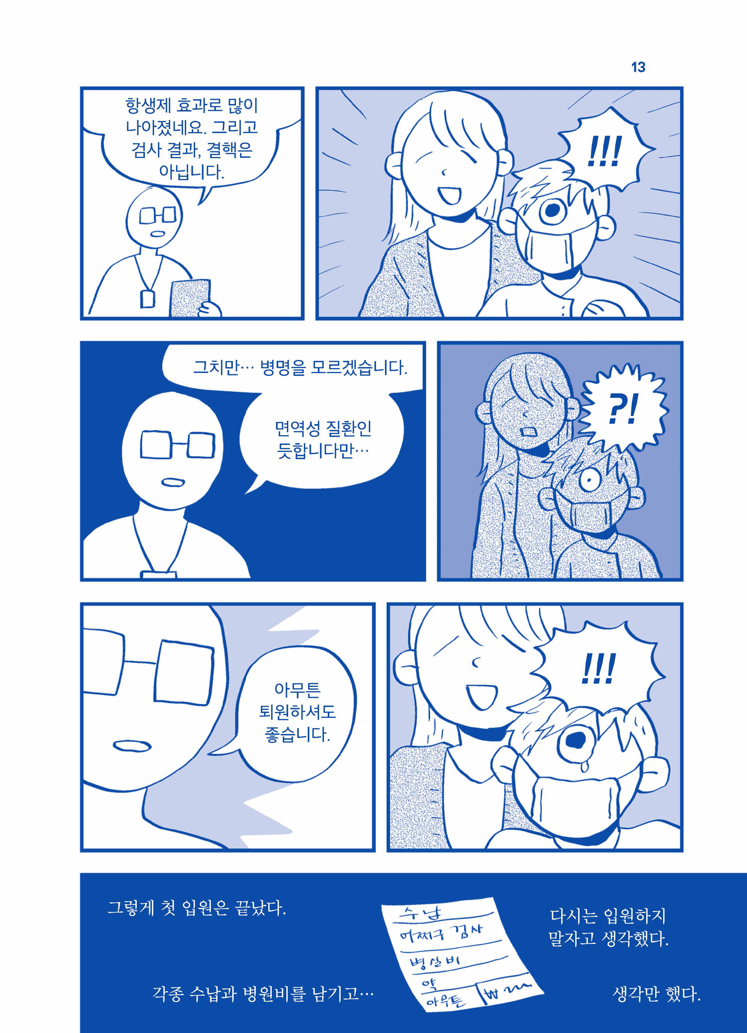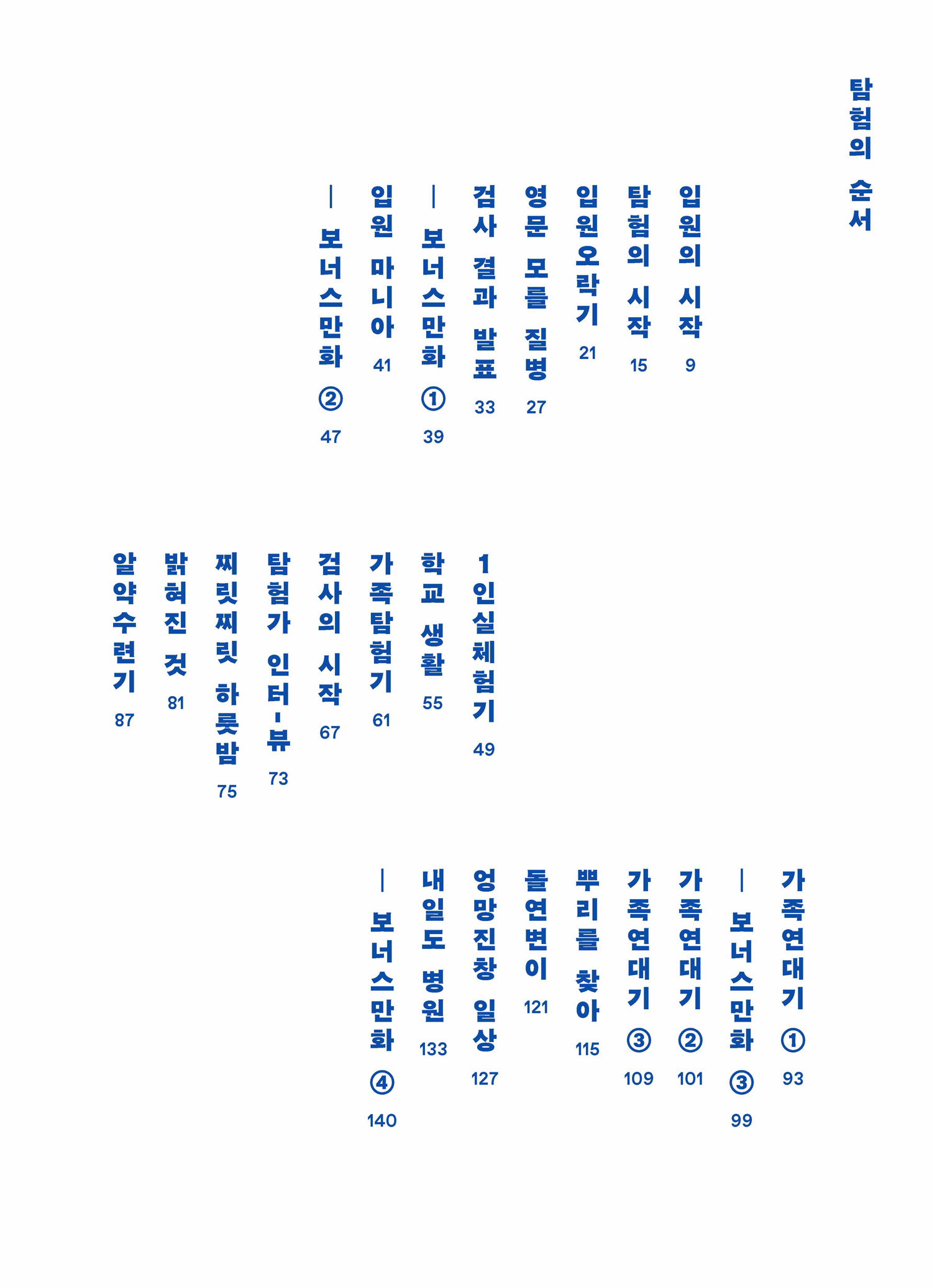 『병원탐험기』의 주인공은 자신을 찾아온 병의 정체를 알기 위해 데드라인 없이 병원을 누비는 탐험가입니다. 두근두근 비틀비틀대며 막이 열린 이 탐험은, 몰랐던 나를 알게 하고, 안다고 생각했던 가족을 새로 알려주며, 내 몸과 유래의 뿌리와 가지를 종횡무진하게 만듭니다. 몇 차례로 끝날 줄 알았던 병원탐험이 회차를 거듭해가며, 극한의 고독과 무료 속에서 제 적성을 발견하고, 일상에서는 만날 법하지 않은 친구를 사귀게도 하죠. 그럴 수도 아닐 수도 있는 슈뢰딩거의 고양이처럼, 명확한 것은 없는 탐험 속에서 하루는…