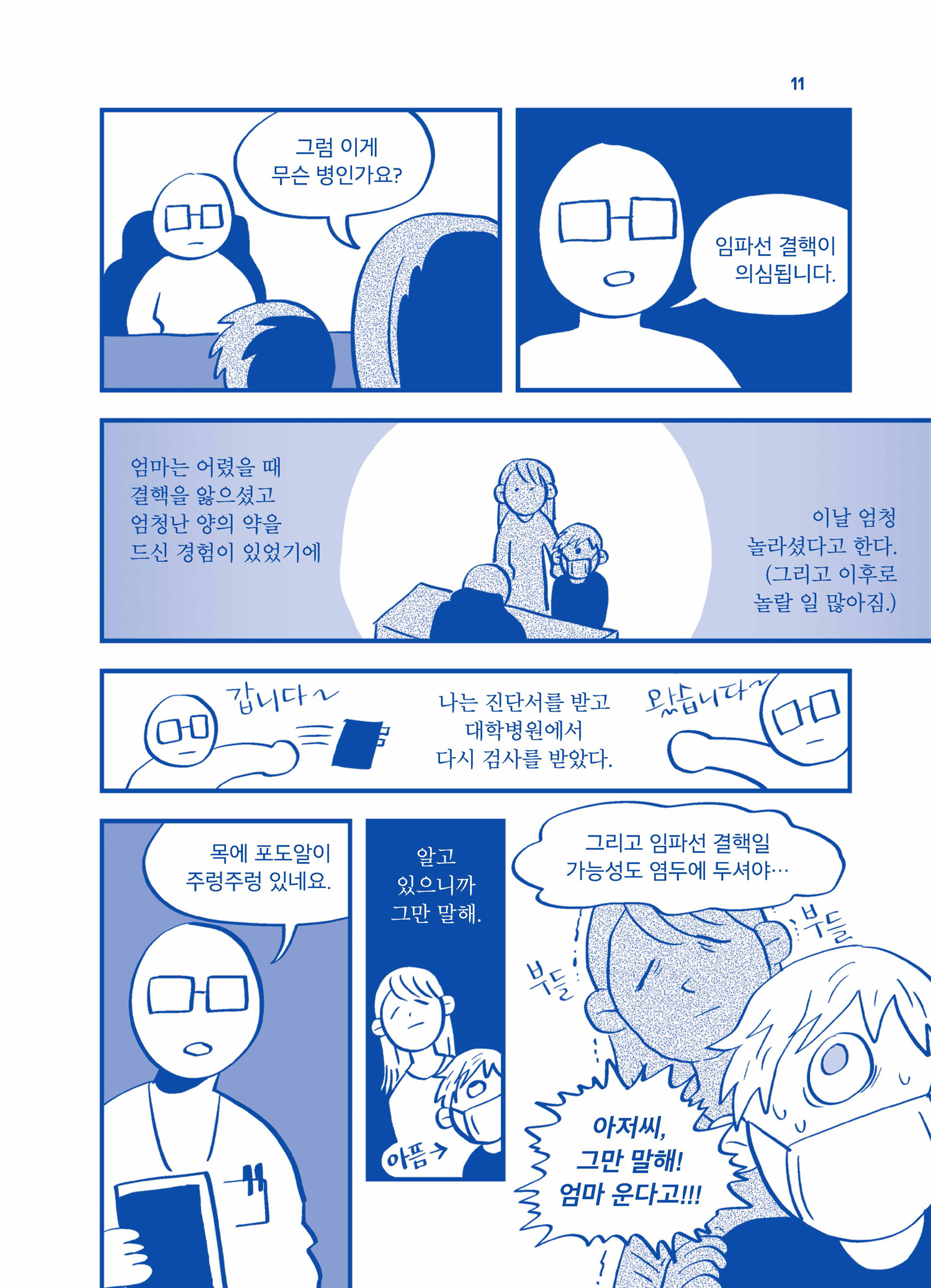그런데 만화가가 그린, 늘 앓는 주인공은 참 경쾌하다. ‘두근두근’을 동반한 ‘비틀비틀’ 앞에서는 보는 사람도 두근거리고 비틀거리는 춤을 추게 된다. 그리고 어쩐지 이 작품을 읽을 때마다 엄마와 아빠가 보고 싶어지곤 한다. 약해져서이든 강해져서이든 ‘이게 나’ 싶은 순간과 닿는다는 건, 그런 걸 만화로 촉진한다는 건 멋진 일이다. 나 자신이 그리 크지 않고 다르지 않고 무른 존재라고 안심하게 해주는 모든 콘텐츠를 좋아하지만, 그중에서도 오래오래 좋아하는 건 역시 누굴 그립게 만드는 것들이다.