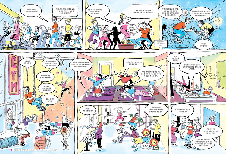 『초인적 힘의 비밀』은 운동을 매개로 문학과 카운터 컬처, 동양 철학과 불교의 깨달음을 동시에 다룬다. 벡델이 집중하는 것은 ‘초월’이다. 『펀 홈』에서 문학과 예술을, 『당신 엄마 맞아?』에서 페미니즘과 정신 분석을 이야기에 솜씨 좋게 녹여낸 벡델의 지성은 여전하다. 운동 장비 창고에서 낭만주의 시인 윌리엄 워즈워드와 새뮤얼 테일러 콜리지를 소환하고, 스키를 타며 마거릿 풀러와 랄프 왈도 에머슨과 소로우의 초월주의를 미끄러지듯 탐색하며, 산악용 자전거를 타고 캠핑을 하다 잭 케루악의 『다르마 행려』를 읽는다. 등산을 하며 『금강경』과 『선심초심』의 깨달음에 가닿거나 코로나 혼란 속에서 숲을 산책하며 에이드리언 리치 시집 『공통 언어를 향한 꿈』의 「초절기교 연습곡」을 읊기도 한다. 대자연 속에서 몸을 움직이며 느낀 “반짝하는 초월과 기쁨의 순간”은 문학 철학 종교의 깨달음과 별개가 아니다. 벡델은 자기와 타자, 자연과 인간, 몸과 정신의 상호의존성을 소중하게 품으며 몸의 움직임과 생태주의, 비거니즘, 젠더 인종 정치를 유기적으로 연결한다.