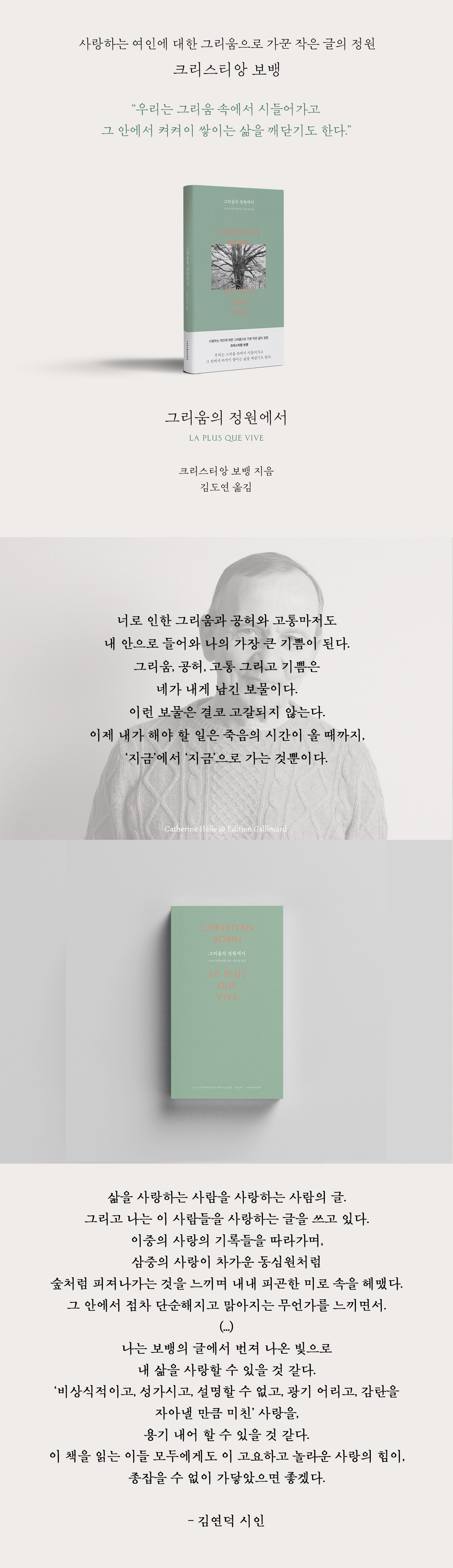 프랑스가 사랑하는 시인이자 에세이스트, 크리스티앙 보뱅이 사랑하는 여인을 잃고, 그녀에 대한 그리움으로 가꾼 작은 글의 정원 『그리움의 정원에서』가 1984Books에서 출간되었다. 그녀의 이름은 ‘지슬렌 마리옹’, 1979년 가을에 처음 만나, 그로부터 줄곧 그가 가장 바쁘고도 고요한 방식으로 사랑한 여자. 1995년 여름 파열성 뇌동맥류로 세상을 떠나고, 같은 해 가을과 겨울, 크리스티앙 보뱅은 형언할 수 없는 상실감을 넘어서 그만의 섬세하고 부드러운 목소리로 여전히 생생한 그녀의 모습을 이 책 속에 담았다.