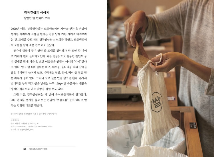 어디까지나 이 기록의 시작은 ‘사람들이 공유한 목소리를 함께 나누기 위해서’였다. 시작해보는 사람들의 목소리가 힘겹지만은 않고 밝고 즐거웠다는 것. 앞으로도 해볼 수 있겠다는 활기찬 의지가 있다는 것. 아직 해보지 않은 사람들에게 이 사실을, 그리고 이제 막 경험해보고 바뀌어 가고 있는 가게의 이야기를 전하고 싶었다. 이곳저곳 통을 들고 다니며 질문을 건넸을 동네 사람들을 상상하니 귀여워 웃음이 지어진다. 이들 발걸음이 하나하나 보태지면 지금의 견고한 시스템에 틈을 만들 수 있지 않을까. -9p, 「머리말」