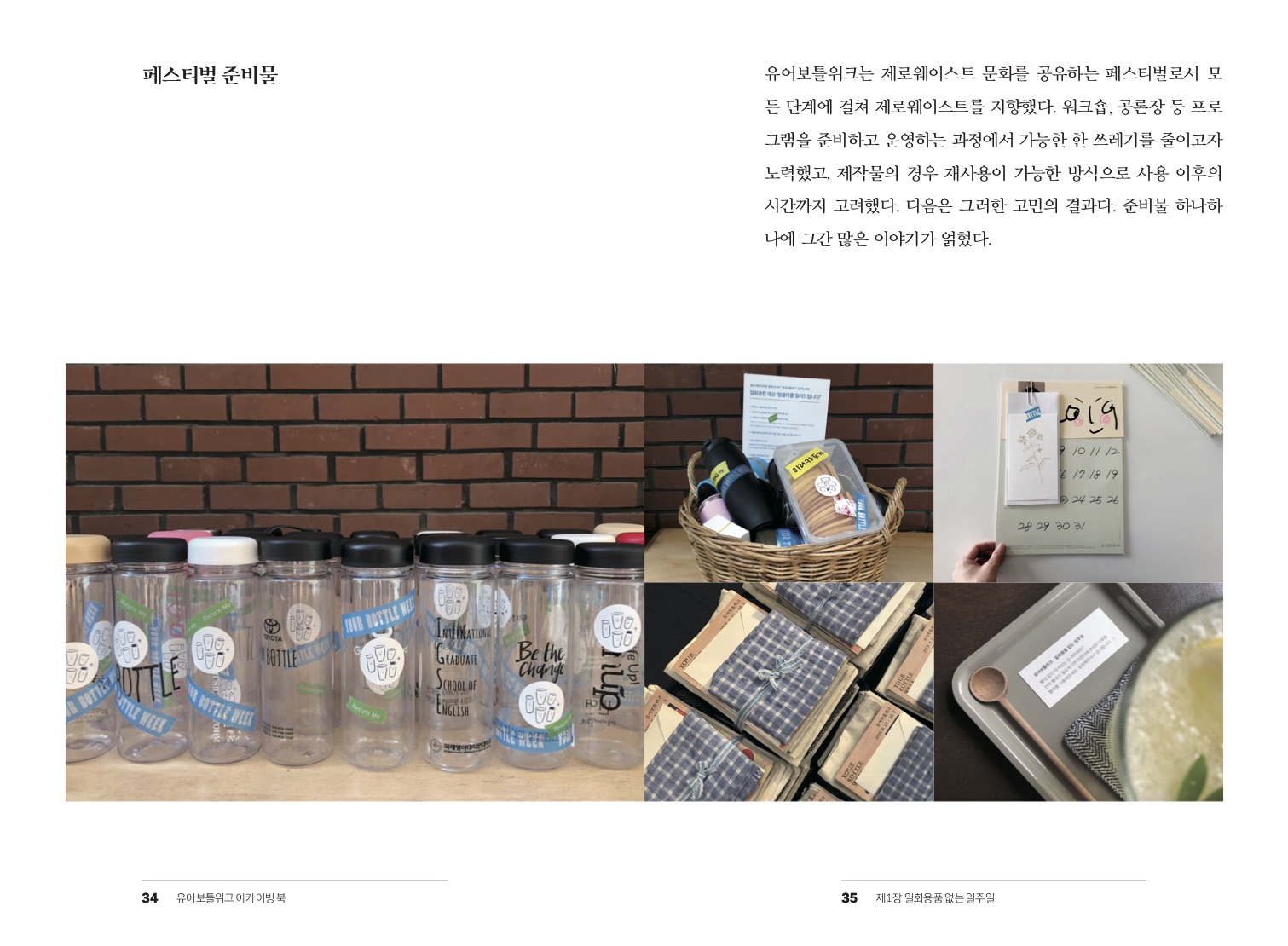책에는 세 장에 걸쳐 각기 다른 층위의 목소리가 담겨있다. 각 장의 제목은 순서대로 첫째, 둘째, 셋째 유어보틀위크 행사의 슬로건이다. ‘제 1장 일회용품 없는 일주일’에서는 유어보틀위크를 시작한 계기와 의도를 설명하며 그간 행로를 되돌아보고, ‘제2장 우리 동네에서 시작되는 변화’는 유어보틀위크에 참여한 동네 가게 다섯 곳의 인터뷰,? ‘제3장 버릴 것 없이 채우는 일상’은 유어보틀위크에 참여해 무포장 구입을 실천한 사람들의 이야기다.