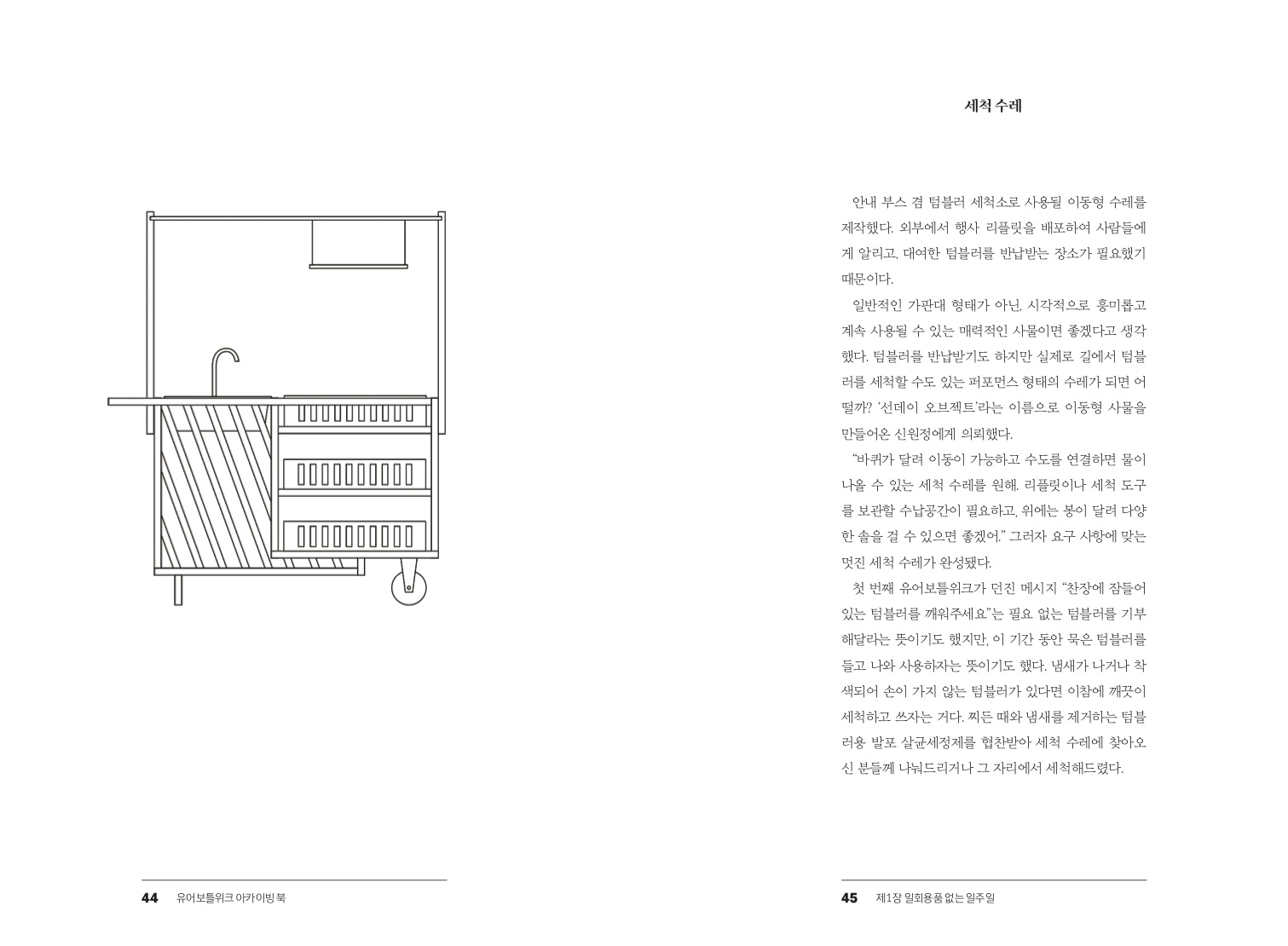 첫해 슬로건이 "일회용품 없는 일주일"이었는데, 그 일주일이 중요했어요. '해보자' 하면 어려운데 '일주일만 해보자' 하면 덜 어렵잖아요. 오래전에 《고메위크》나 《백반위크》 같은 행사 리플렛을 받아 보고 재밌다고 생각한 적이 있어요. 그렇게 하면 좋겠다 싶었습니다. 캠페인처럼 행동을 바꾸라고 크게 외치기보다는, 재미있는 이벤트를 열어서 같이하는 공간에 가보고 싶게 만드는 걸 지향하면서요. -18p, 「일회용품 없는 일주일」