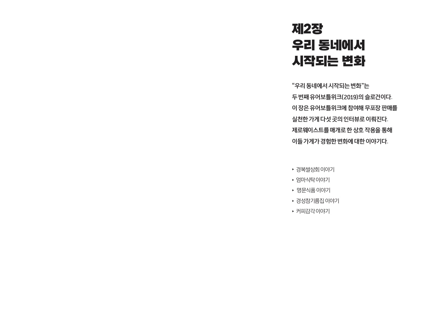 '우리 동네'라는 키워드와 함께 '시작'이라는 키워드도 포인트였어요. 변화의 시작이 되는 경험. 유어보틀위크가 그 시작의 경험을 제공하면 좋겠다고 생각했거든요. 포장 용기를 들고 가게에 가는 일은 이미 생각과 의지가 있어서 하는 행동인데, 무심코 들어간 가게의 환경이 바뀌어 있는 경우는 다르잖아요. 행사 기간에 가게 환경을 바꿔놓음으로서 ‘무조건 일회용품 안써야 해’가 아니어도 그와 비슷한 제안을 하는거죠. 모르고 가도 해볼 수 있고. 그게 주요했습니다. -23p, 「일회용품 없는 일주일」
