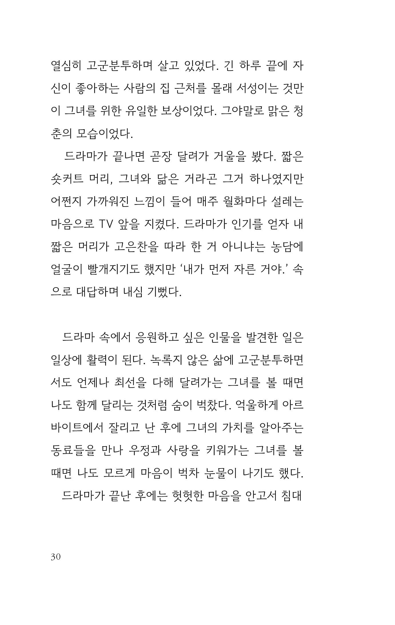 연기를 하며 가장 지칠 때는 오디션에 탈락을 할 때가 아니라 아무런 피드백이 없을 때다. 긴 시간 연기를 해왔지만 관객을 만날 기회는 많지 않았다. 침묵과 가까운 시간을 지날 때면 내가 제대로 하고 있는 게 맞을까 하는 생각에 힘이 빠지곤 했다. 그런데 오늘 나의 글을 읽으며 자유롭게 감상을 나누는 이들을 마주하니 마치 관객을 만난 배우가 된 것처럼 기뻤다. 나의 이야기가 무대와 영화가 아닌 글이라는 통로로도 충분히 전해질 수 있다는 사실을 처음 느낀 순간이었다. 다시금 삶의 주인공으로서 내 몫을 다해 살아가겠다는 다짐을 한다. 무대에서든, 영화에서든, 책에서든 나의 이야기가 진심으로만 빛날 수 있도록. 아직 나의 이야기는 관객을 만나지 못한 상영 예정작이지만 기대되는 예고편을 가지고 관객들을 기다려야겠다고, 그런 다짐을 했다. —124p <상영 예정작>