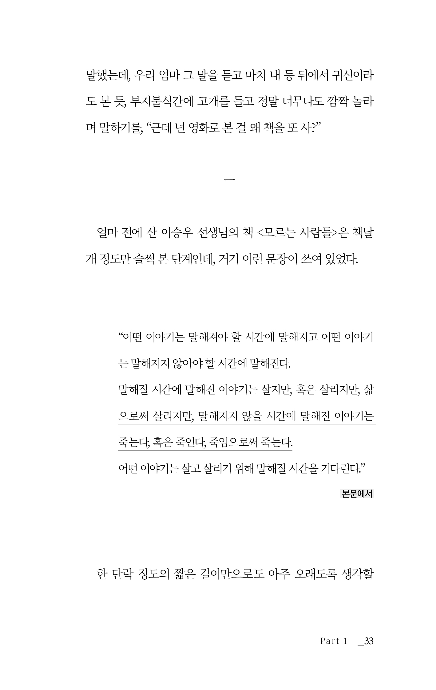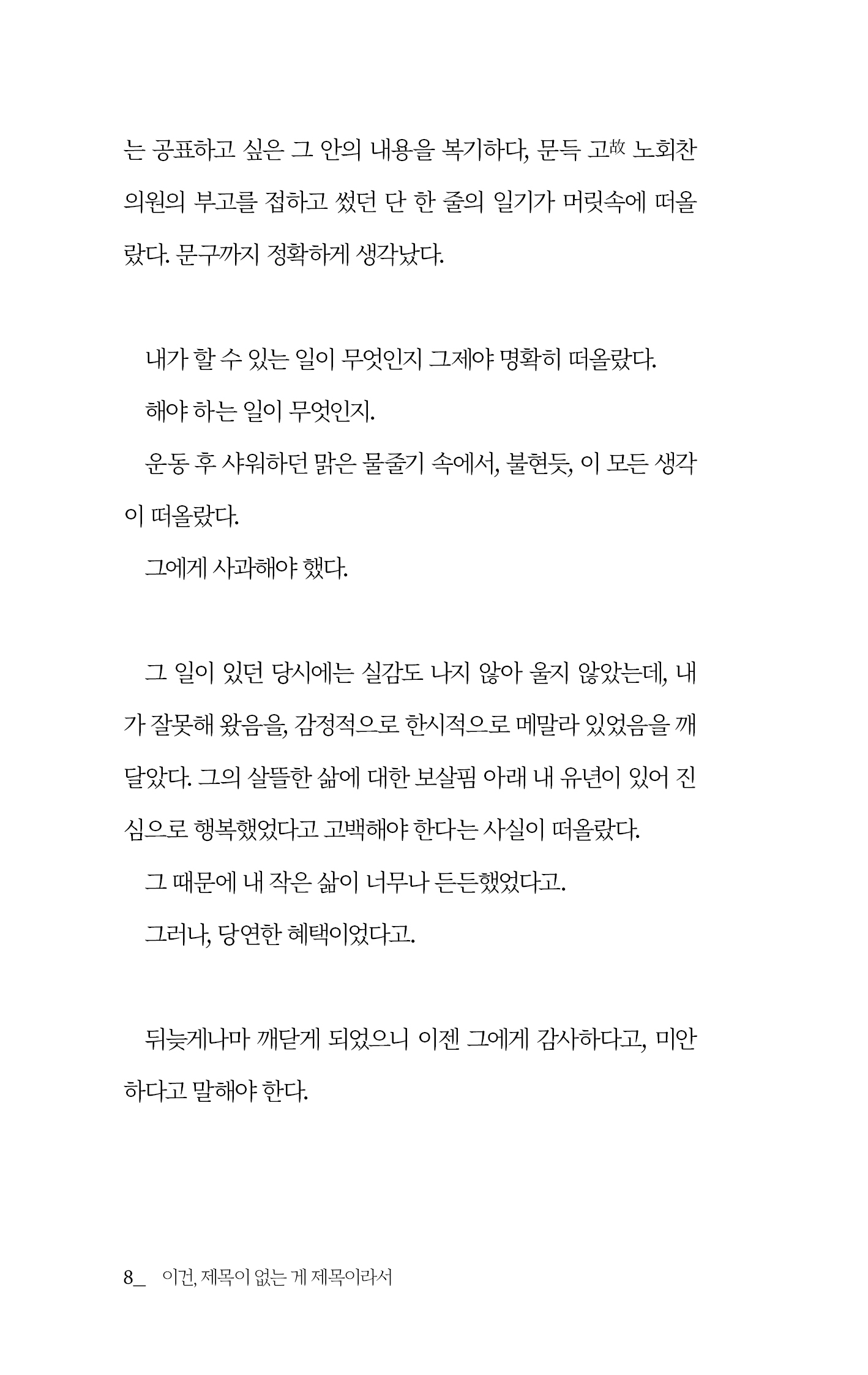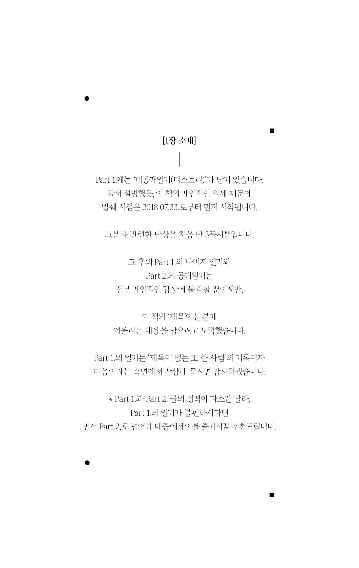 1, 2부로 나누어진 글은 개인적 일기와 대중적 에세이의 결합으로 구성되어 있습니다. 글과 사람, 삶의 등가성을 추구하기 위해 “제목을 지을 수 없는 책”이라는 책의 속성을 떠올렸고, 글이 어느 정도 모인 즈음에야 책의 제목을 선물해야 할 사람이 저편에서 떠올라 비로소 책이 의미를 얻게 되었음도 깨달았습니다. 그런 이유로 이 책의 에필로그는 가장 먼저 쓰였고, 프롤로그는 가장 나중에 쓰였습니다.