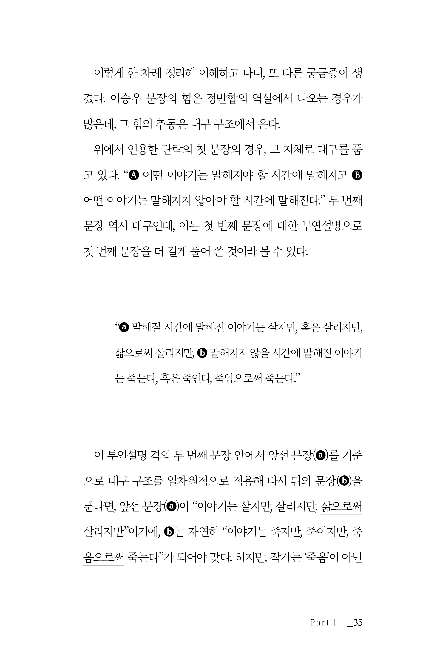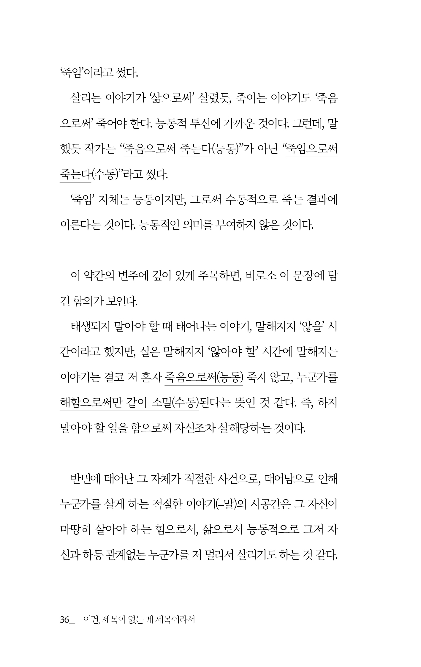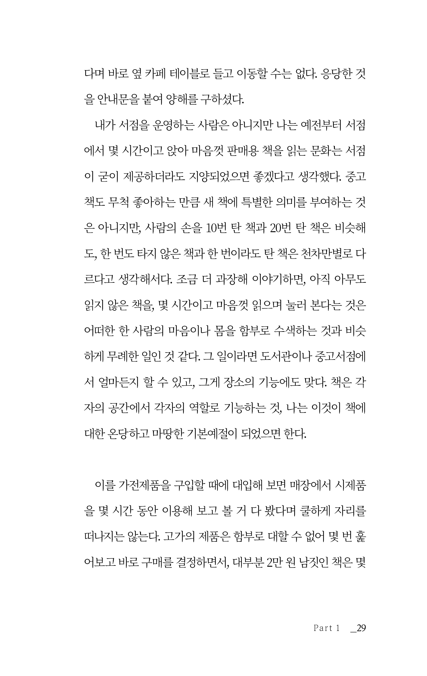 1, 2부로 나누어진 글은 개인적 일기와 대중적 에세이의 결합으로 구성되어 있습니다. 글과 사람, 삶의 등가성을 추구하기 위해 “제목을 지을 수 없는 책”이라는 책의 속성을 떠올렸고, 글이 어느 정도 모인 즈음에야 책의 제목을 선물해야 할 사람이 저편에서 떠올라 비로소 책이 의미를 얻게 되었음도 깨달았습니다. 그런 이유로 이 책의 에필로그는 가장 먼저 쓰였고, 프롤로그는 가장 나중에 쓰였습니다.