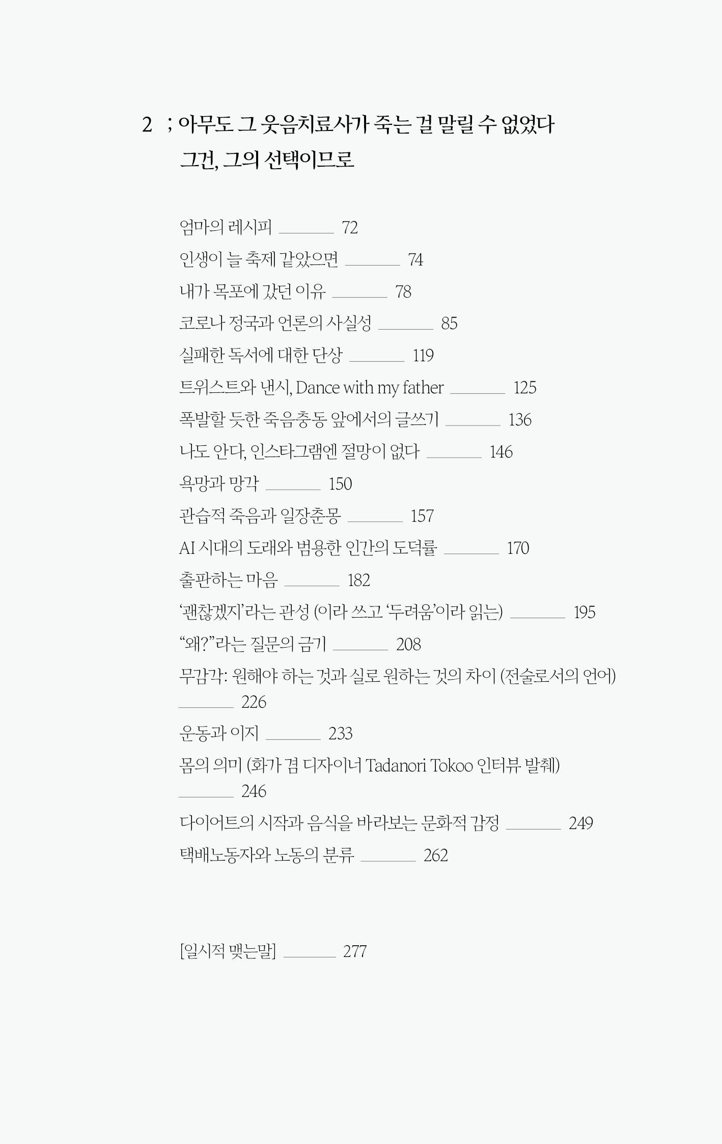 엄마의 레시피 / 인생이 늘 축제 같았으면 / 내가 목포에 갔던 이유 / 코로나 정국과 언론의 사실성 / 실패한 독서에 대한 단상 / 트위스트와 낸시, Dance with my father / 폭발할 듯한 죽음충동 앞에서의 글쓰기 / 나도 안다, 인스타그램엔 절망이 없다 / 욕망과 망각 / 관습적 죽음과 일장춘몽 / AI 시대의 도래와 범용한 인간의 도덕률 / 출판하는 마음 / ‘괜찮겠지’라는 관성 (이라 쓰고 ‘두려움’이라 읽는) / “왜?”라는 질문의 금기 / 무감각: 원해야 하는 것과 실로 원하는 것의 차이 (전술로서의 언어) / 운동과 이지 / 몸의 의미 (화가 겸 디자이너 Tadanori Tokoo 인터뷰 발췌) / 다이어트의 시작과 음식을 바라보는 문화적 감정 / 택배노동자와 노동의 분류
