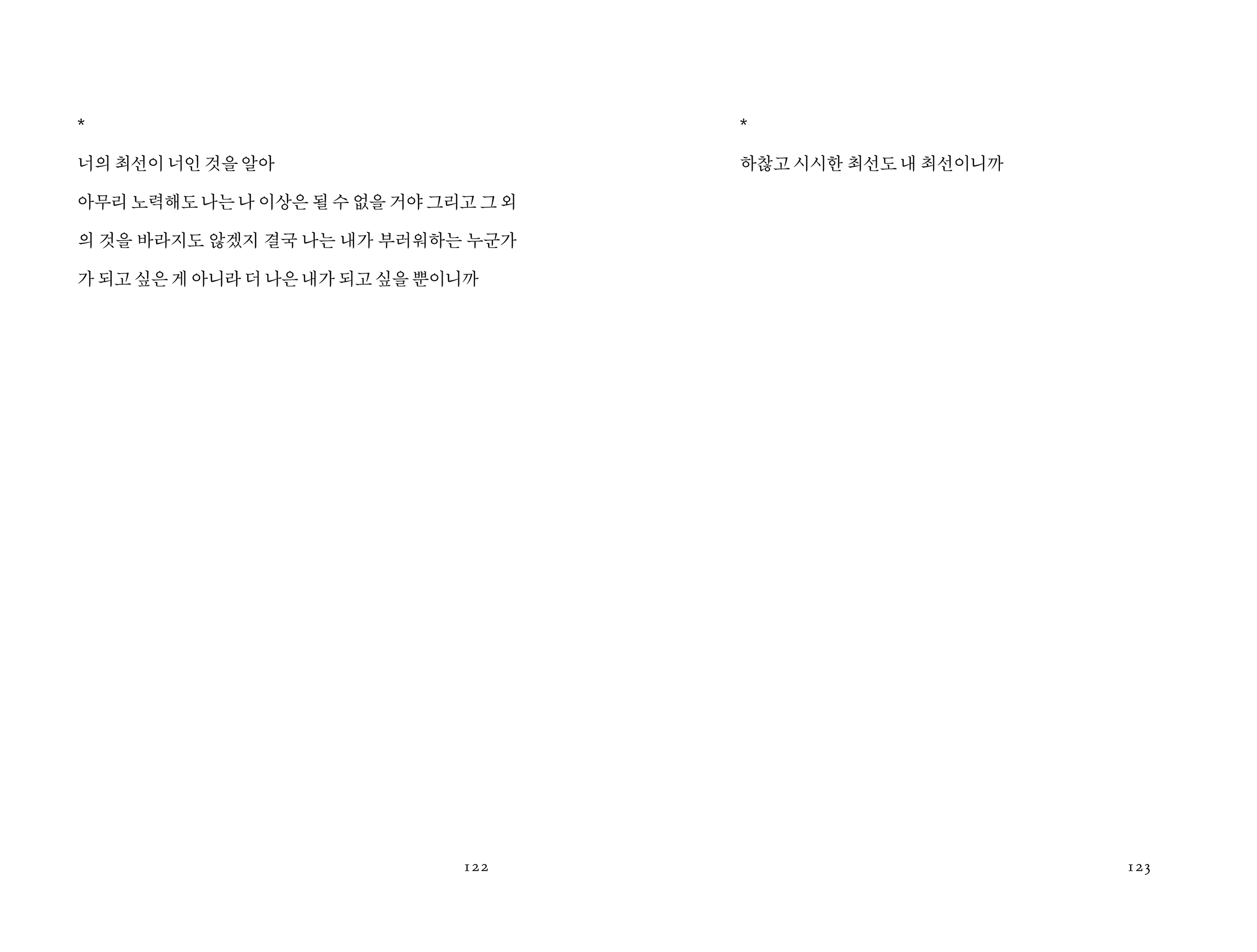 아무리 노력해도 나는 나 이상은 될 수 없을 거야 그리고 그 외의 것을 바라지도 않겠지 결국 나는 내가 부러워하는 누군가가 되고 싶은 게 아니라 더 나은 내가 되고 싶을 뿐이니까 –– 122p