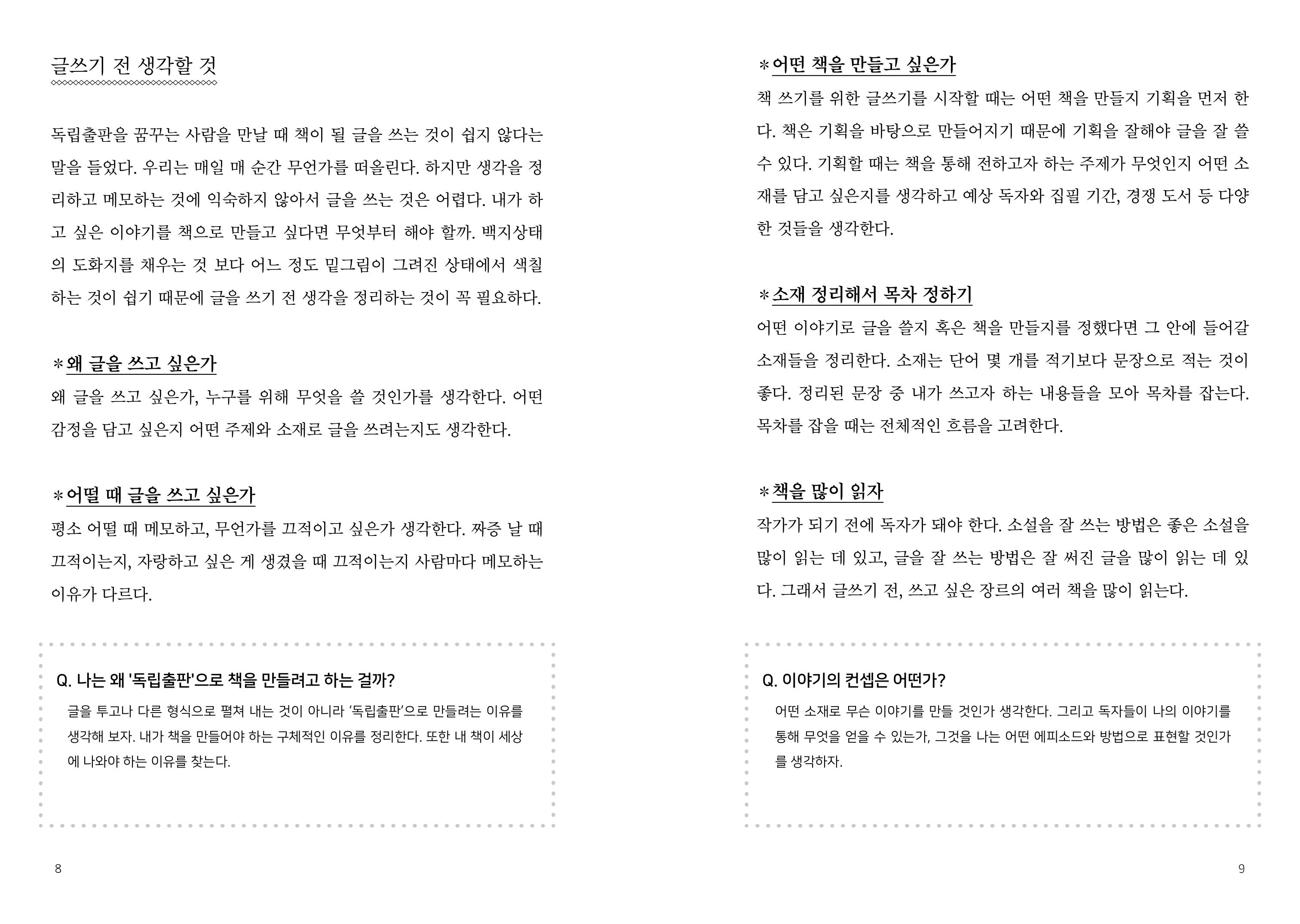 독립출판을 하고 싶은 예비작가들을 위한 글쓰기 노하우를 담은 책이다. 작고 얇은 책 속에 글쓰기 전 생각할 것과 나를 마주하는 질문들, 에세이 쓰기, 시 쓰기, 소설 쓰기, 글 고치기의 내용을 담았다. 이 책을 통해 막연히 꿈꾸던 독립출판의 꿈에 한 걸음 다가가길 바란다.