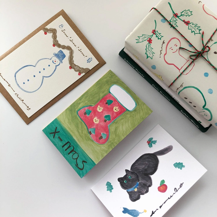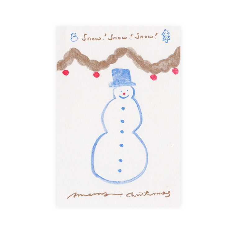 눈사람이 그려진 크리스마스 카드세트입니다. 미색의 폭폭한 지질감이 느껴지는 문켄프린트크림 종이에 리소그라프 3도로 인쇄했습니다. 크라프트 봉투 1매가 들어있습니다.