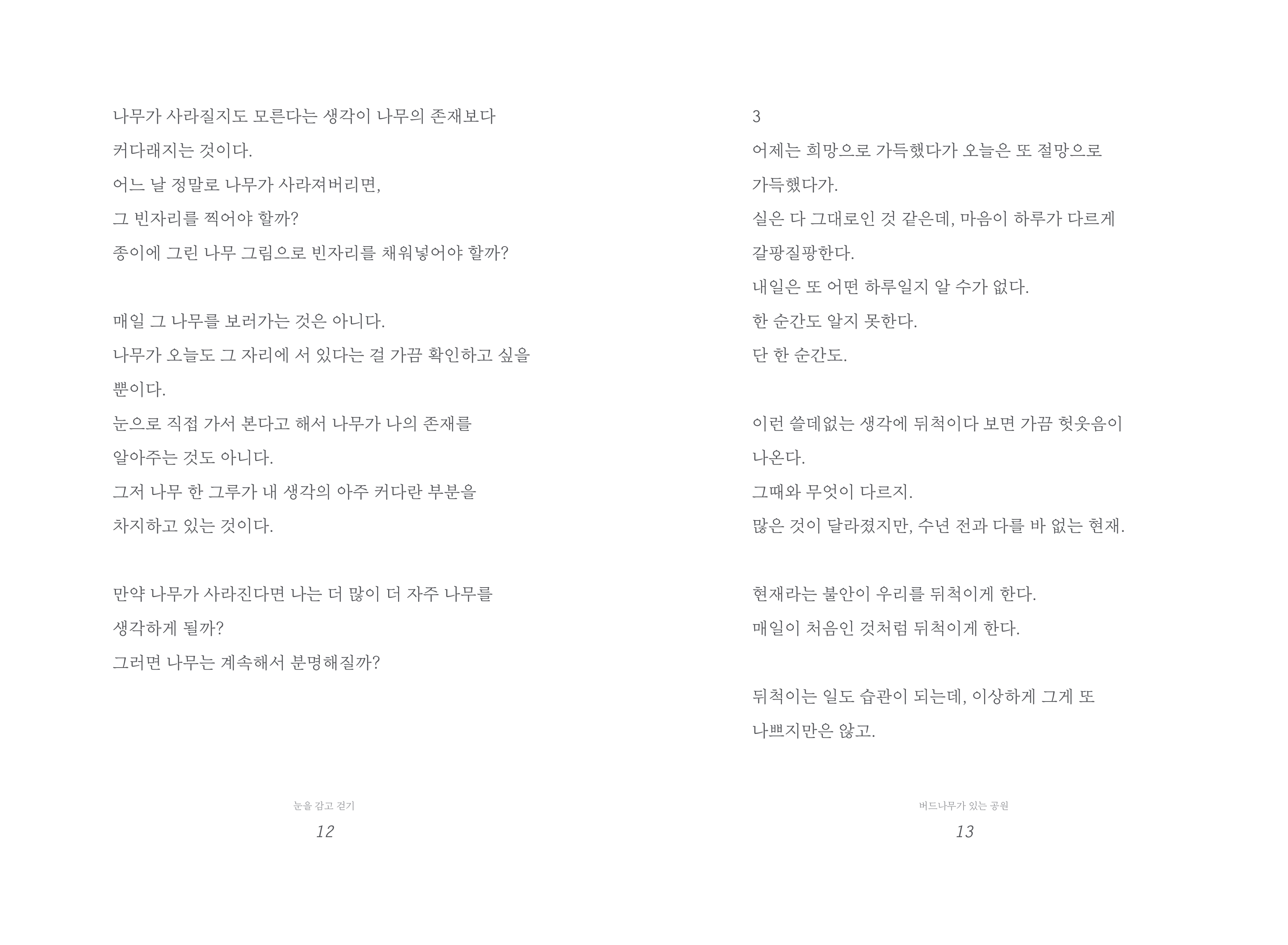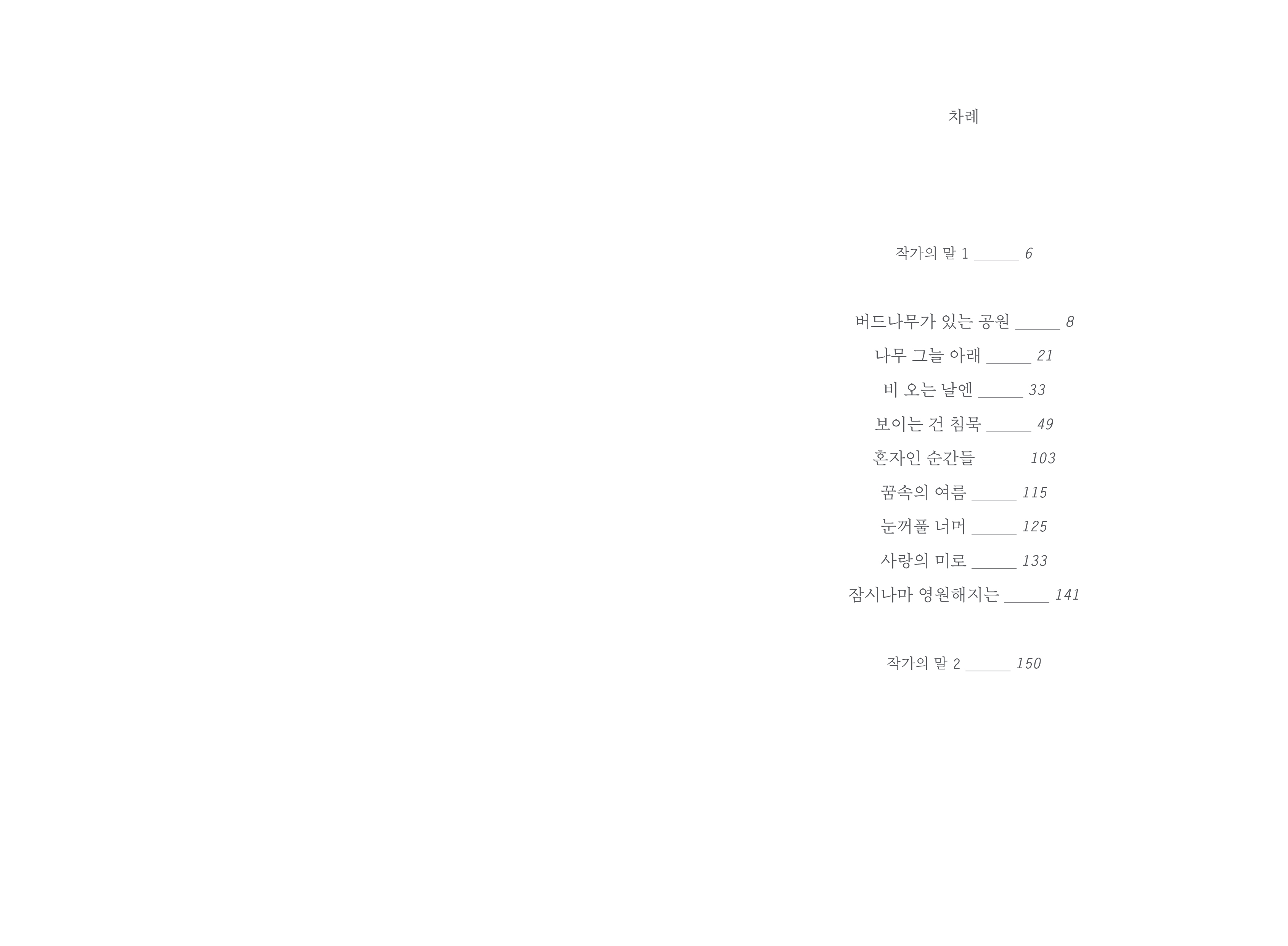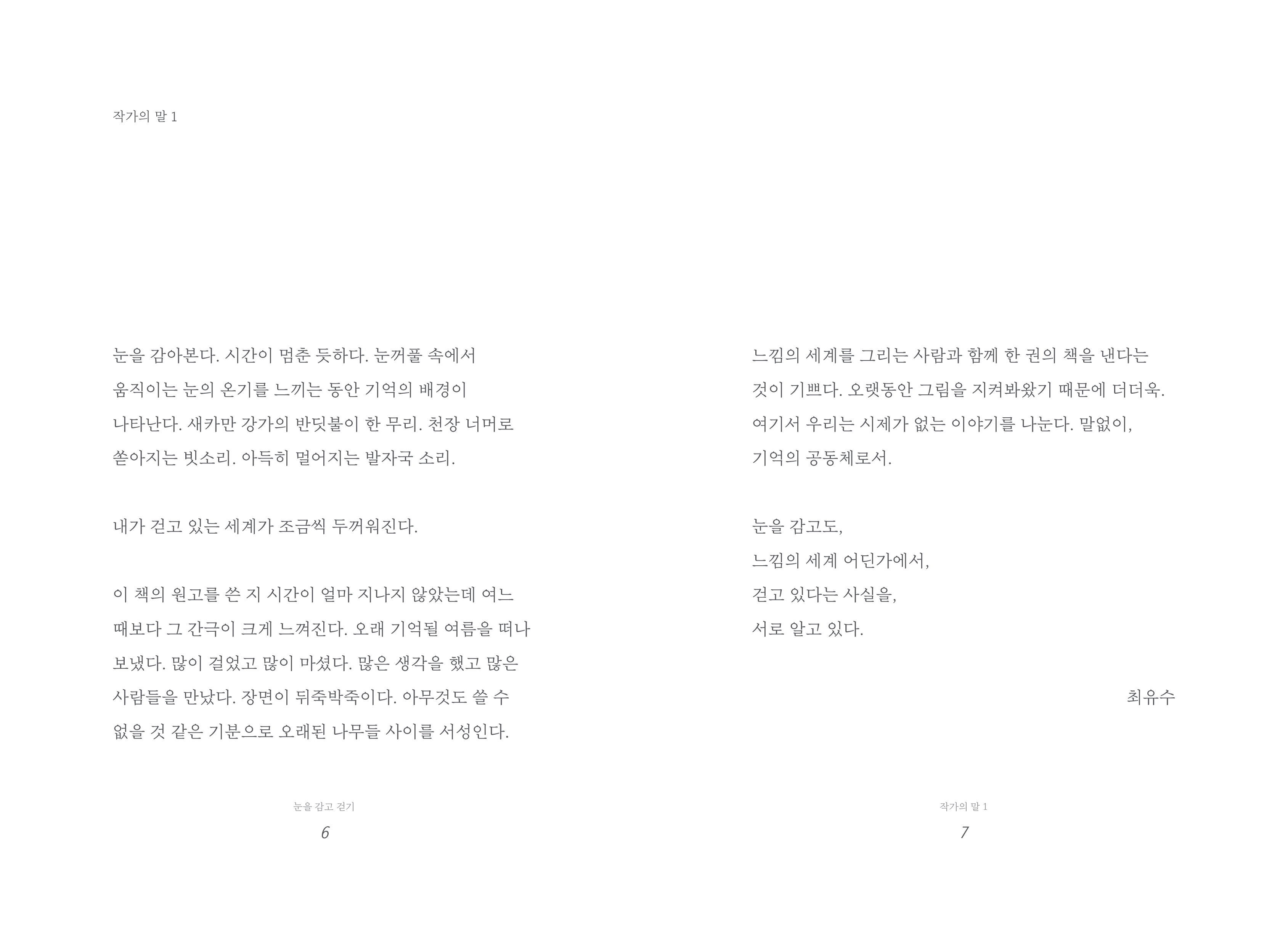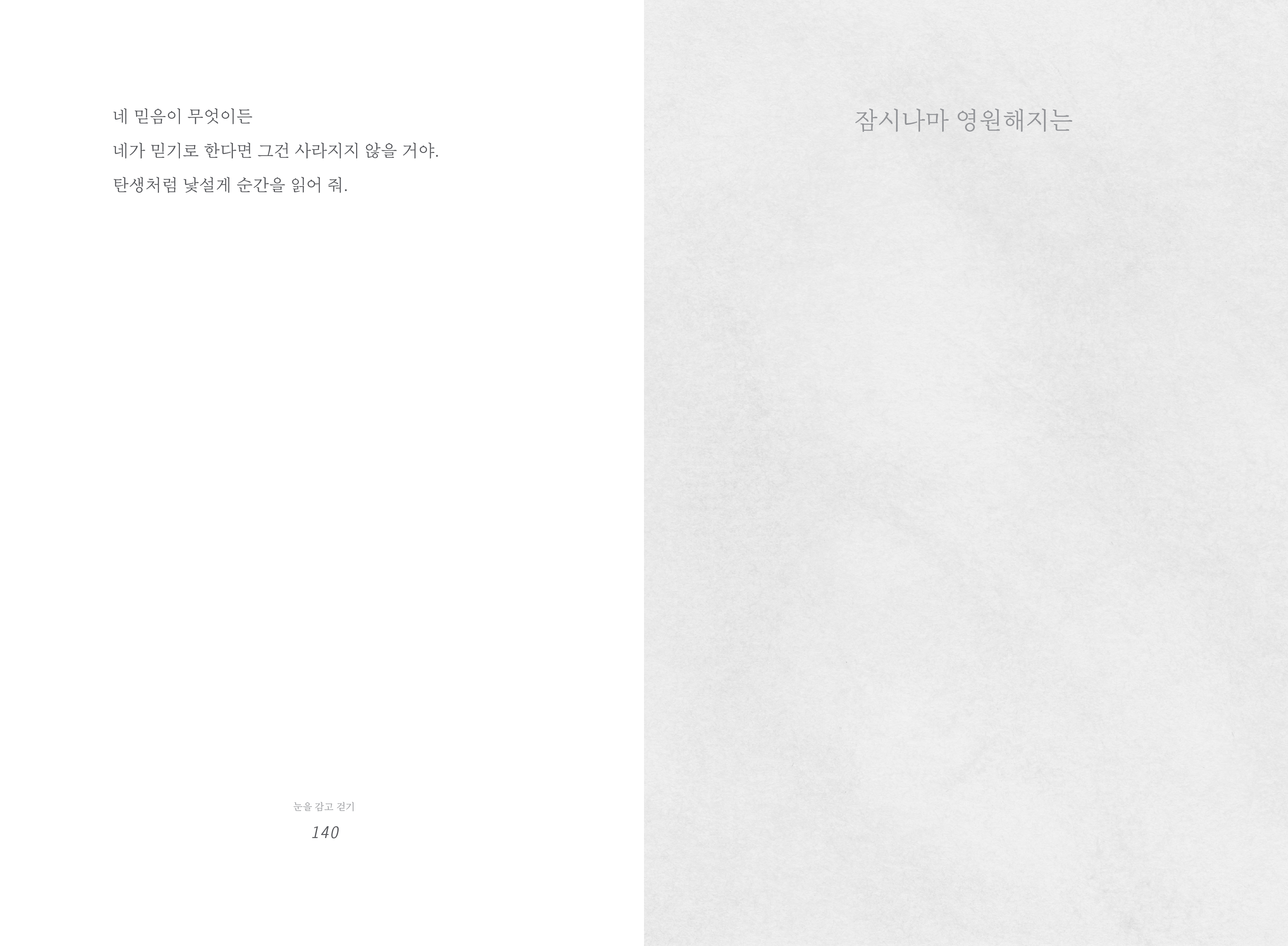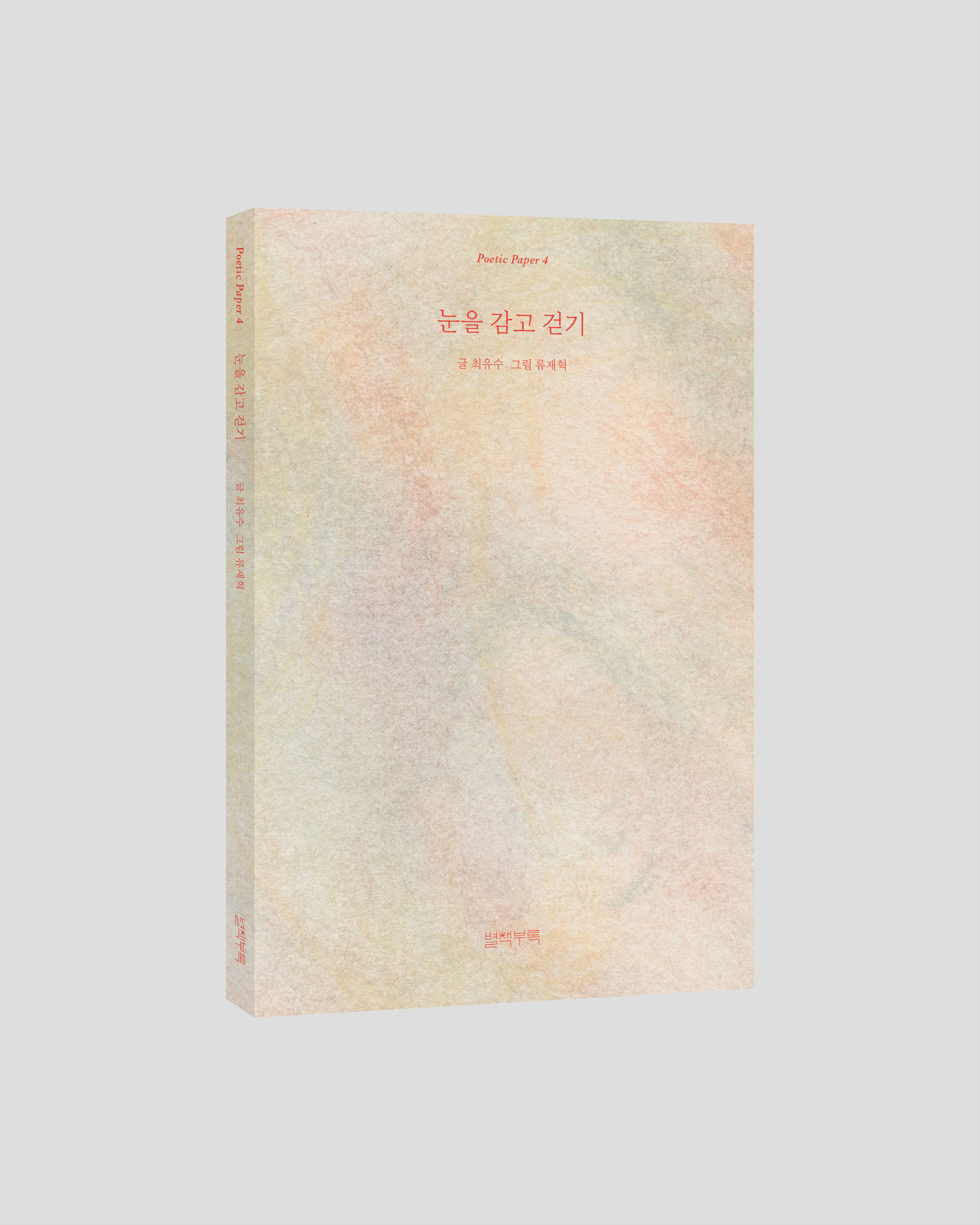 네 번째 책에서는 최유수, 류재혁 두 작가가 불안과 믿음의 감각을 떠올릴 수 있는 글과 그림으로 함께했습니다. 두 눈을 꼭 감은 풍경은 어둠이었다가 이내 밝아져 여러 색을 띠고, 불안의 감각은 곧 믿음의 감각이 됩니다. 눈을 감아야만 비로소 분명해지는 것들이 있습니다. 두 사람이 번갈아 눈을 감고 서로를 인도하여 걷거나 산책하고 돌아오는 시간의 길을 함께 걸어주세요.