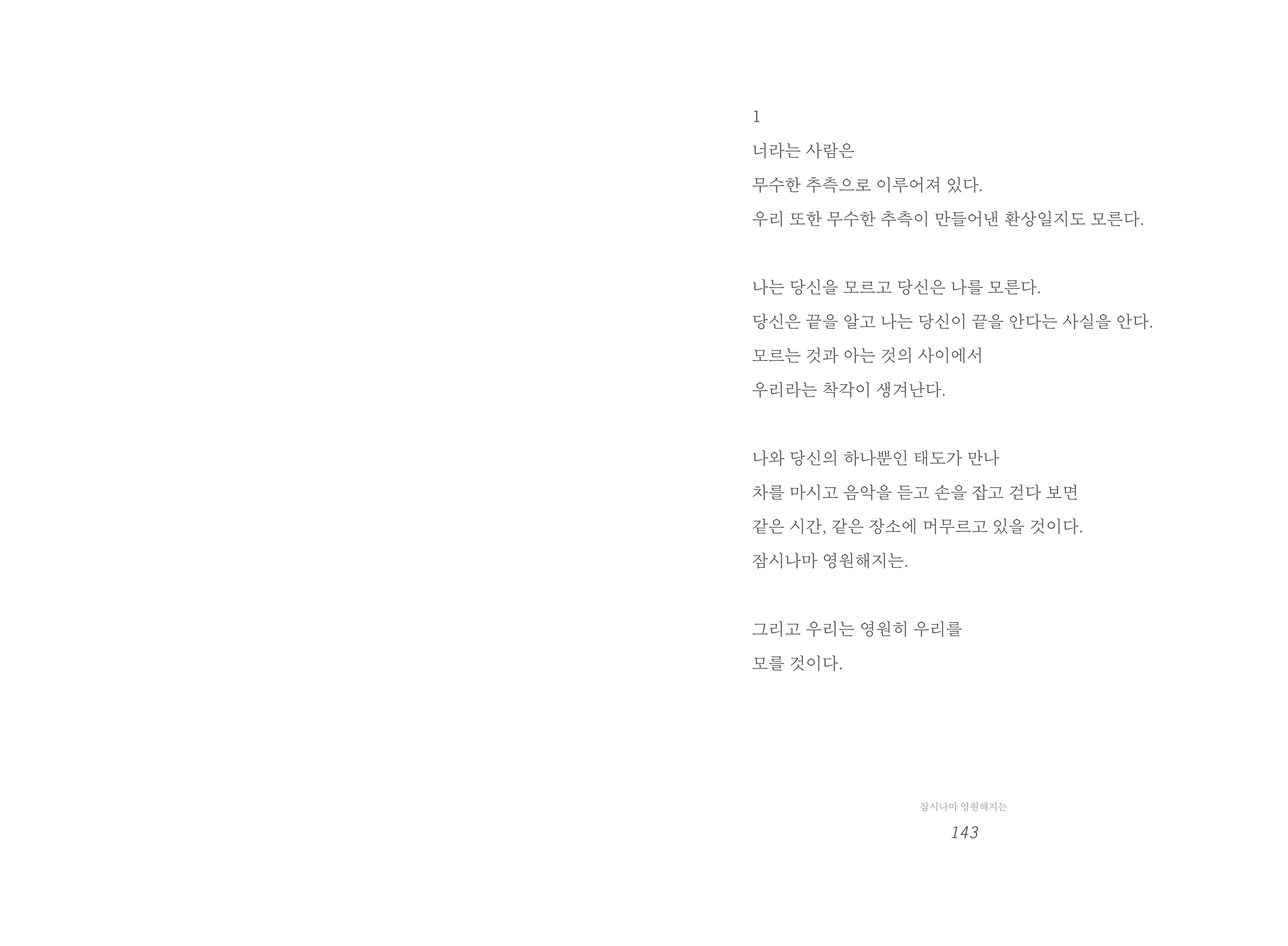 사랑은 그 사람과의 사소한 순간들 속에서 슬픈 영원을 발견하는 일이다.