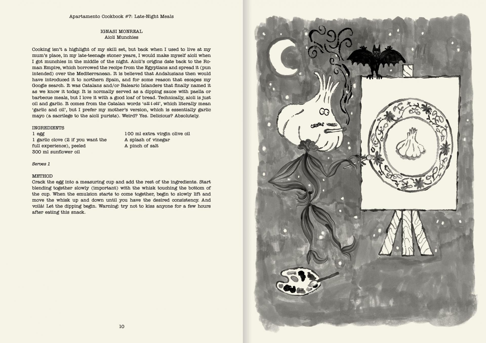From sleep-inducing mackerel salad to hangover-preventing onion soup, the meditative preparation of Nigerian alkaki or a quick fix of refried Georgian khinkali, simple aioli to feed your munchies and syrupy waffles for your sweet tooth, as well as your choice of two salty sandwiches from Italy and the Basque Country, whatever’s keeping you up, we’ve got the recipe for it. So, for all you night owls out there, we proudly present Apartamento Cookbook #7: Late-Night Meals, our trusty guide for nocturnal nourishment. Bon appétit and sweet dreams.