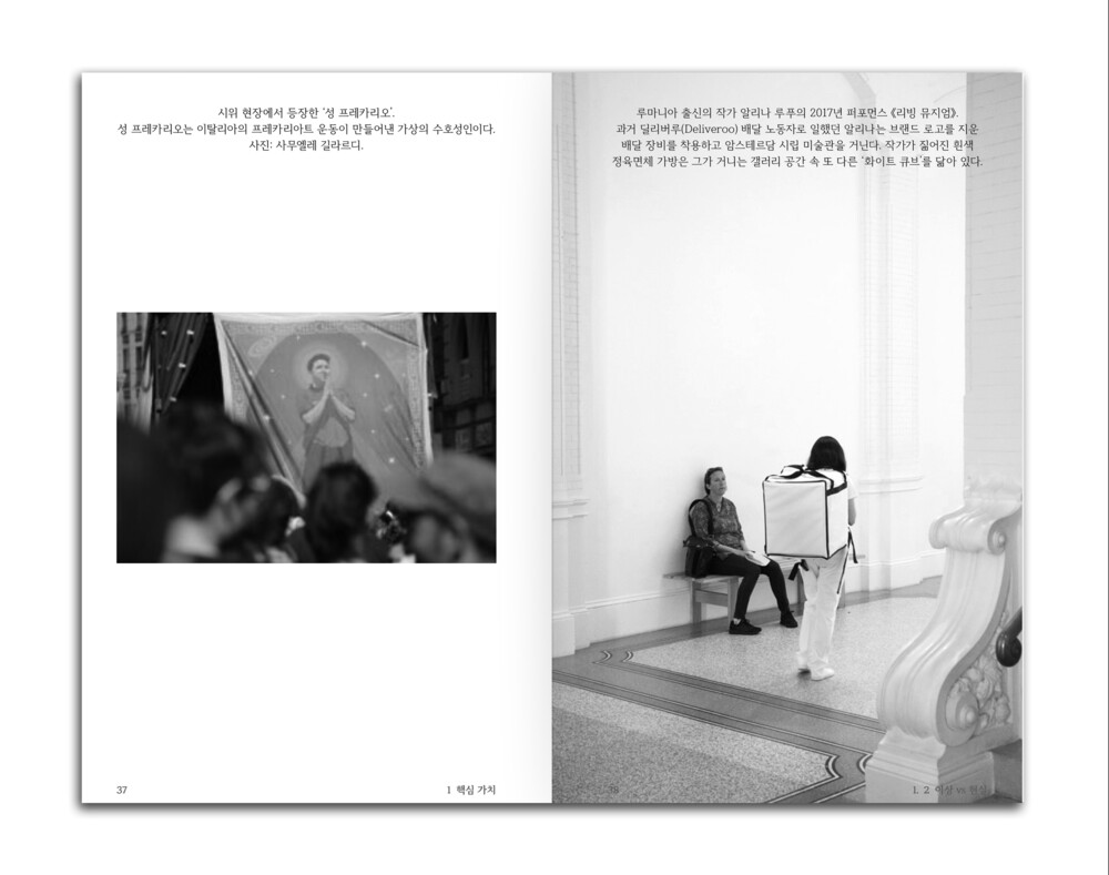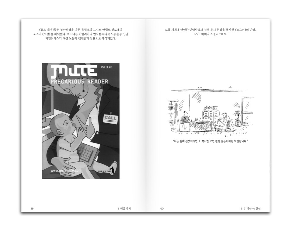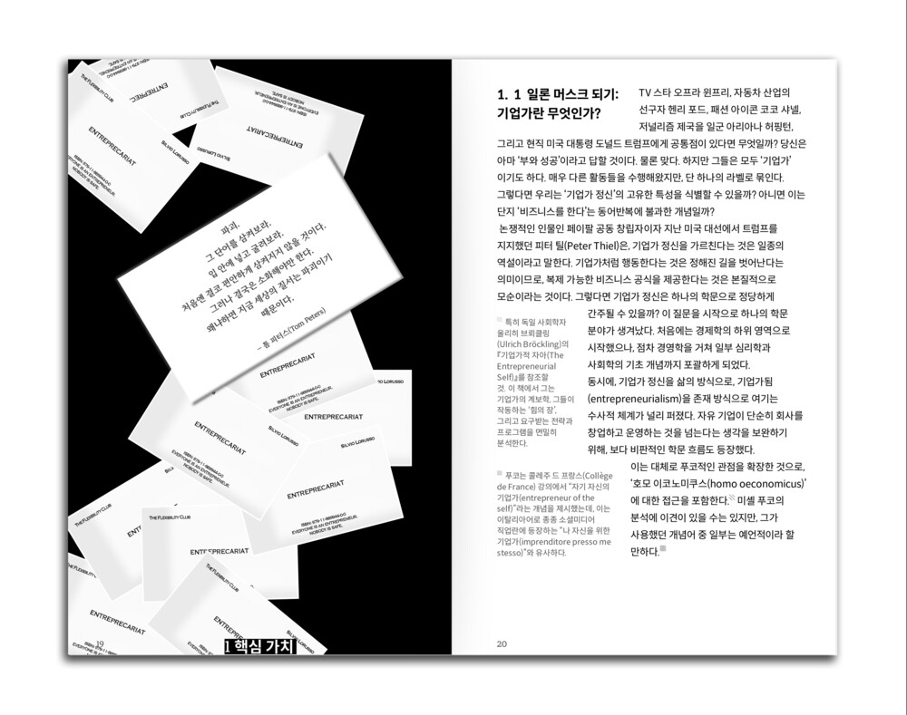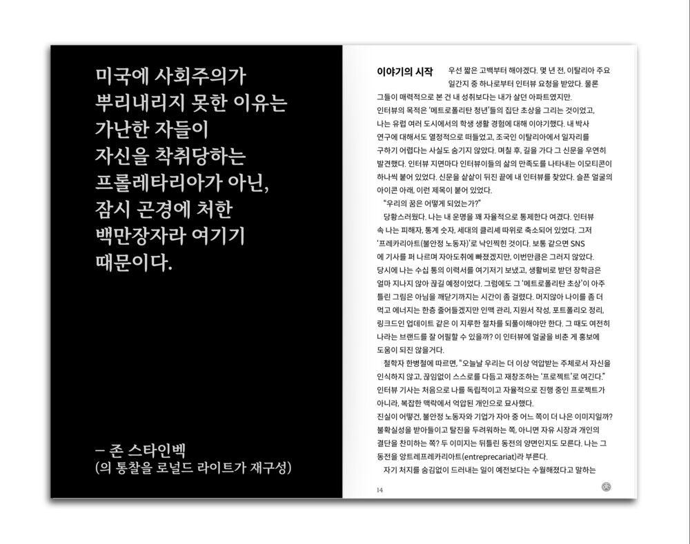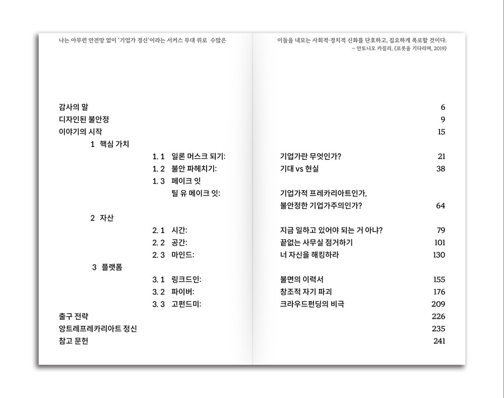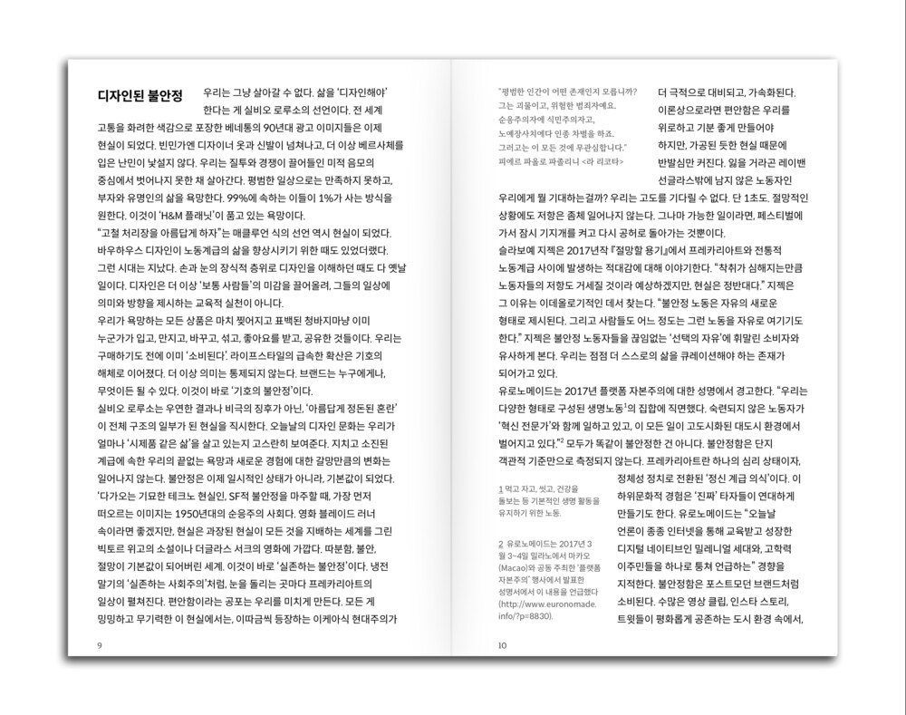 인스타그램 피드, 자기계발 명언, 재택근무 가구 광고, 스타트업 오피스 사진, ‘성장하는 나’라는 환상… 이 모든 것이 어떻게 불안정성을 포장하고 디자인하는지, 또 이렇게 디자인된 사회가 어떻게 우리가 '앙트레프레카리아트'가 되도록 가르치는 지를 디자이너의 감각과 유머로 풀어냅니다.