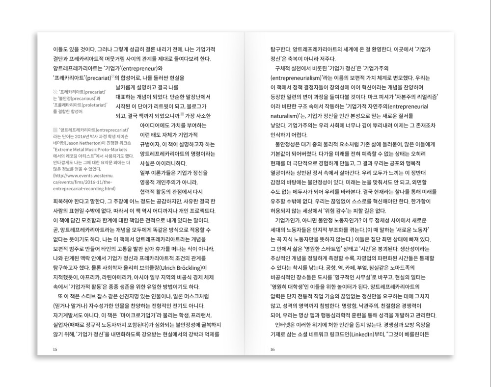 『앙트레프레카리아트』는 현재의 우리 삶을 ‘베타버전’, ‘끝없는 제안서’ 같다고 설명하는데요, 그러한 현실을 묘사하기 위해 이 책은 감정, 자아, 이미지, 온라인 플랫폼, 자기계발 콘텐츠 등에 주목합니다.