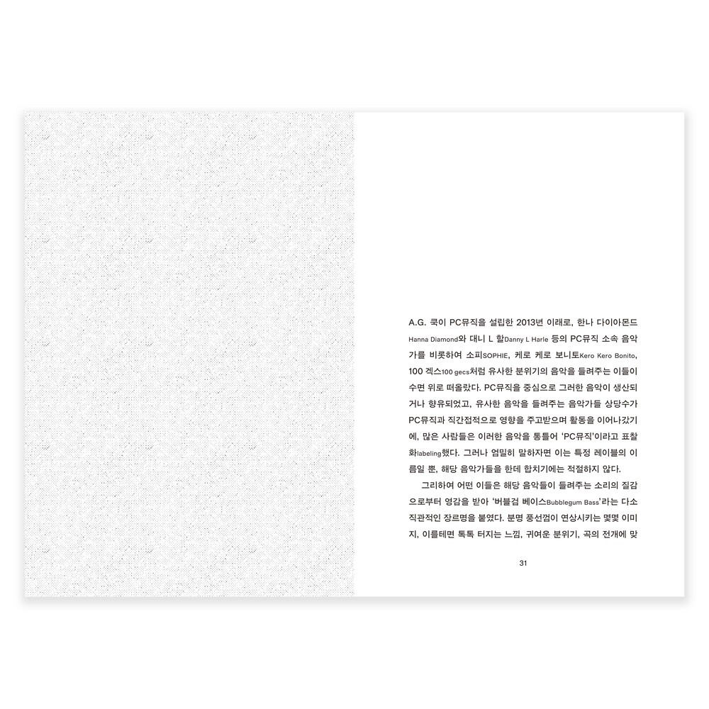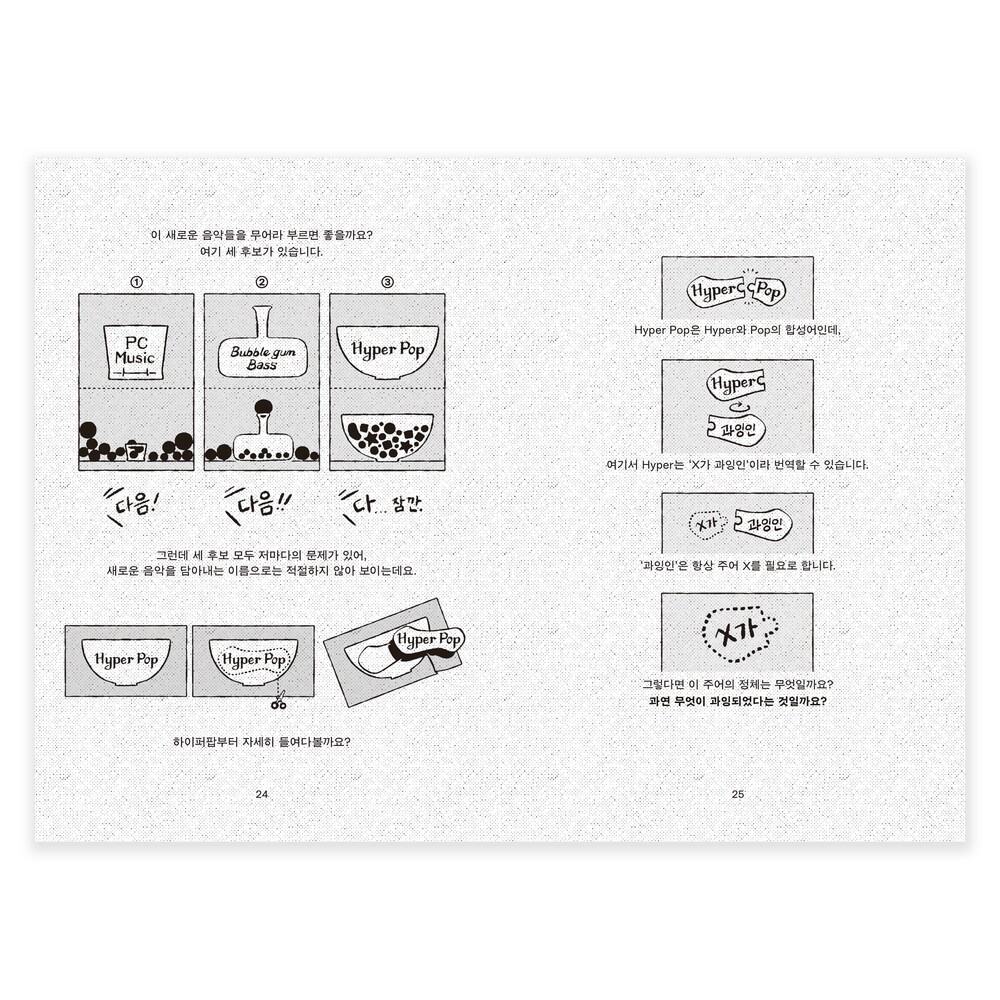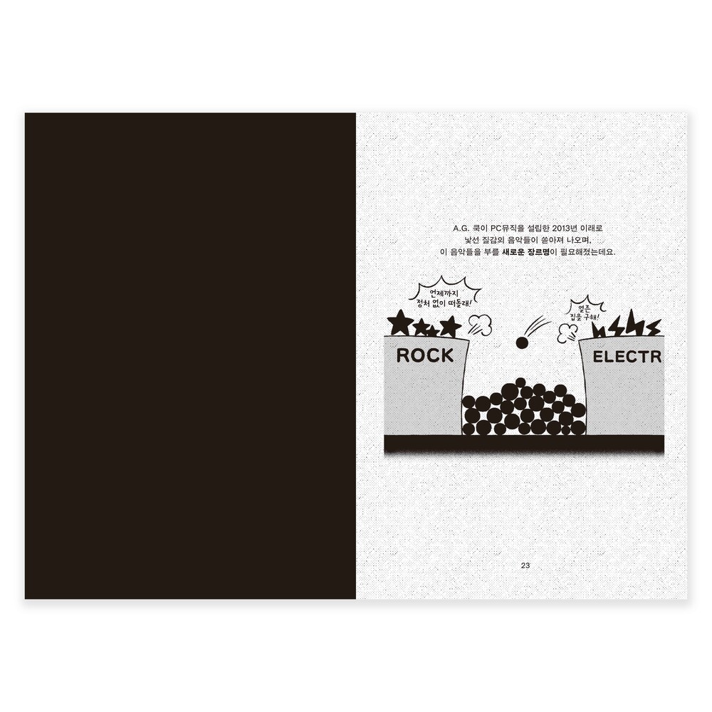 적어도 이 책의 글쓴이 전대한은 실은 '비개념'으로 보이는 여러 가지 것들이, 명료화하고자 하는 눈과 머리와 손을 거치면 '개념'이 될 수 있다고 말합니다. 2020년부터 시도하고 실천해보았고요. 그 결과 그렇게 해낼 수 있는 원리가 있고, 그 원리는 사실상 태도에 가깝다는 사실을 깨달은 것이죠. 그 원리를 이해하고 나면, 아마도 당신 역시 이전처럼 뭉뚱그려서 이야기하거나 진지한 논의는 뒷전으로 미뤄두는 식으로 음악을 감상하는 것이 더는 편하지도 즐겁지도 않아질지도요. 이러한 원리를 박지호라는 그래픽디자이너가 시각화하고, 그렇게 만들어진 형태에 만화가 실키가 옷을 입혔습니다. 더는 비개념으로 보이지 않는 아름다운 음악들을, 청자에서 독자, 독자에서 청자를 오가며 읽어보시기를 바랍니다.