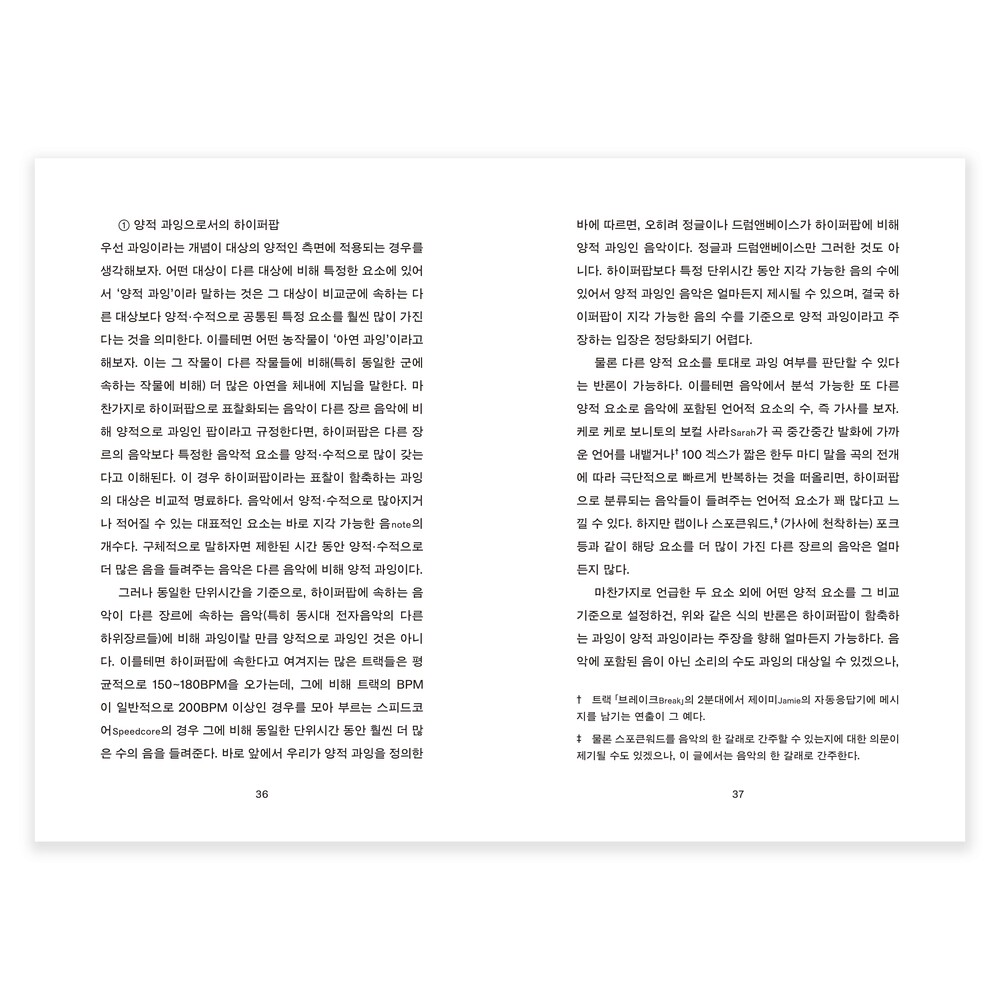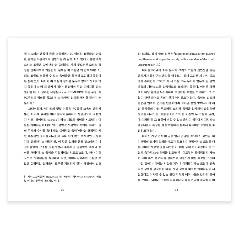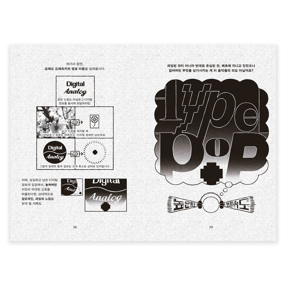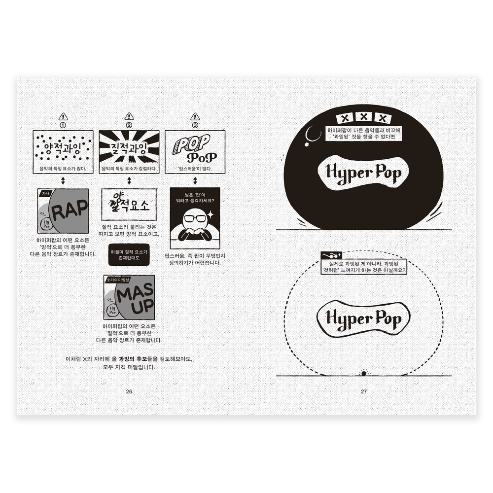 적어도 이 책의 글쓴이 전대한은 실은 '비개념'으로 보이는 여러 가지 것들이, 명료화하고자 하는 눈과 머리와 손을 거치면 '개념'이 될 수 있다고 말합니다. 2020년부터 시도하고 실천해보았고요. 그 결과 그렇게 해낼 수 있는 원리가 있고, 그 원리는 사실상 태도에 가깝다는 사실을 깨달은 것이죠. 그 원리를 이해하고 나면, 아마도 당신 역시 이전처럼 뭉뚱그려서 이야기하거나 진지한 논의는 뒷전으로 미뤄두는 식으로 음악을 감상하는 것이 더는 편하지도 즐겁지도 않아질지도요. 이러한 원리를 박지호라는 그래픽디자이너가 시각화하고, 그렇게 만들어진 형태에 만화가 실키가 옷을 입혔습니다. 더는 비개념으로 보이지 않는 아름다운 음악들을, 청자에서 독자, 독자에서 청자를 오가며 읽어보시기를 바랍니다.
