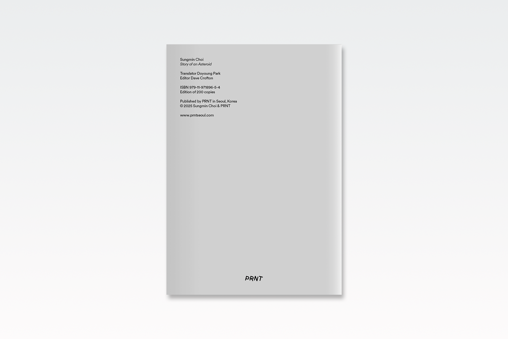 최성민 작가의 단편 『Story of an Asteroid(소행성 이야기)』의 영문판입니다. PRNTpress에서 지속적으로 발간 예정인 Zine 시리즈의 첫번째 작품. 200부 한정.