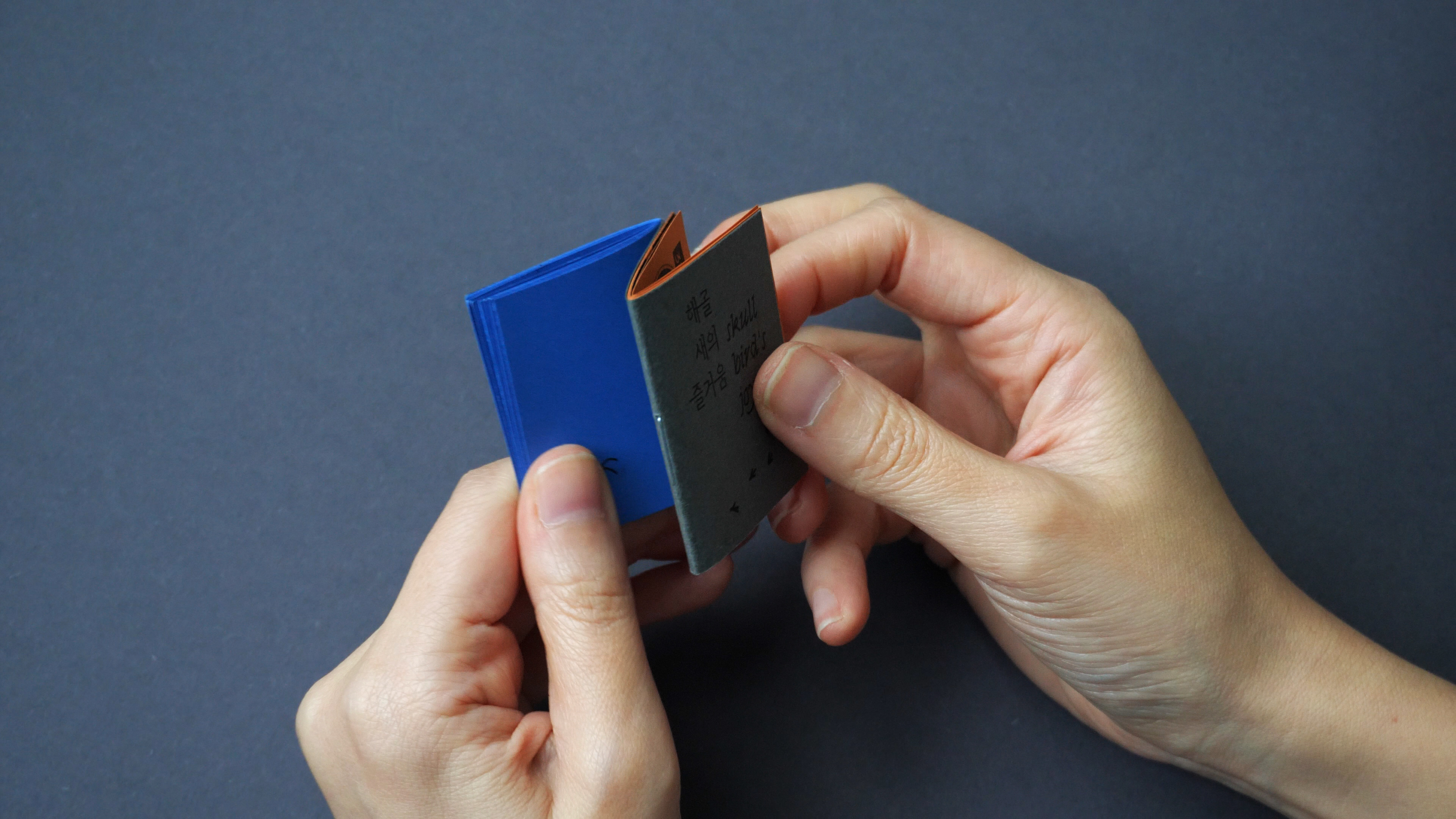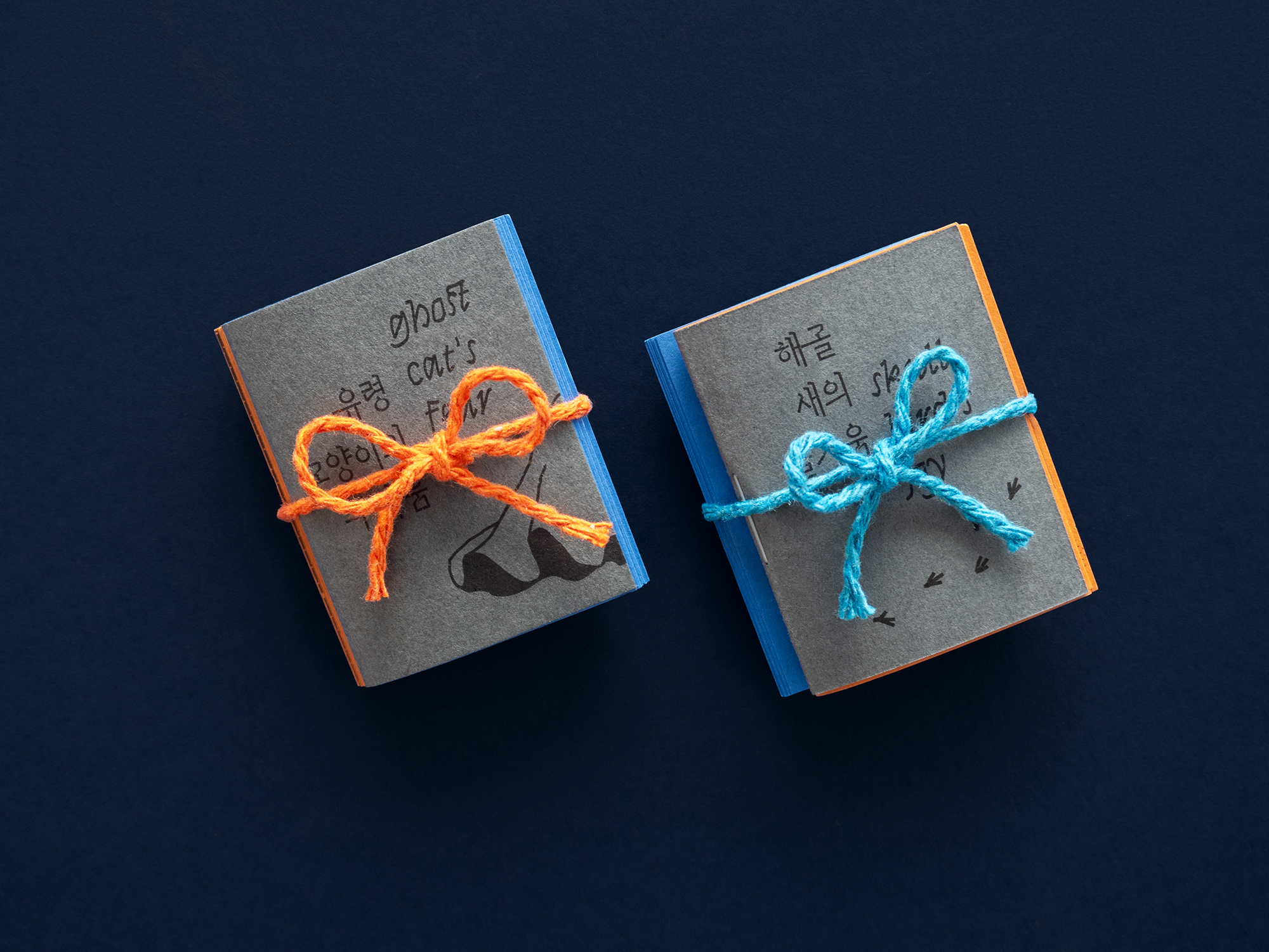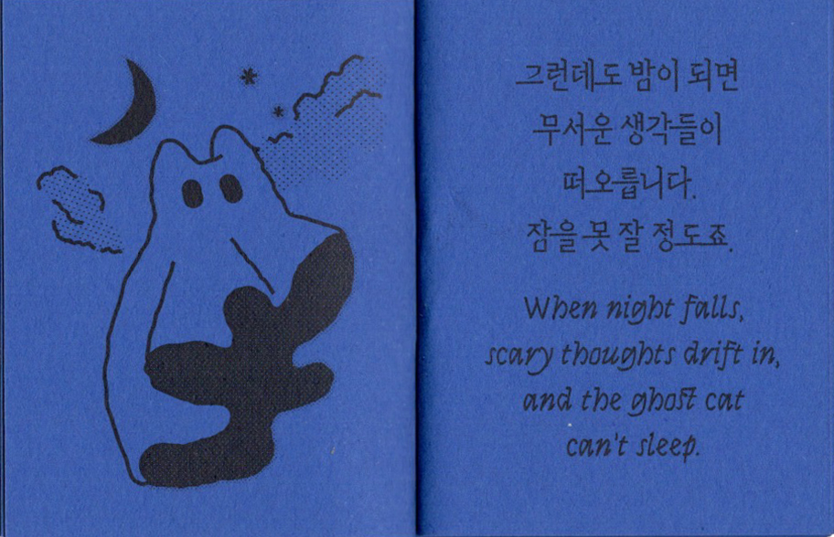 이미 유령이 된 고양이는 무엇을 두려워하고, 뼈밖에 남지 않은 새는 무엇을 즐거워할까요? 손바닥에 쏙 들어가는 작은 책에 조금 으스스하지만 어쩐지 마음이 쓰이는 둘의 이야기를 담았습니다. 두 권의 책이 Z자 형태로 연결되어 있어서 한쪽 면에서는 유령고양이의 이야기를, 반대쪽 면에서는 해골새의 이야기를 읽을 수 있습니다.